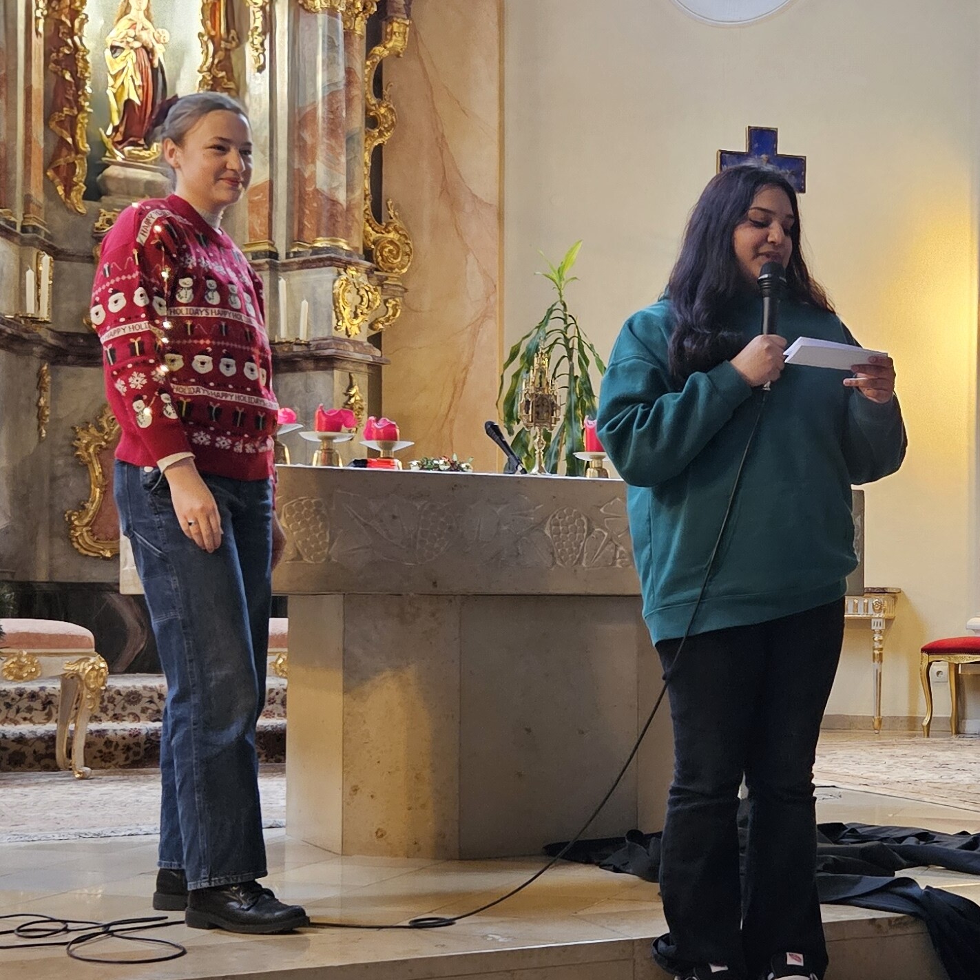 Im evangelischen Gottesdienst am 18.12.2024 zum Thema „Das Licht kommt in die Welt“ trat die Weihnachtsfreude persönlich in Erscheinung. Zuerst spielte Sophia Geineder (Q 12) die Weihnachtsfreude mit großer Begeisterung, doch dann kamen verschiedene Sorgen in die Kirche, so dass die Weihnachtsfreude erst ihre Fröhlichkeit verlor und anschließend fluchtartig die Kirche verließ. Anschließend wurde von Vikarin Dorer und Pfarrer Müller am Ende ihrer kurzen gemeinsamen Predigt über Jesu Geburt an Weihnachten im Stall ein kleines Licht der Hoffnung für die Weihnachtsfreude angezündet. Es erhellte die Dunkelheit und lockte die Weihnachtsfreude nach mehrmaligem Rufen wieder zurück in die Kirche.