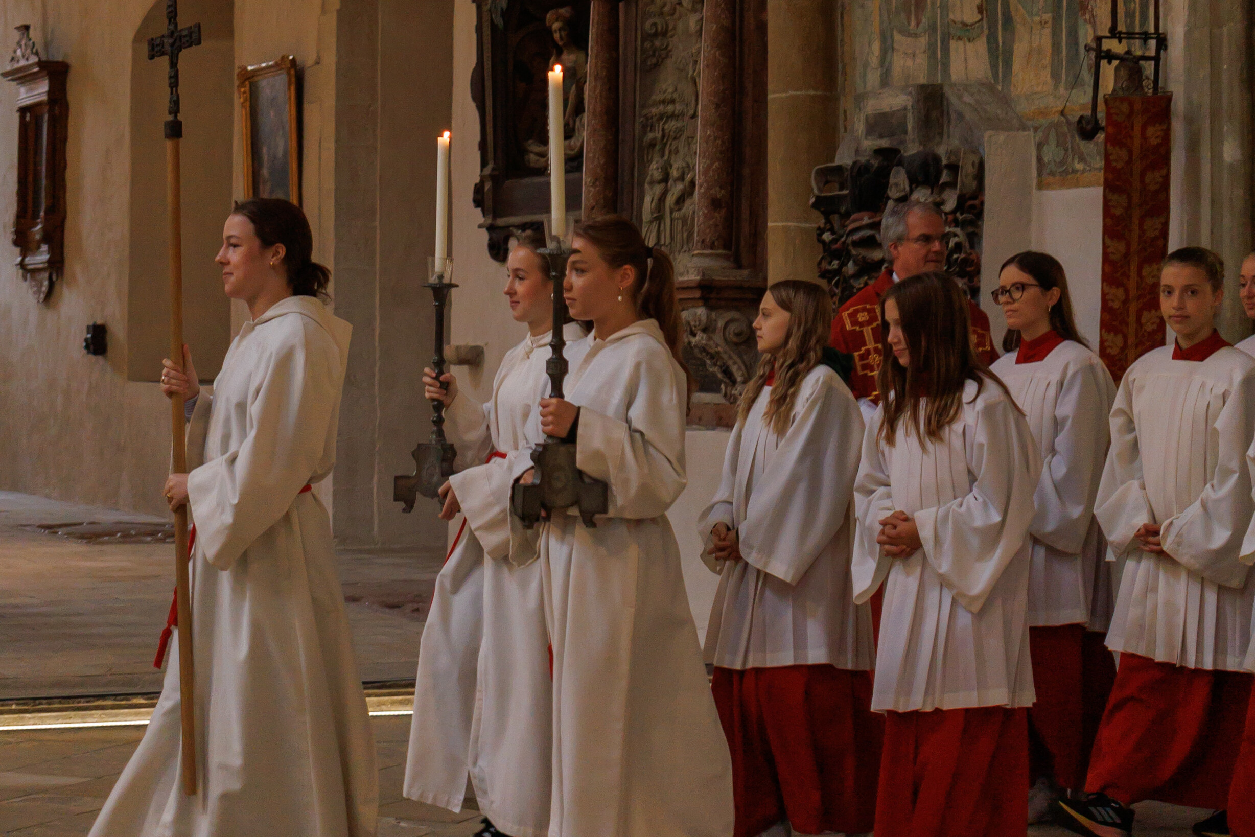 Nach vielen Jahren startete die Schulfamilie der „Englischen“ wieder mit einer Eucharistiefeier in der frisch renovierten Dominikanerkirche. Die mehr als 1000köpfige Gottesdienstgemeinschaft begrüßte dabei den neuen Schulleiter OStD Markus Birner in ihrer Mitte. Symbolisch für die Schülerinnen übergab Domvikar Andreas Albert dem neuen Direktor ein Schatzkästchen mit Goldstücken. Diesen Schatz gelte es in den nächsten Jahren zu hüten, pflegen und mehren! Oberstudiendirektor Birner zeigte sich beeindruckt von der gewaltigen Schulfamilie und versprach sein Bestes! Der Gottesdienst wurde von den Chören der St. Marien-Schulen u.a. mit der Mary-Ward-Messe unter der Leitung von Angelika Wimmer und Maestro Thomas Humbs an der Orgel eindrucksvoll gestaltet. Zahlreiche Ministrantinnen, Leserinnen aus der G 10A, Pfarrer Müller und Schulseelsorger Andreas Albert führten durch die Liturgie zu Ehren der Schutzfrau Maria, der die St. Marien-Schulen vom Jahr 1903 an geweiht sind. Dabei verwies Pfarrer Albert in der Predigt darauf, dass die Dominikanerkirche in Regensburg der ältesten Bildungseinrichtung der Bischofsstadt entspricht. Bereits im 13. Jahrhundert hatte hier der hl. Albertus Magnus als Universalgelehrter seinen Lehrstuhl. Später wurde in dieser Tradition angrenzend das “Alte Gymnasium“ (heute Albertus-Magnus Gymnasium) gegründet, das ursprünglich nur Knaben offen stand. Seit 1916 an unserer Schule das erste Abitur an einer Mädchenschule in Bayern abgelegt wurde, stehen unsere Mädels dem sowohl im Gymnasium als auch in der Realschule in nichts nach. Dabei wurde zu allen Zeiten Maria als Patronin angerufen, unter deren Schutzmantel Regensburgs Lernende und Lehrende gut durch die – nicht immer einfachen – Zeiten gekommen sind. Abschließend überreiche Domvikar Albert dem neuen Schulleiter eine Kopie des Gnadenbildes in der Dominikanerkirche mit dem Wunsch einer guten und erfüllten Zeit an nunmehr „seinen Englischen“!
