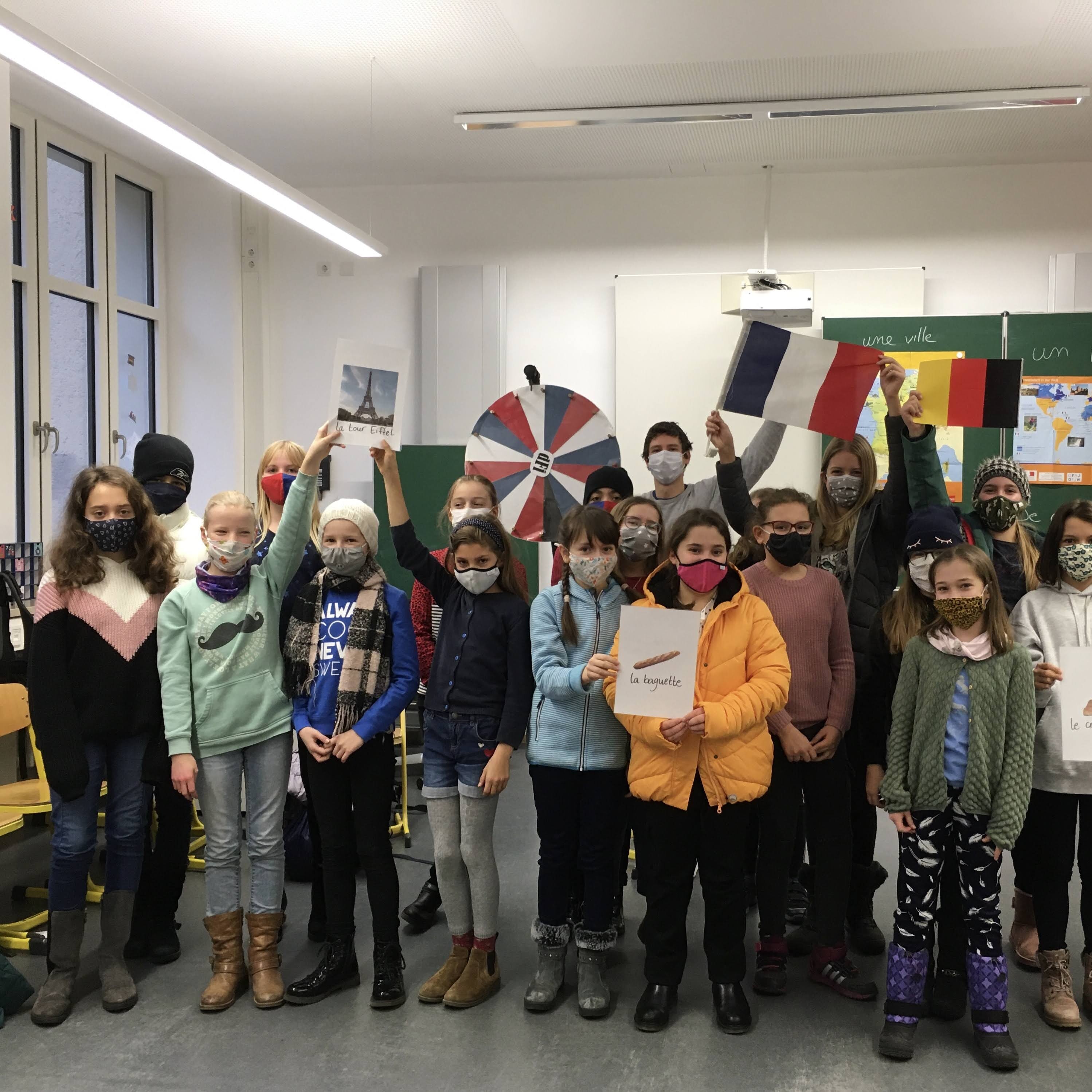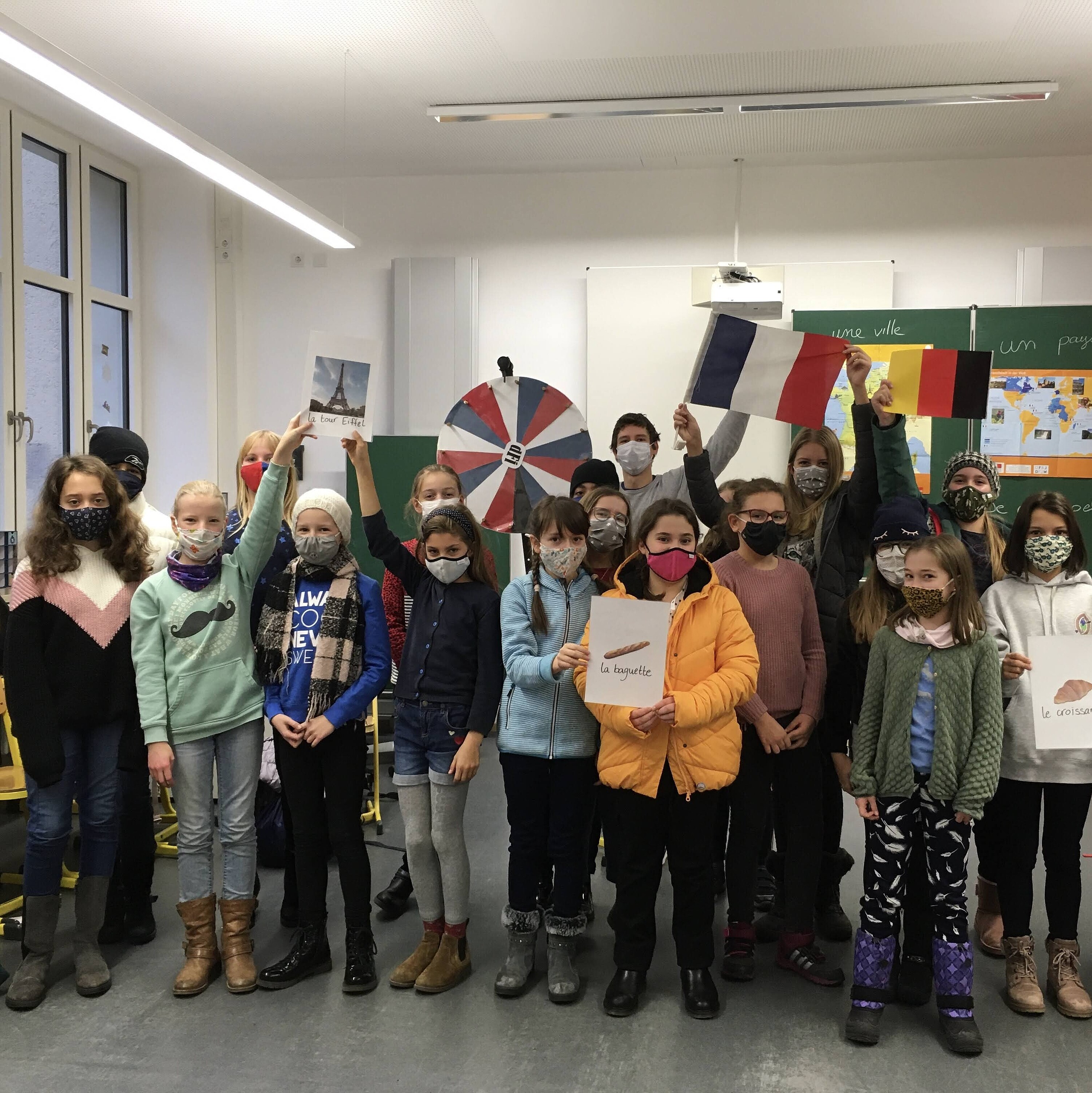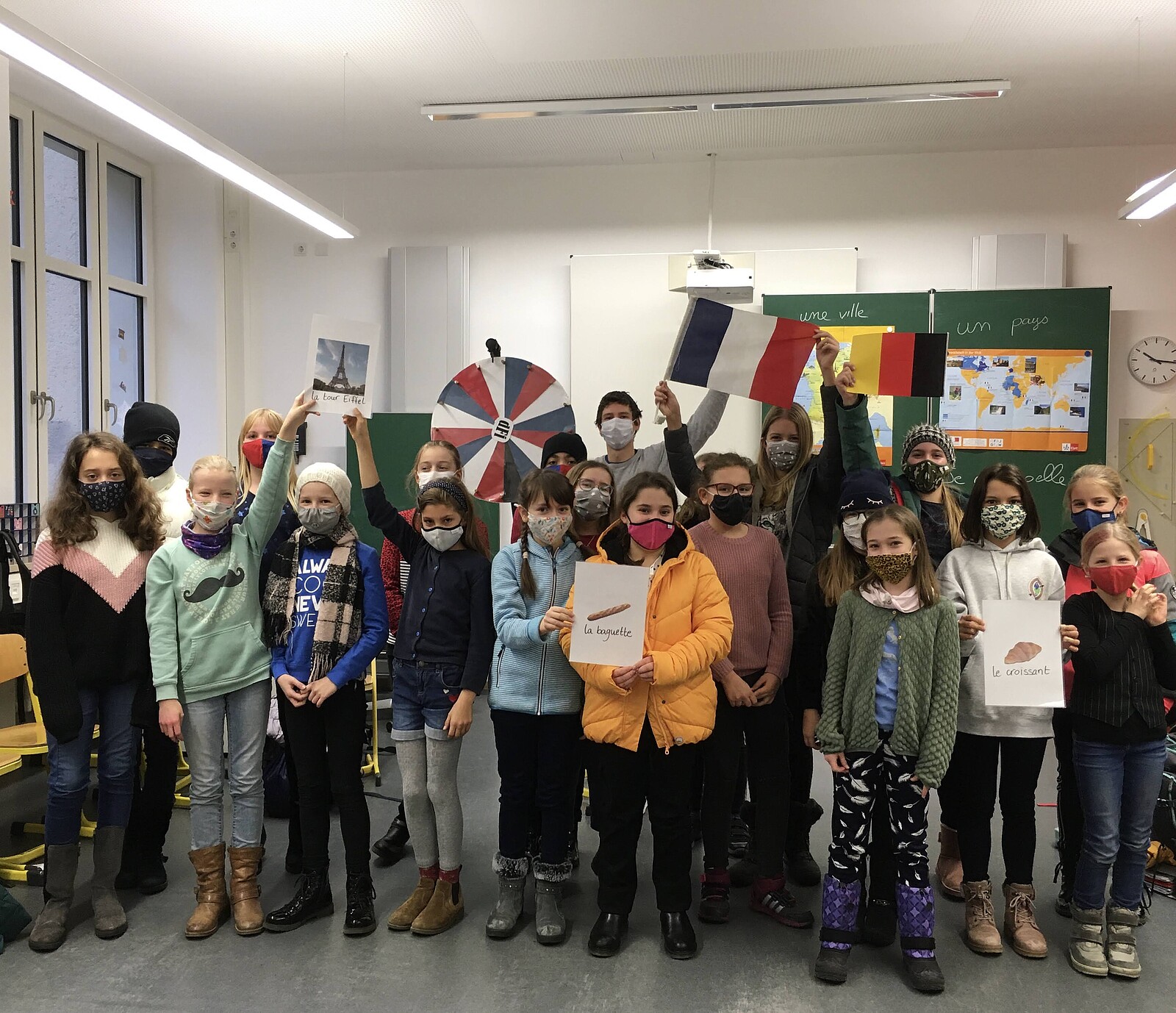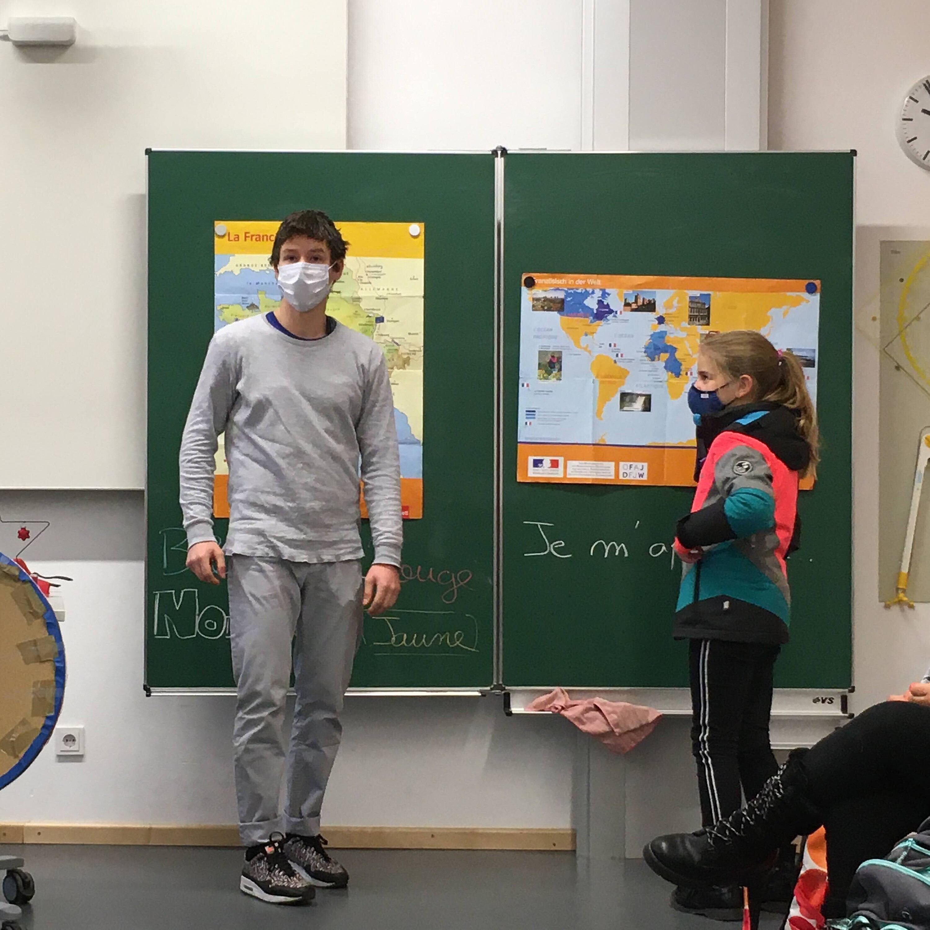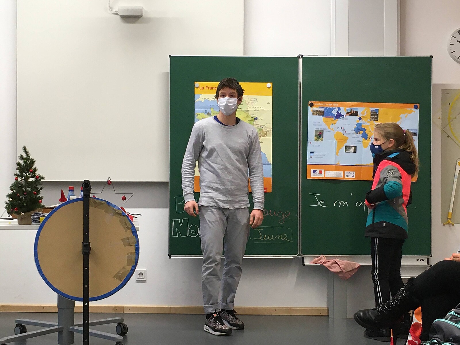 Mit Neugier und Spannung wurde er in diesem Jahr erwartet, der Francemobil-Referent Baptiste Moulac. Der junge Franzose, der aus Rennes, der Hauptstadt der Bretagne, stammt, hatte sich neue Spiele und Aktivitäten ausgedacht, um für die französische Sprache und Kultur zu werben. Wie in den vergangenen Jahren war der Stuhlkreis im Klassenzimmer erlaubt und ausdrücklich gewünscht. Um auf Distanz und Hygiene zu achten, war es Baptiste aber nicht gestattet, den Mädchen einen großen Würfel aus Schaumstoff zuzuwerfen, um sie zum Mitmachen aufzufordern.