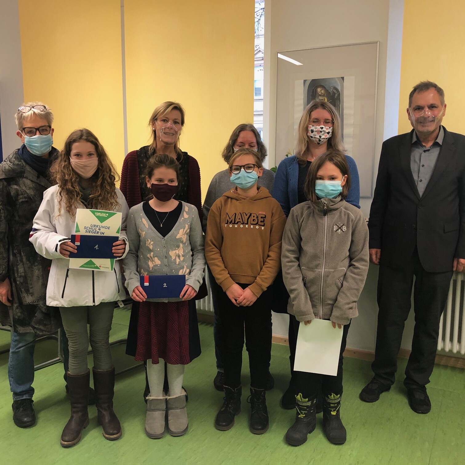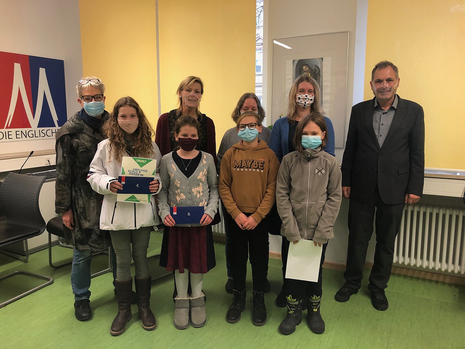 Elina Lippert, G 6D, Schulsiegerin des Vorlesewettbewerbs am Gymnasium, sowie die Klassensiegerinnen der 6. Jahrgangsstufe: