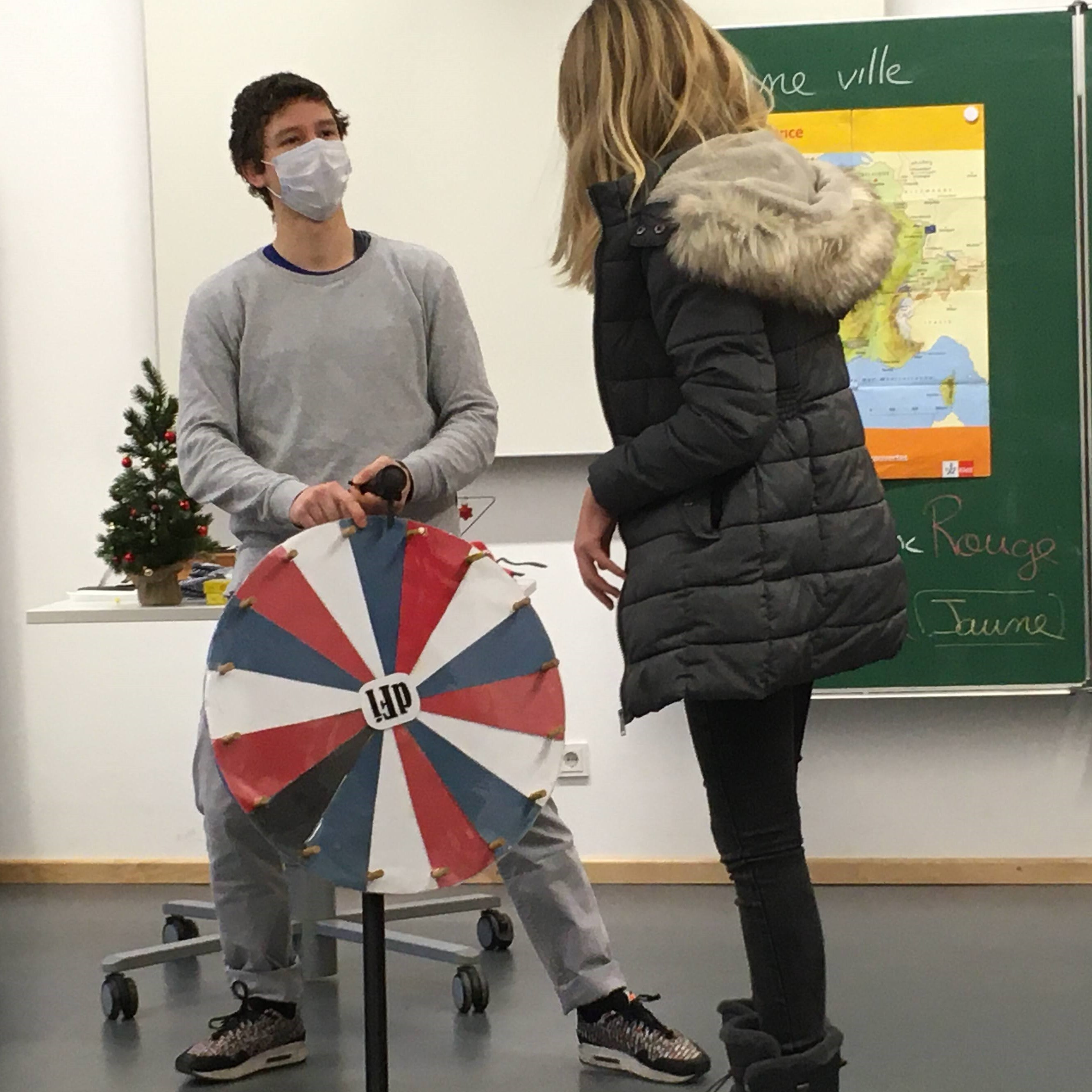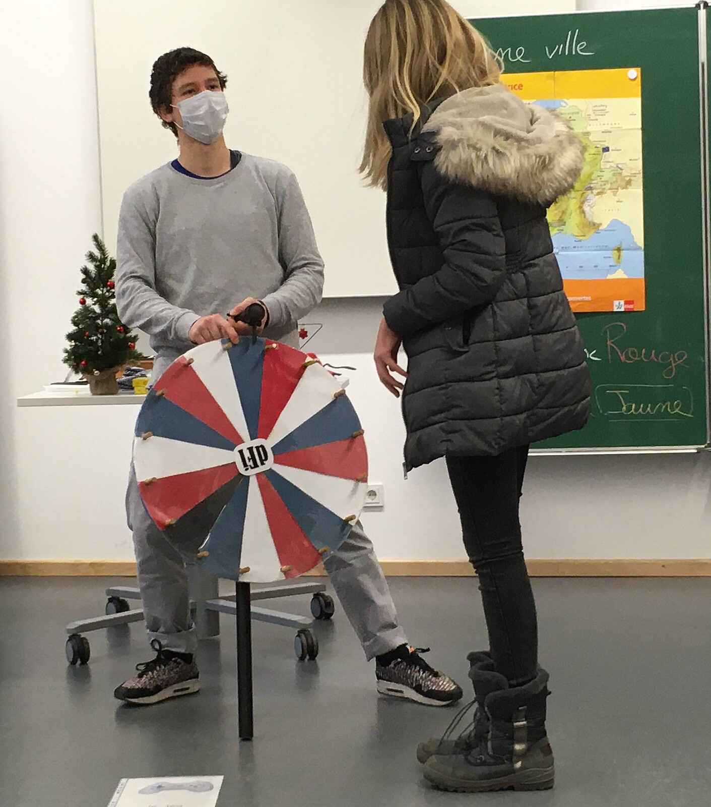 Stattdessen wurde noch stärker auf das Hören und Sprechen sowie auf visuelle Impulse gesetzt. Die Farben der französischen Nationalflagge, der Trikolore, bleu, blanc et rouge (blau, weiß und rot) waren im Nu gelernt. Denn diese wurden in einem Spiel mit einem großen Rad, auf dem es mehrere blaue, weiße und rote Felder, aber nur ein schwarzes Feld gab, benötigt. Baptiste startete das Spiel mit der Aufforderung „Tourne la roue“ (Dreh das Rad). Blieb das Rad bei einem blauen Feld stehen, musste die Kandidatin auf der Weltkarte an der Tafel ein französischsprachiges Land ausmachen, wie zum Beispiel Frankreich, Kanada, Tunesien usw. Blieb das Rad bei einem roten Feld stehen, galt es, französische Städte zu finden; als Hilfestellung diente eine Frankreichkarte an der Tafel. So wurden beispielsweise Lyon, Paris, Marseille und La Rochelle genannt. Bei der Farbe Weiß mussten sich die Schülerinnen ein französisches Wort (Bonjour, merci, chocolat usw.) überlegen. Blieb das Rad bei Schwarz stehen, mussten alle drei Aufgaben auf einmal gelöst werden, d.h., es war ein französischsprachiges Land und eine französische Stadt zu finden und zusätzlich musste die Kandidatin ein französisches Wort wissen.