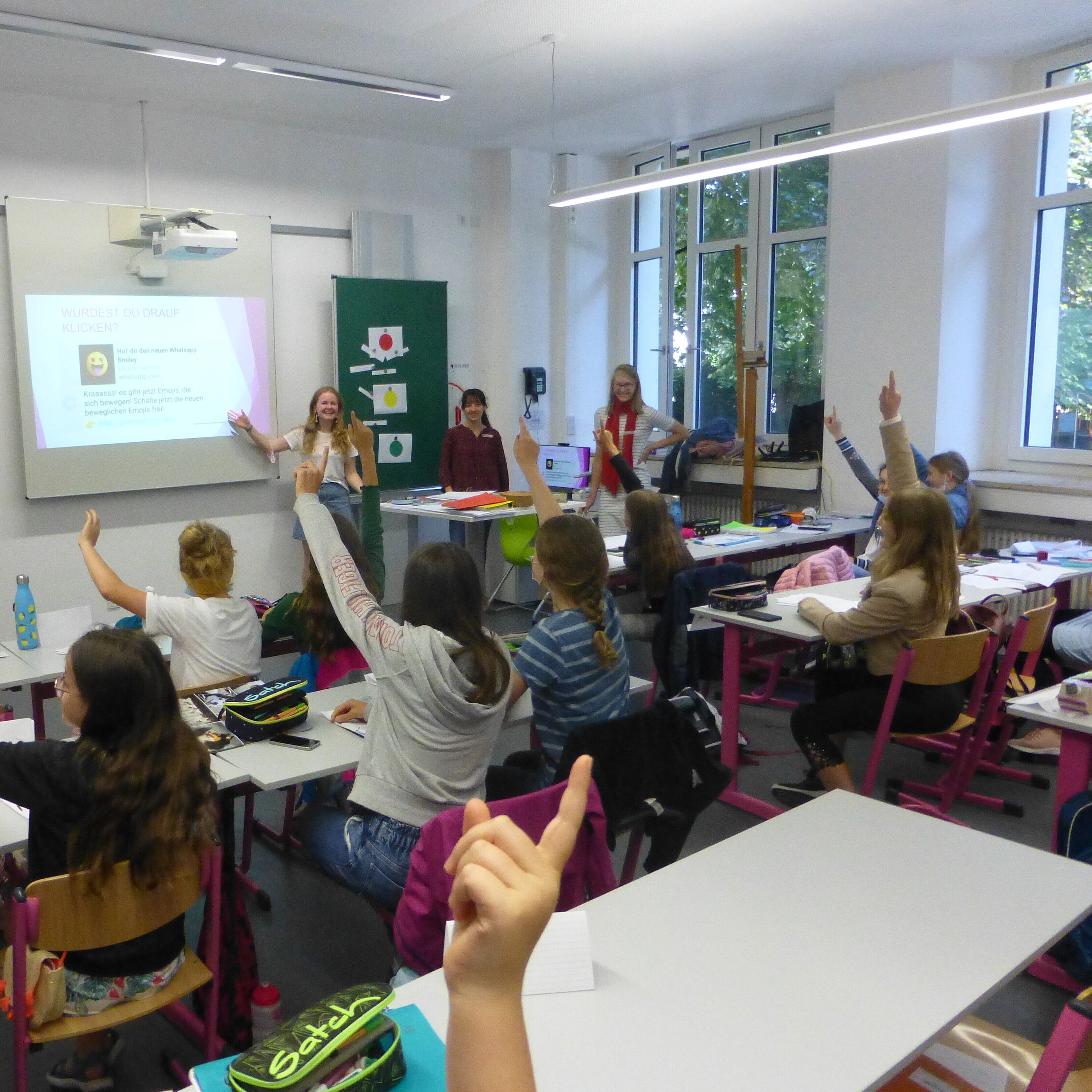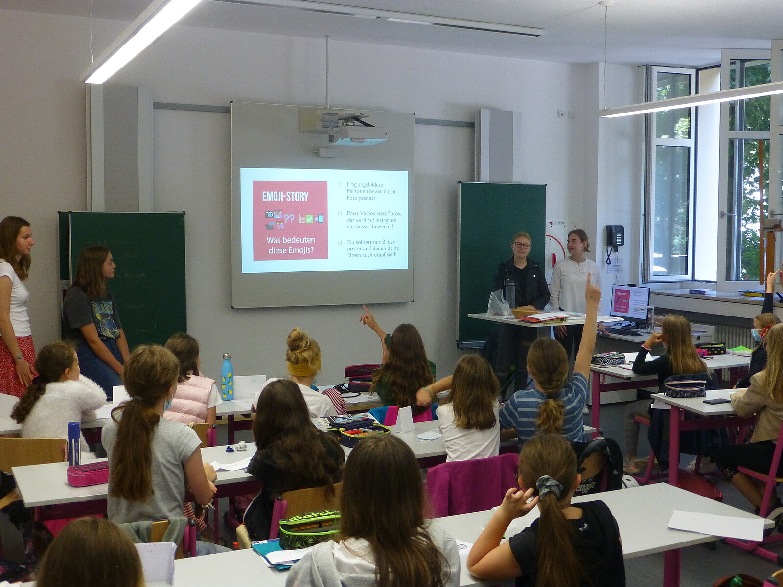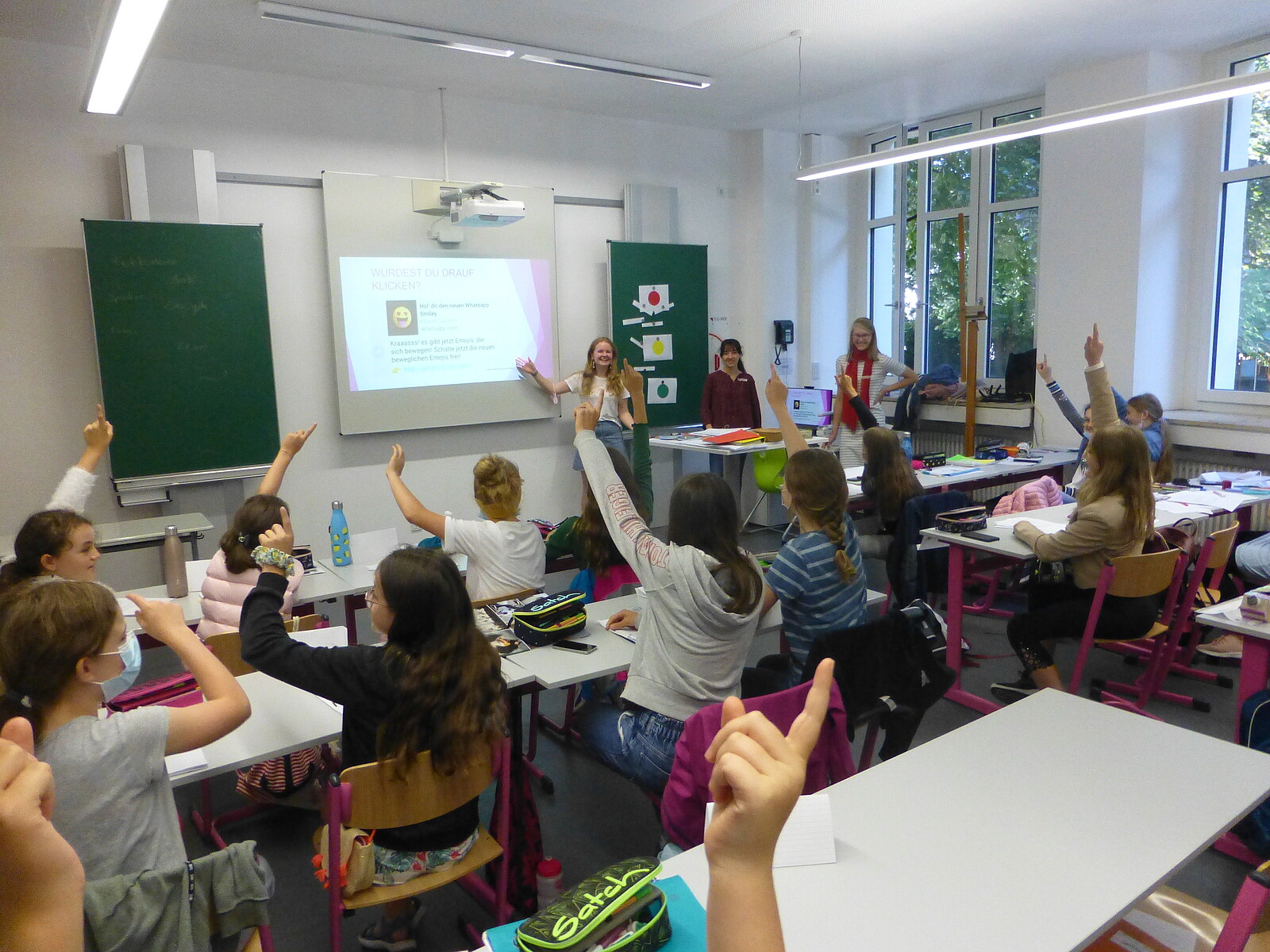 Alle drei Klassen waren schon um 8 Uhr morgens voller Tatendrang und haben unter anderem ihre eigenen Erfahrungen bereitwillig mit uns geteilt. Mit verschiedensten spielerischen Methoden und viel Eigeninitiative unserer Fünftklässlerinnen haben wir das richtige Verhalten im Internet erarbeitet und uns auf mögliche Gefahren vorbereitet. In einer angenehmen Atmosphäre konnte man auch mal zugeben, das Vokabellernen hin und wieder gegen das Computerspielen ausgetauscht zu haben. Unsere motivierten und aufgeweckten Fünftklässlerinnen brachten jederzeit gute und kreative Ideen mit ein, von denen selbst wir als "Lehrerinnen" überrascht waren.