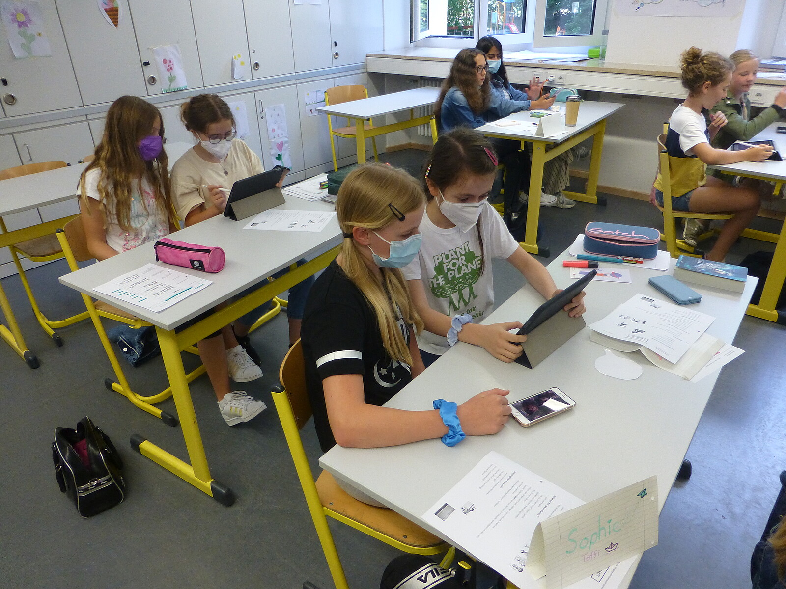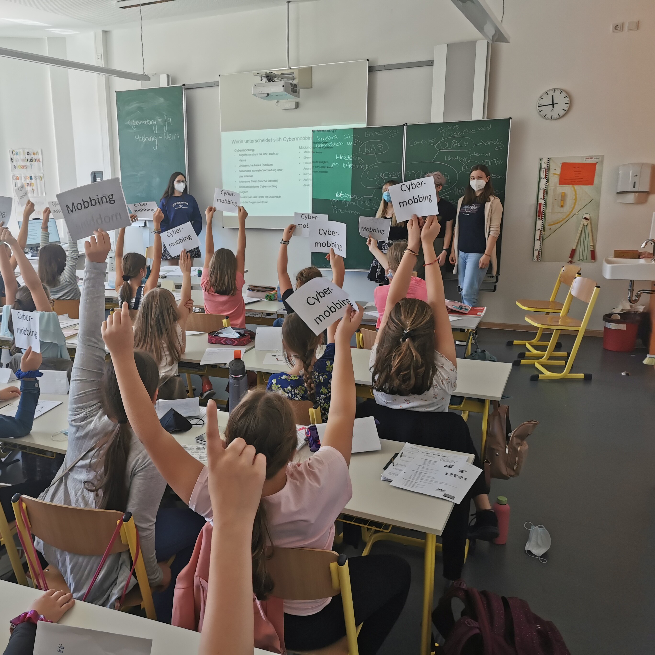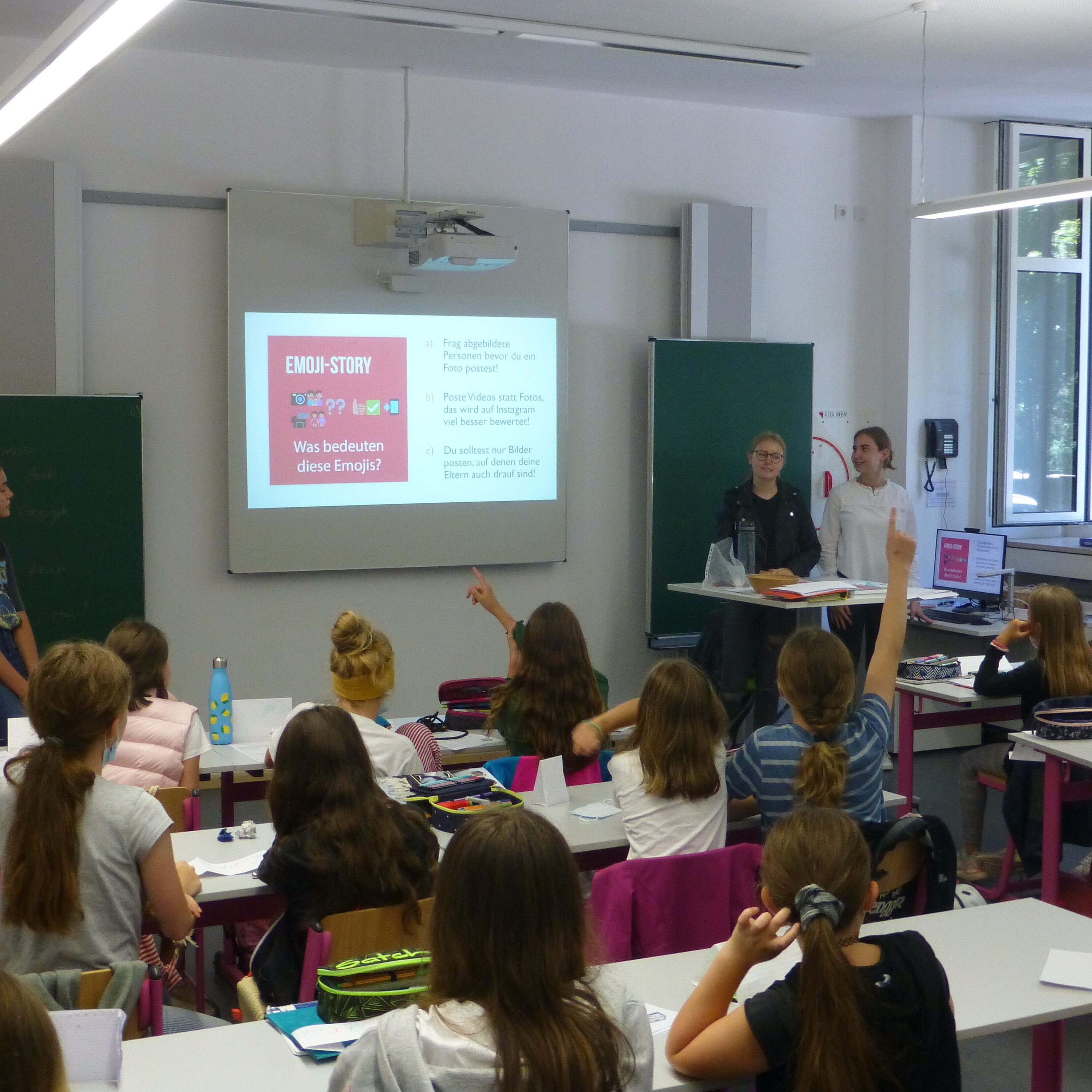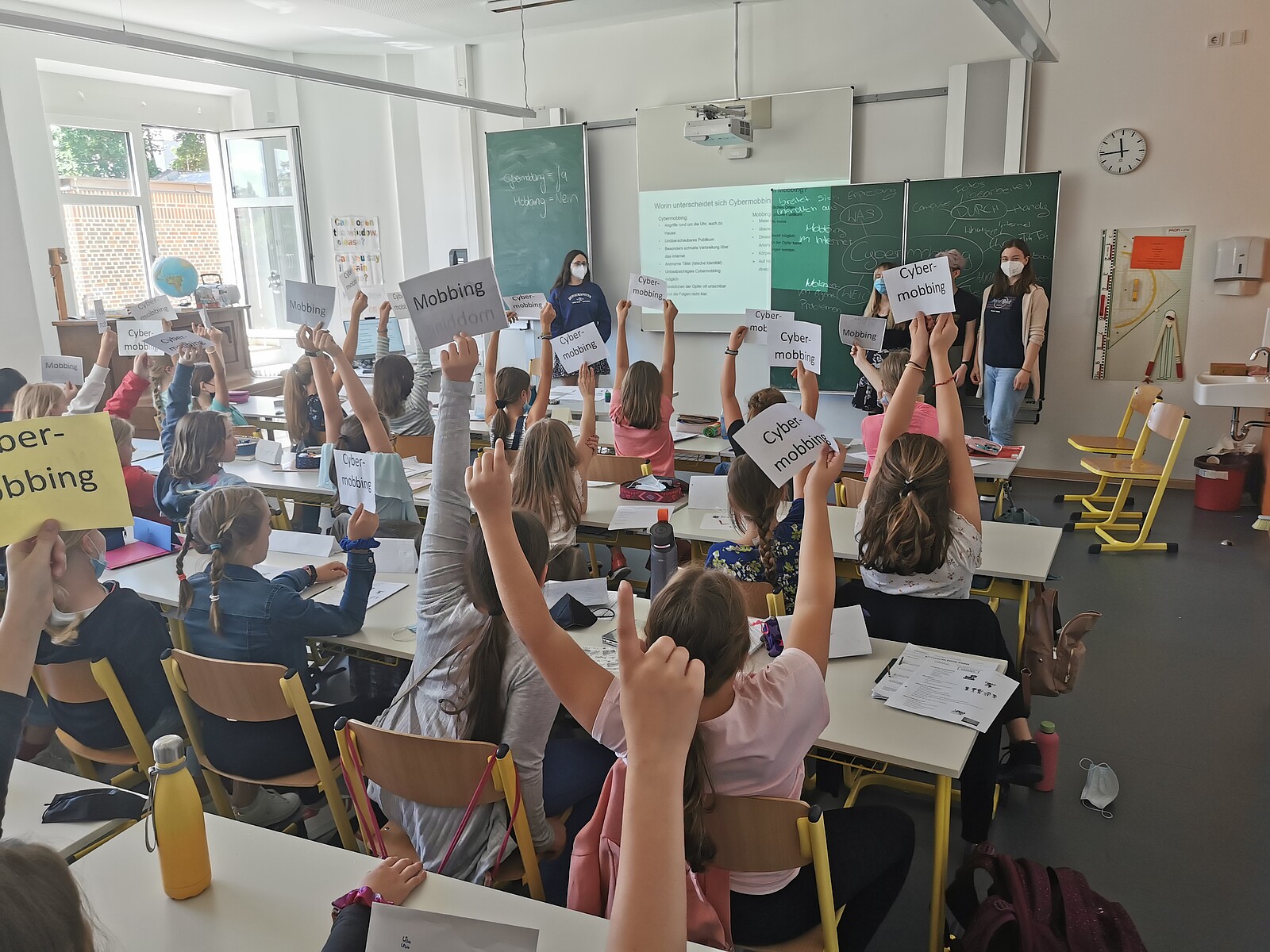 Alle drei Klassen waren schon um 8 Uhr morgens voller Tatendrang und haben unter anderem ihre eigenen Erfahrungen bereitwillig mit uns geteilt. Mit verschiedensten spielerischen Methoden und viel Eigeninitiative unserer Fünftklässlerinnen haben wir das richtige Verhalten im Internet erarbeitet und uns auf mögliche Gefahren vorbereitet. In einer angenehmen Atmosphäre konnte man auch mal zugeben, das Vokabellernen hin und wieder gegen das Computerspielen ausgetauscht zu haben. Unsere motivierten und aufgeweckten Fünftklässlerinnen brachten jederzeit gute und kreative Ideen mit ein, von denen selbst wir als "Lehrerinnen" überrascht waren.