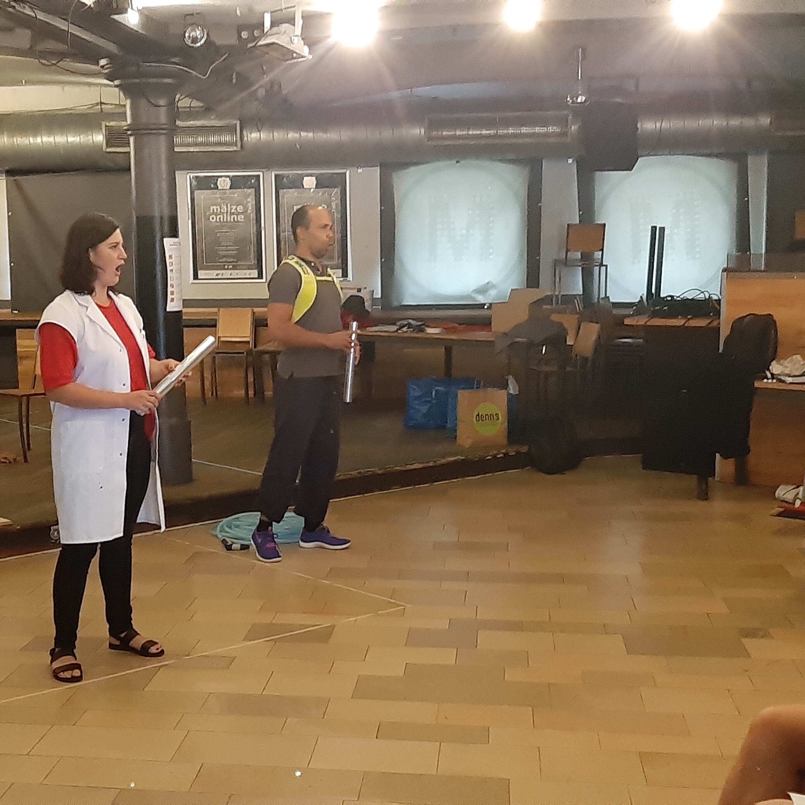 Zwei Szenen wurden während unseres Besuchs geprobt: der Prolog war als Ensemble konzipiert. Die Schülerinnen waren beeindruckt, wie harmonisch die Stimmen der Solisten zusammenklangen bei gleichzeitig so hoher Lautstärke und Textverständlichkeit. In einer zweiten Szene fanden sie sich in einem Streit zwischen Holzmännlein und Holzweiblein wieder. Mit der Mezzosopranistin Eva-Maria Summerer (Holzweiblein) diskutierten sie über die Gründe der Streitigkeiten und die Beziehung zwischen Holzweiblein und Holzmännlein.