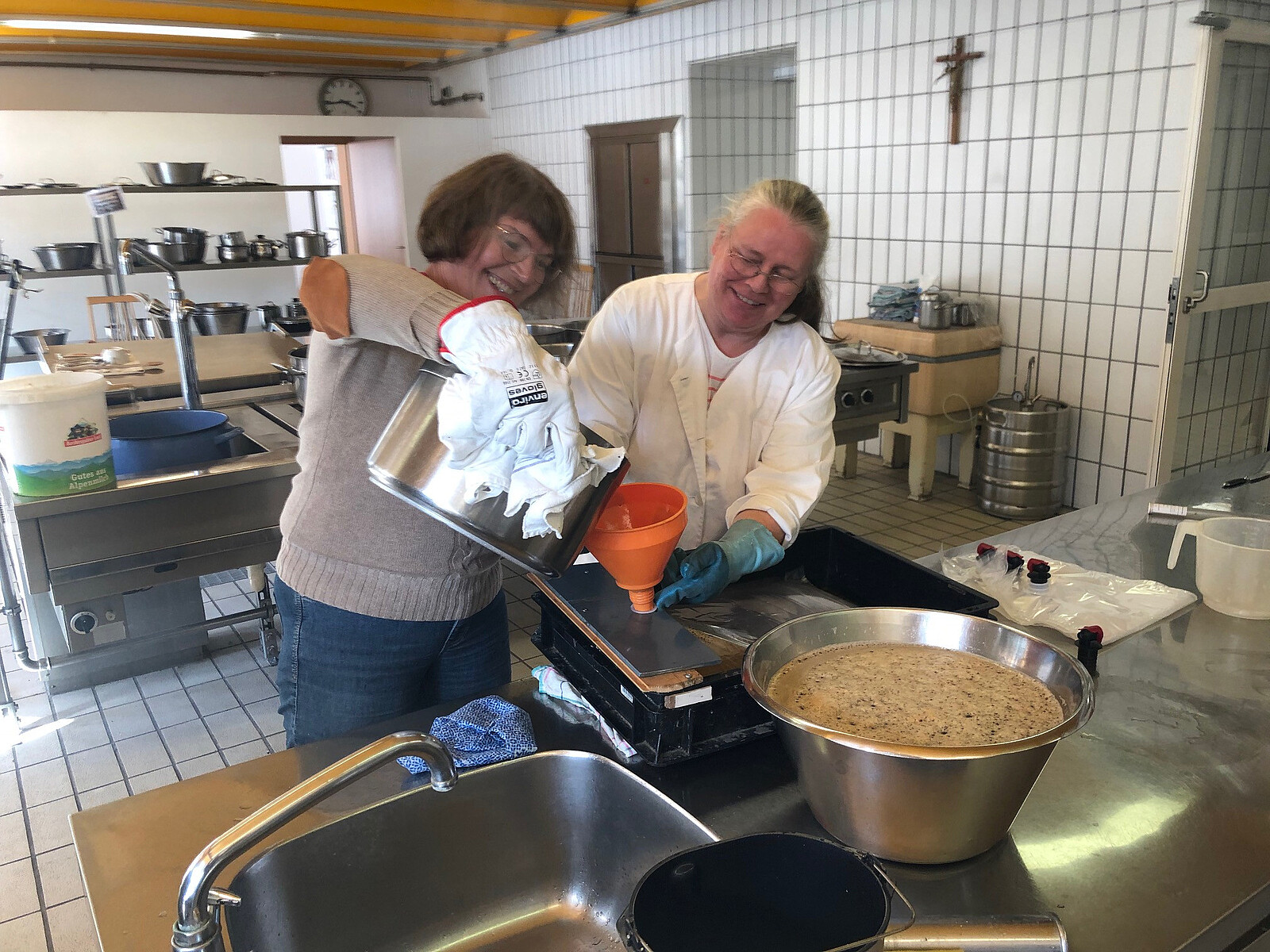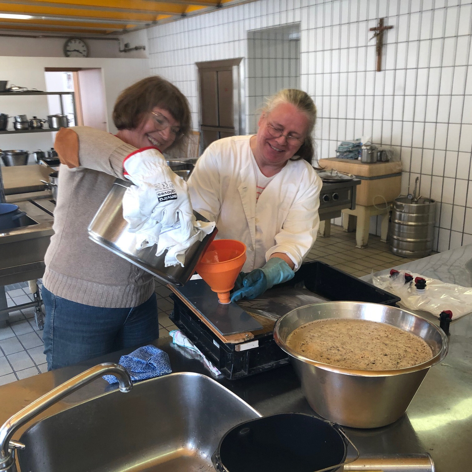 Nach längerer Pause konnte in diesem Jahr wieder eine saftige Apfelernte im Klostergarten eingebracht werden. Es wurden mehr als 120 Liter Apfelsaft gepresst, pasteurisiert und abgefüllt. Daneben konnte natürlich auch wieder fleißig probiert werden.