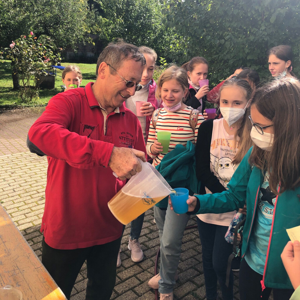 Vielen Dank an den Experimentierclub und das Hausmeisterteam für das Pflücken bzw. Schütteln und Sammeln der Äpfel im Vorfeld. Vielen Dank an Herrn Peschke, Herrn Gabler und Herrn Wirth für die tatkräftige Unterstützung während des Apfelpressens.