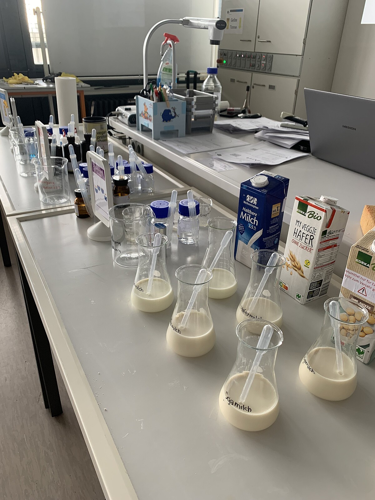 Nach einer kurzen Laboreinführung wurde es ernst. Sicherheit geht vor: Nachdem wir unsere Schutzkleidung angelegt hatten, starteten wir mit den Experimenten. Wir untersuchten verschiedene Milchsorten und Milchersatzprodukte (wie Hafer-, Mandel- oder Sojadrink) auf ihre chemischen Bestandteile: