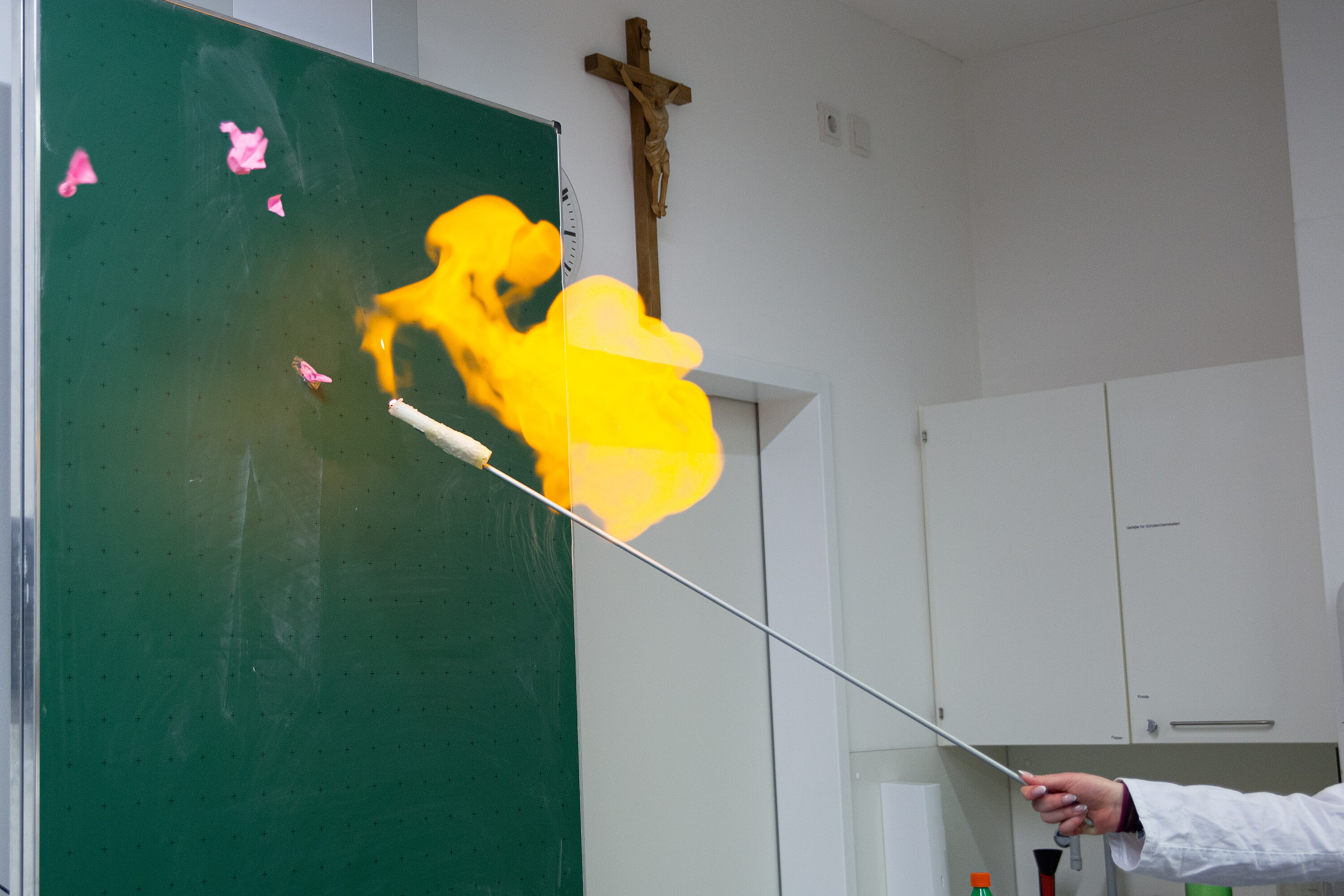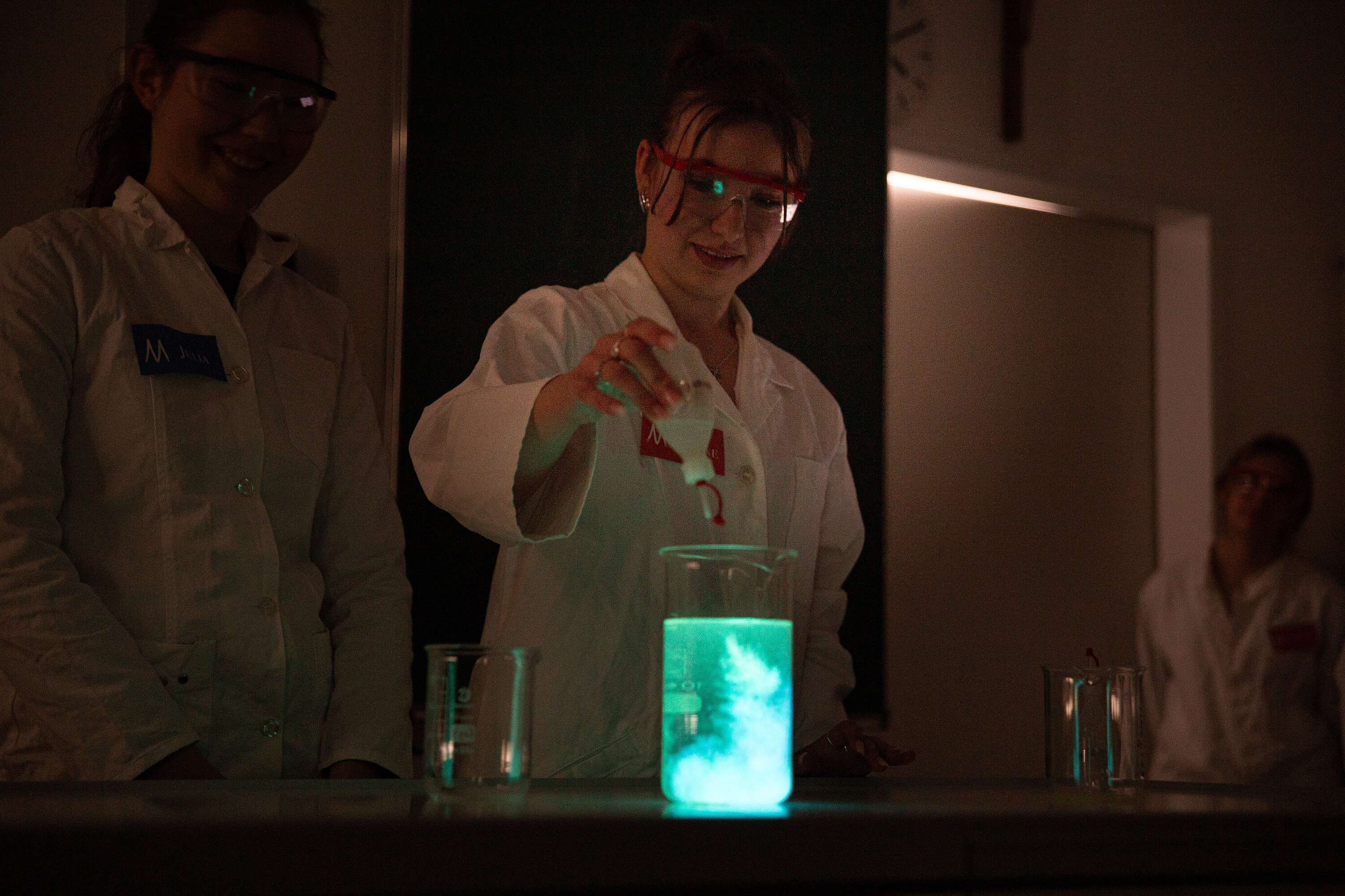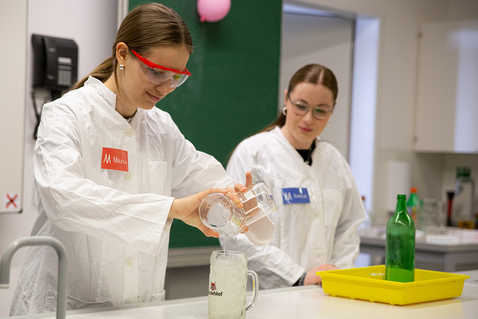 Eingebettet in eine kleine Rahmengeschichte präsentierten sie eine Reihe faszinierender Versuche: Ein Wasserstoffballon explodierte mit lautem Knall, Flüssigkeiten wechselten scheinbar wie von Zauberhand ihre Farbe, geheimnisvolle Schriften wurden sichtbar gemacht und sogar ein „Flaschengeist“ wurde heraufbeschworen. Auch ein „chemisches Bier“, das innerhalb weniger Sekunden hergestellt wurde, darf in Bayern natürlich nicht fehlen. Besonders beeindruckend waren auch Effekte wie leuchtende Flüssigkeiten oder brennender, durch die Luft wirbelnder Schaum.