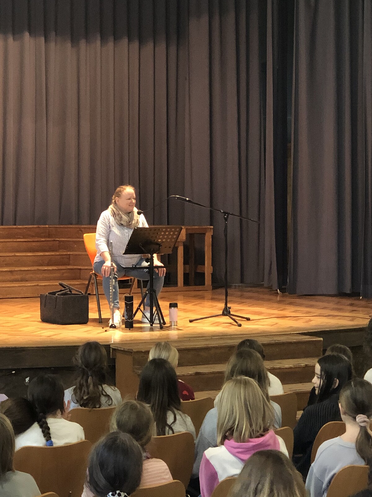 Am 8. April 2025 begeisterte Heike Teubl die Schülerinnen der 5. Klassen mit einer außergewöhnlichen Lesung. Die Musikpädagogin, die in München Operngesang studiert hatte und über ihre beiden Söhne die Begeisterung für das Vorlesen entdeckt hatte, stellte sich zunächst persönlich vor.