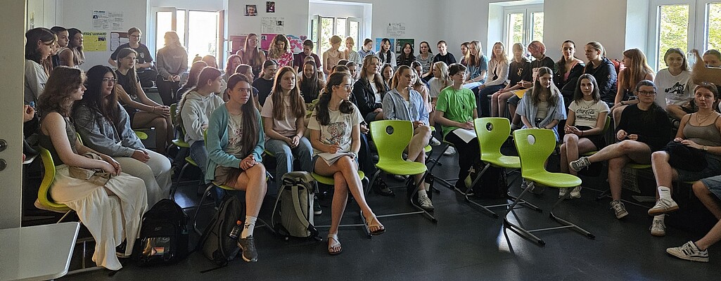 Am 17. März 2025 fand für die 10. Klassen des Gymnasiums und der Realschule eine Lesung mit der Regensburger Theaterpädagogin und Jugendbuchautorin Agnes Gerstenberg statt. Im Festsaal stellte sie den Schülerinnen ihren Debütroman „Unberührt“ vor.