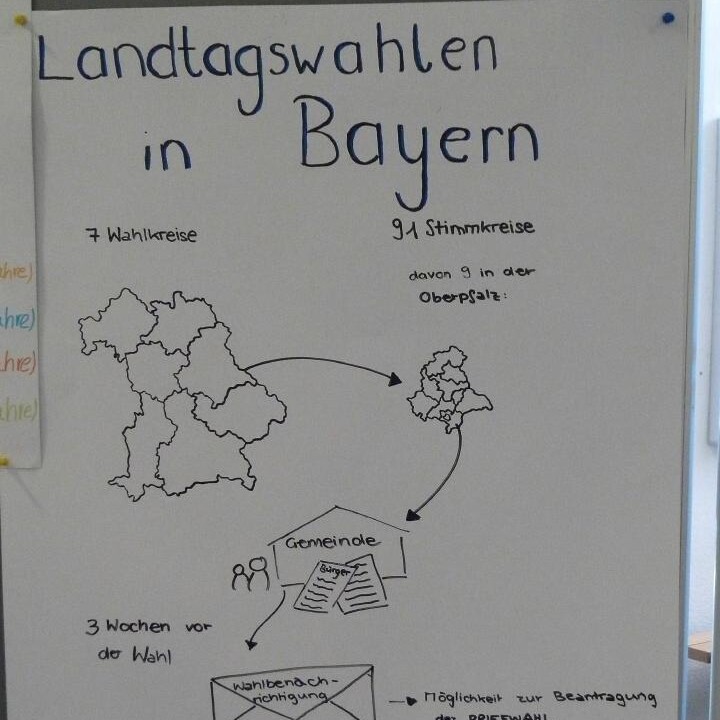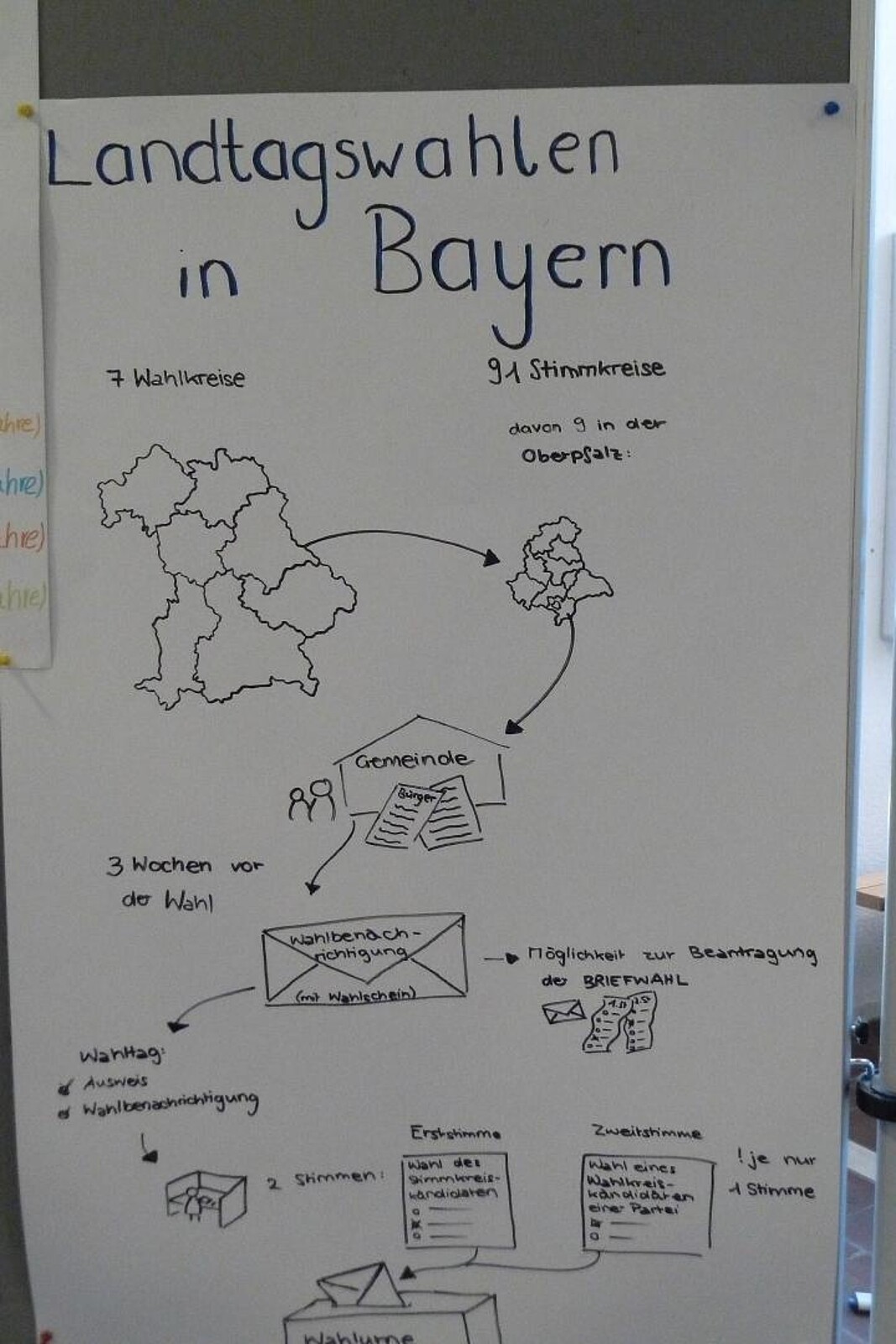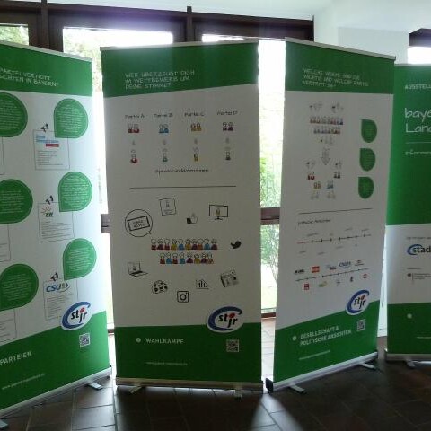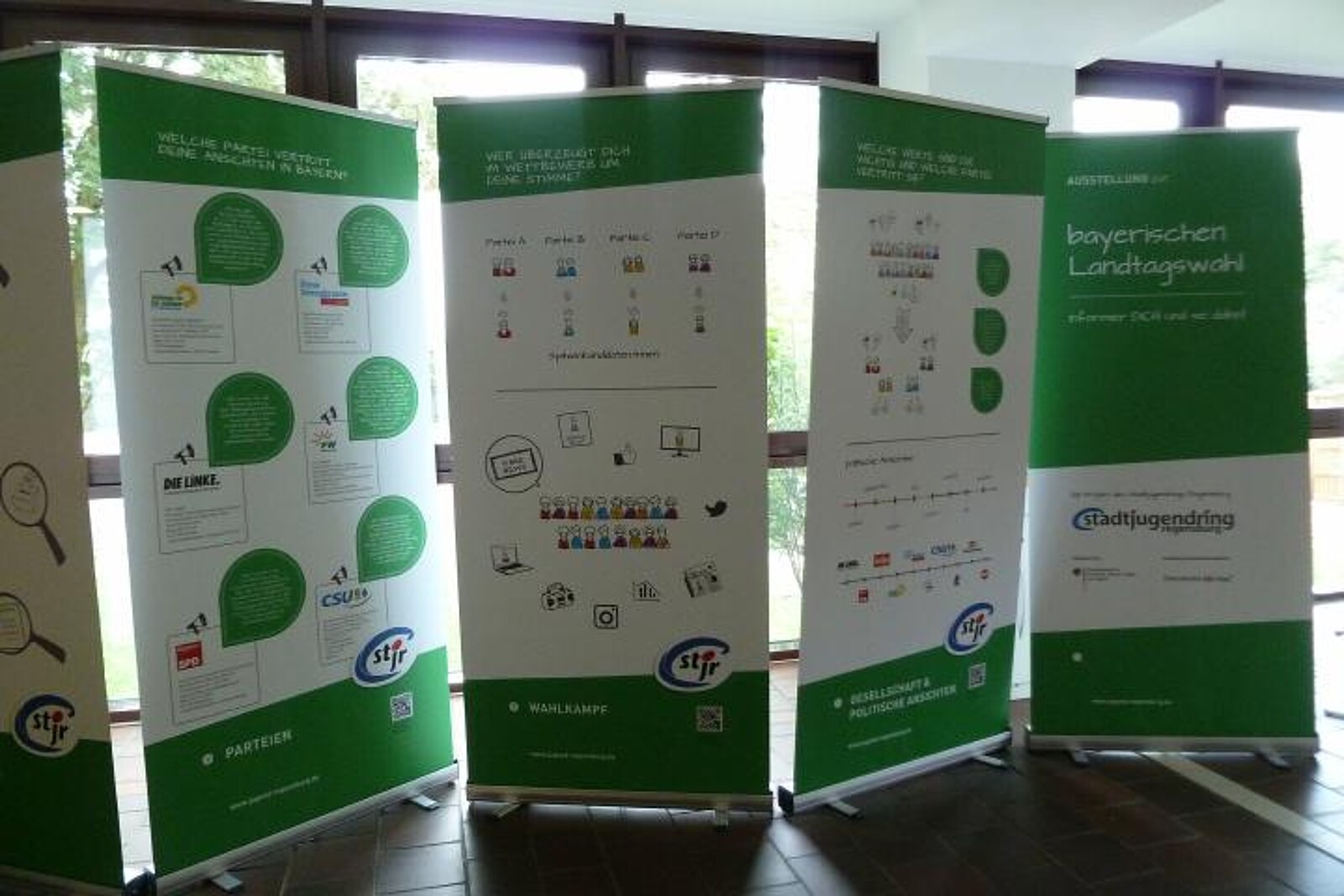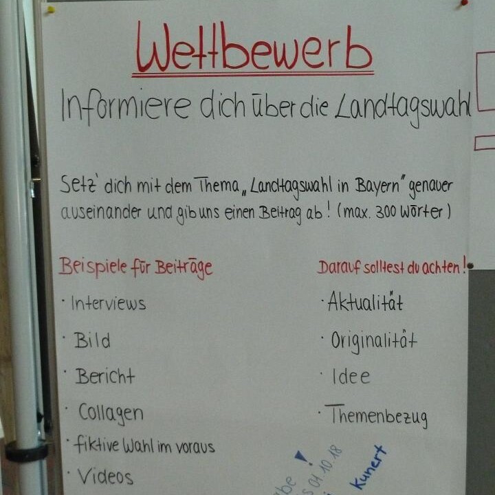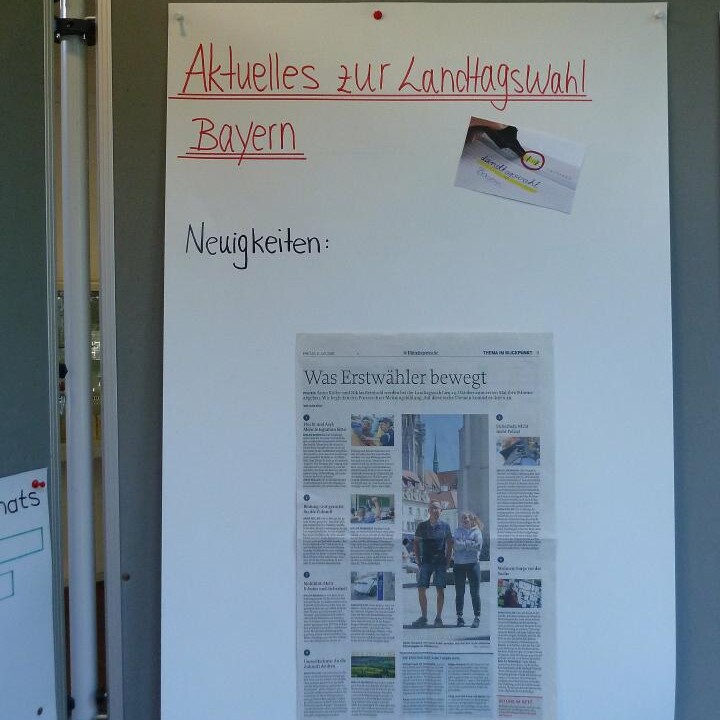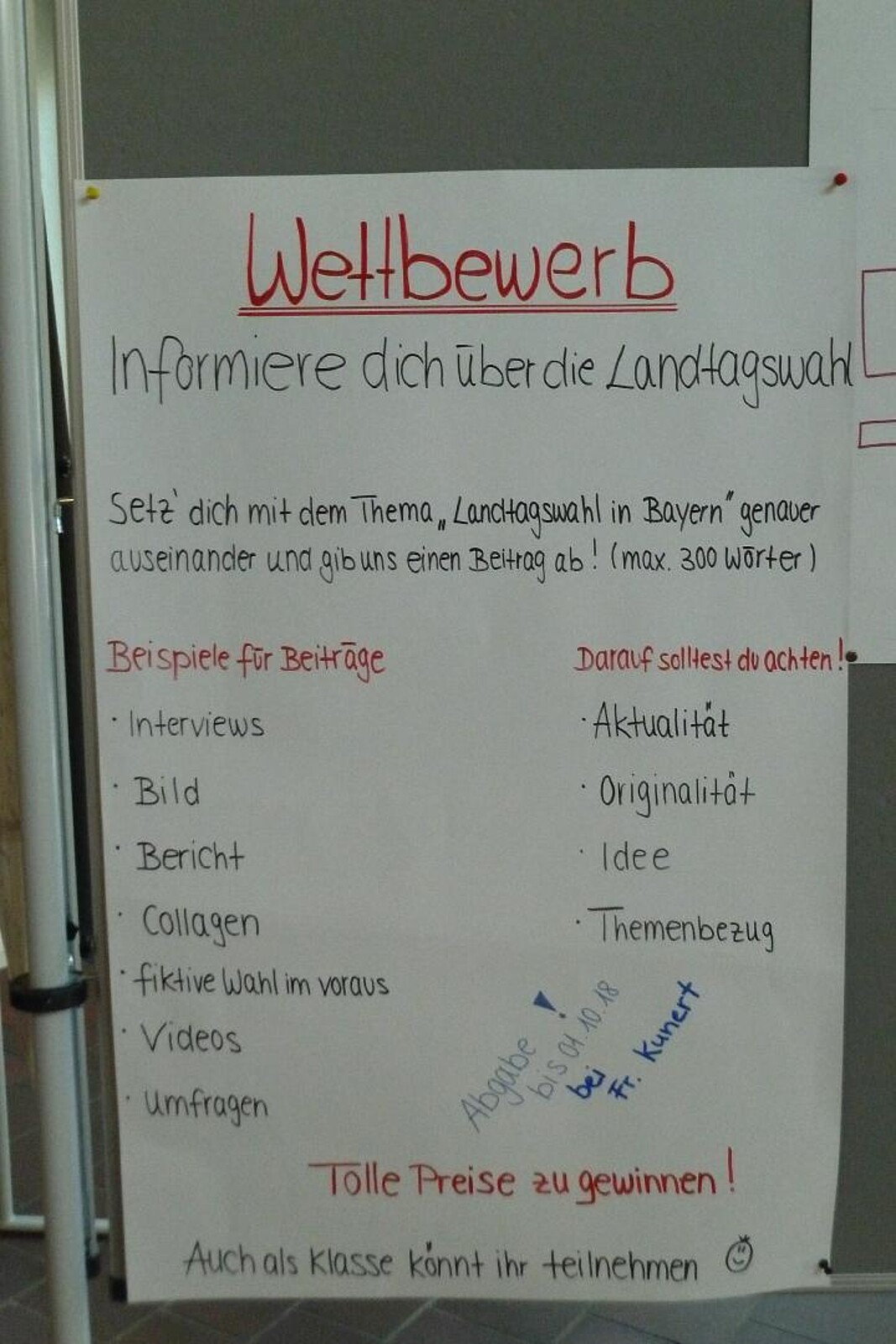 Zwei Ausstellungen informierten in der Pausenhalle über die Landtagswahl in Bayern. Die erste Ausstellung gestaltete der Sk-Kurs von Frau Kunert. Stets wurden aktuelle Zeitungsartikel ausgehängt, um die Mitschülerinnen auf den neuesten Stand zu bringen. Eine Wanderausstellung des Stadtjugendrings, die eine Woche in der Pausenhalle gezeigt wurde, ergänzte die selbst gestalteten Plakate der Q 12.