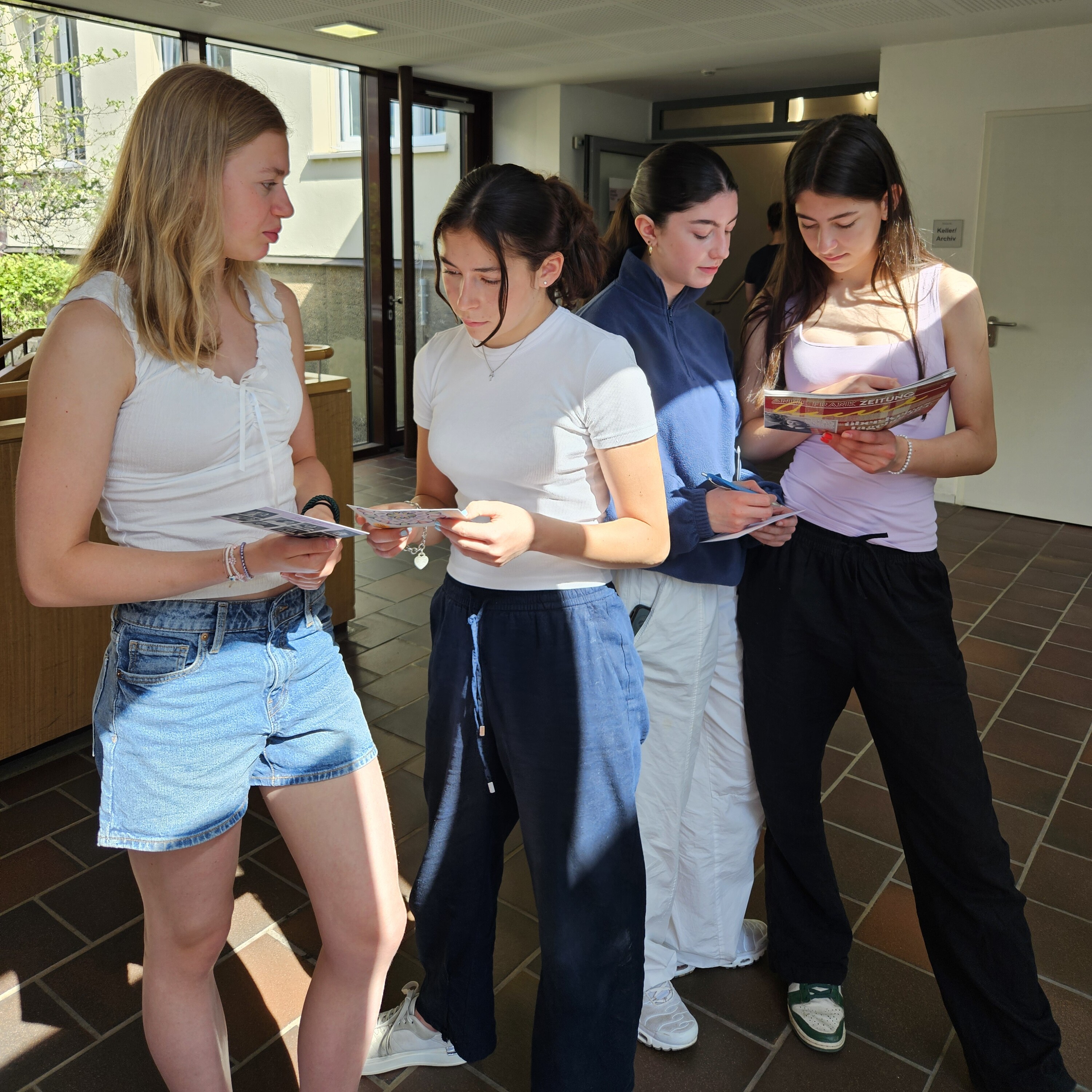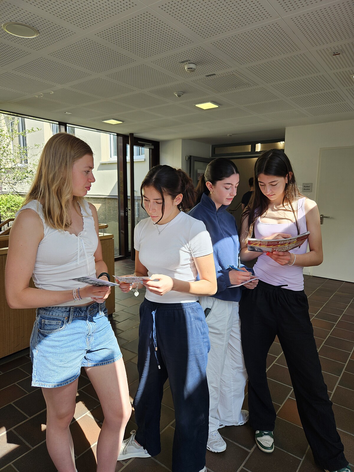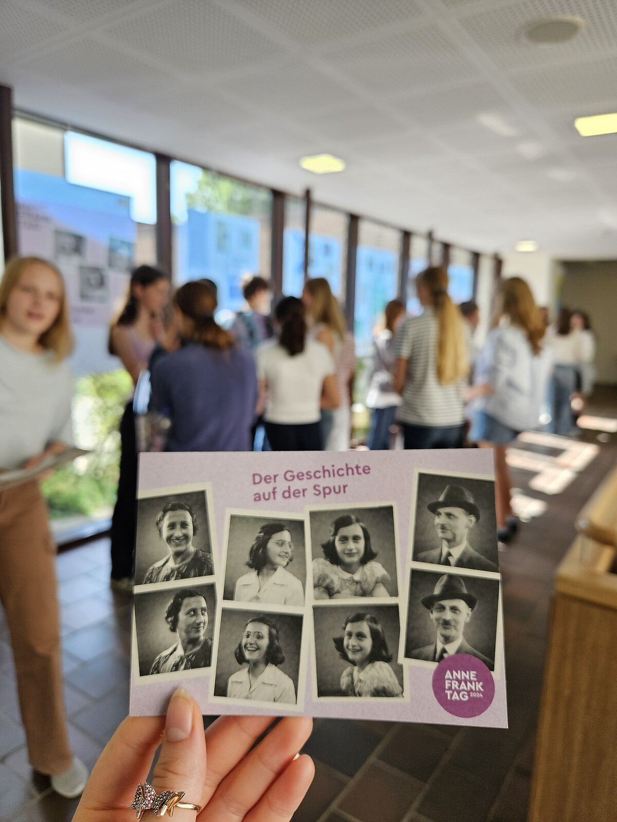 Das Anne-Frank-Zentrum Berlin feiert 2024 sein 30-jähriges Bestehen. Schon zum 2. Mal beteiligt sich unsere Schule am Anne-Frank-Tag, der in diesem Jahr unter dem Motto „Der Geschichte auf der Spur“ steht. Das Anne-Frank-Zentrum stellt verschiedenste Materialien zur Verfügung. Als Ergänzung zur Anne-Frank-Poster-Ausstellung liegen Karten und Zeitschriften sowie Bücher zu Anne Frank aus. Ein Karten sowie die Anne-Frank-Zeitung laden zum Mitmachen und Mitdenken ein, denn alle Schülerinnen können sich gemeinsam auf Spurensuche begeben. Weitere Projekte einzelner Klassen zu den Themen „Judentum in Regensburg“ sowie zum „Tagebuch der Anne Frank“ werden bis zu den Sommerferien durchgeführt.