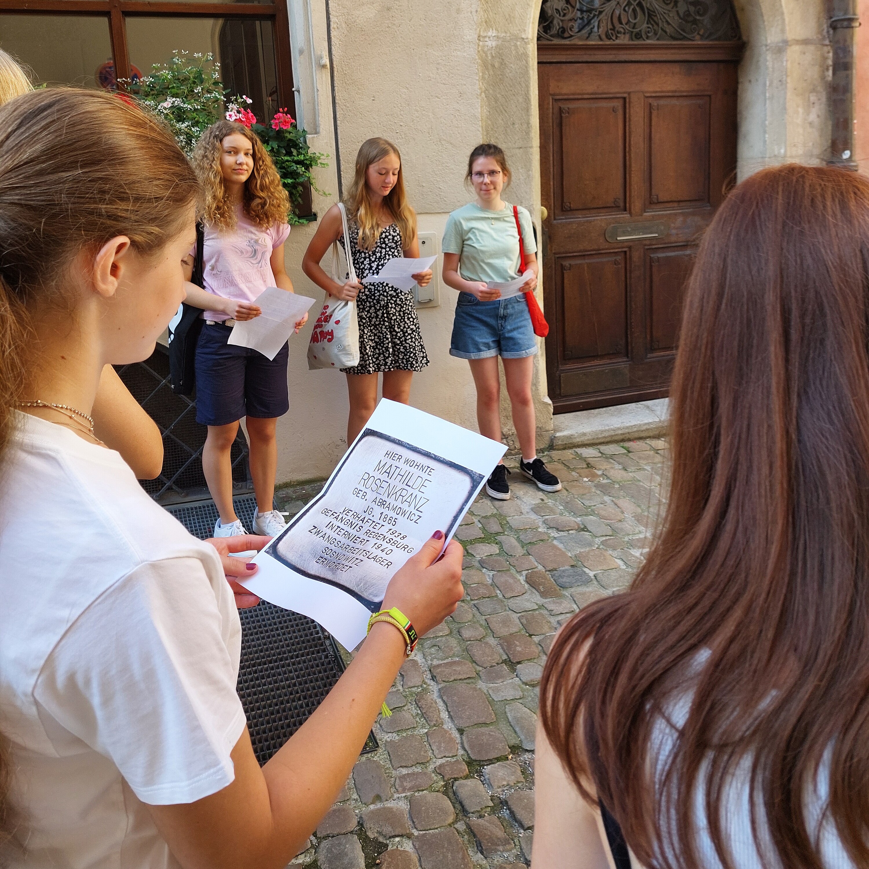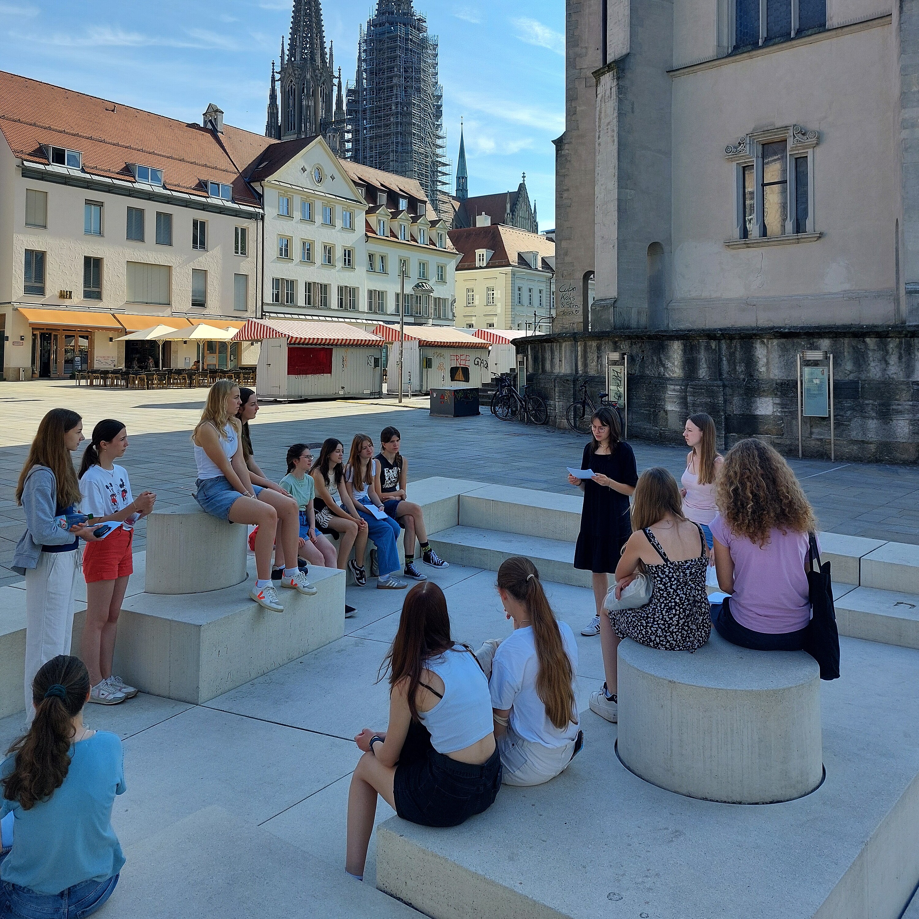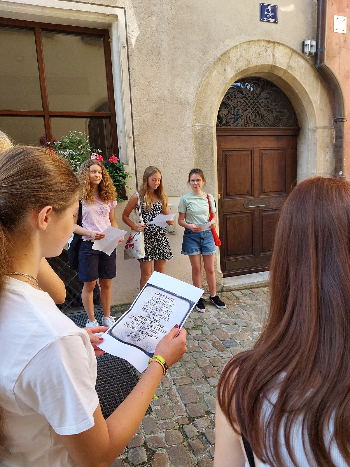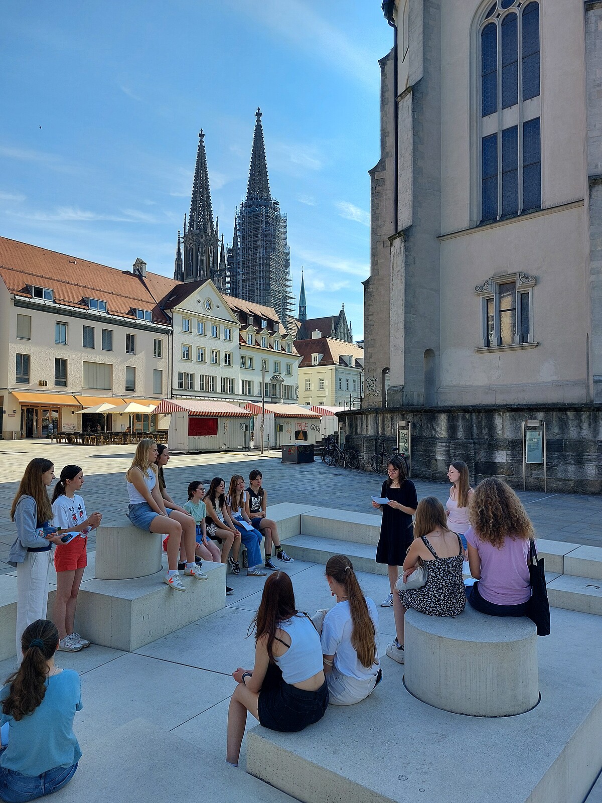 Das Anne-Frank-Zentrum Berlin feiert 2024 sein 30-jähriges Bestehen. Schon zum 2. Mal beteiligt sich unsere Schule am Anne-Frank-Tag, der in diesem Jahr unter dem Motto „Der Geschichte auf der Spur“ steht. Das Anne-Frank-Zentrum stellt verschiedenste Materialien zur Verfügung. Als Ergänzung zur Anne-Frank-Poster-Ausstellung liegen Karten und Zeitschriften sowie Bücher zu Anne Frank aus. Ein Karten sowie die Anne-Frank-Zeitung laden zum Mitmachen und Mitdenken ein, denn alle Schülerinnen können sich gemeinsam auf Spurensuche begeben. Weitere Projekte einzelner Klassen zu den Themen „Judentum in Regensburg“ sowie zum „Tagebuch der Anne Frank“ werden bis zu den Sommerferien durchgeführt.