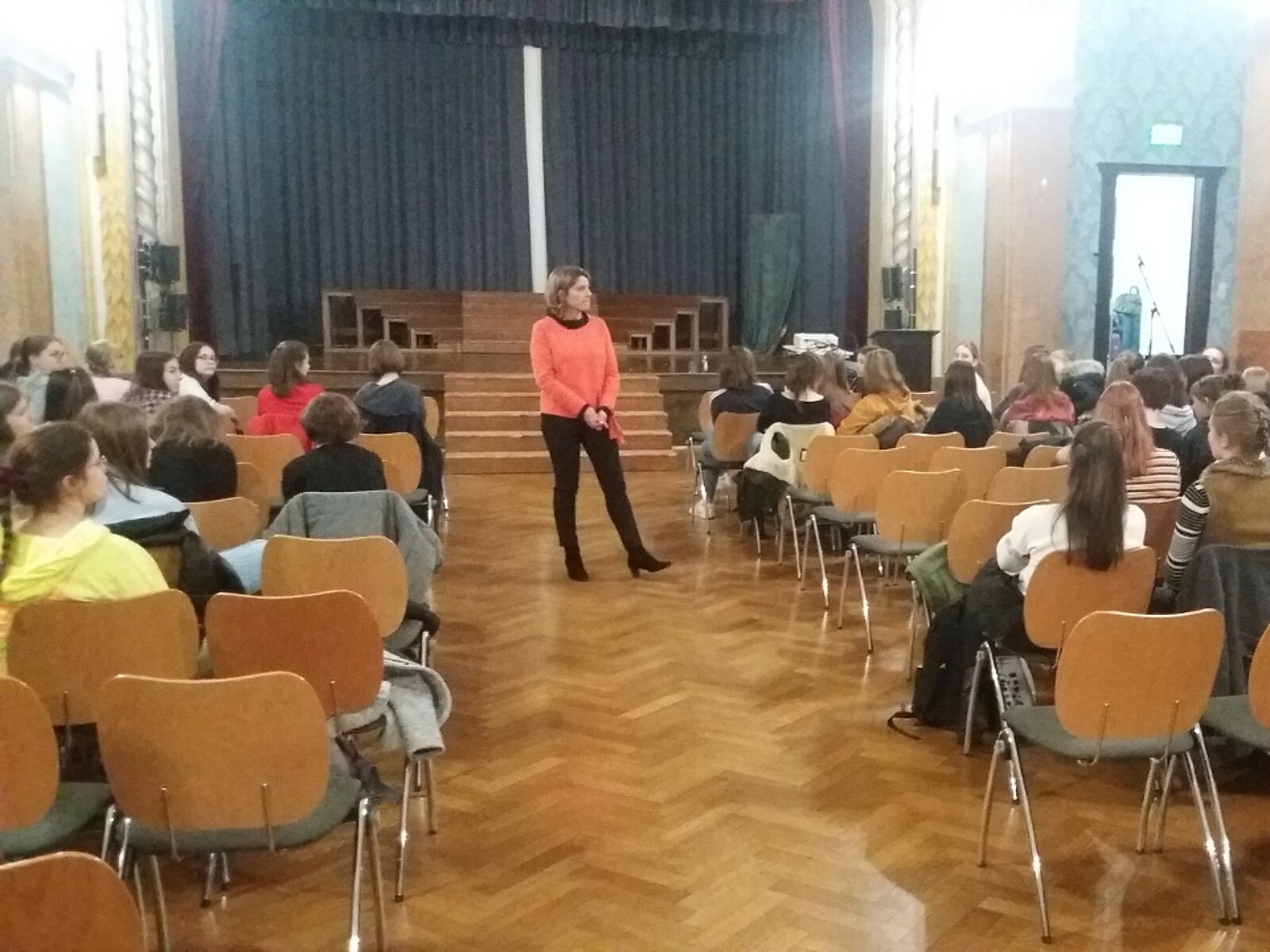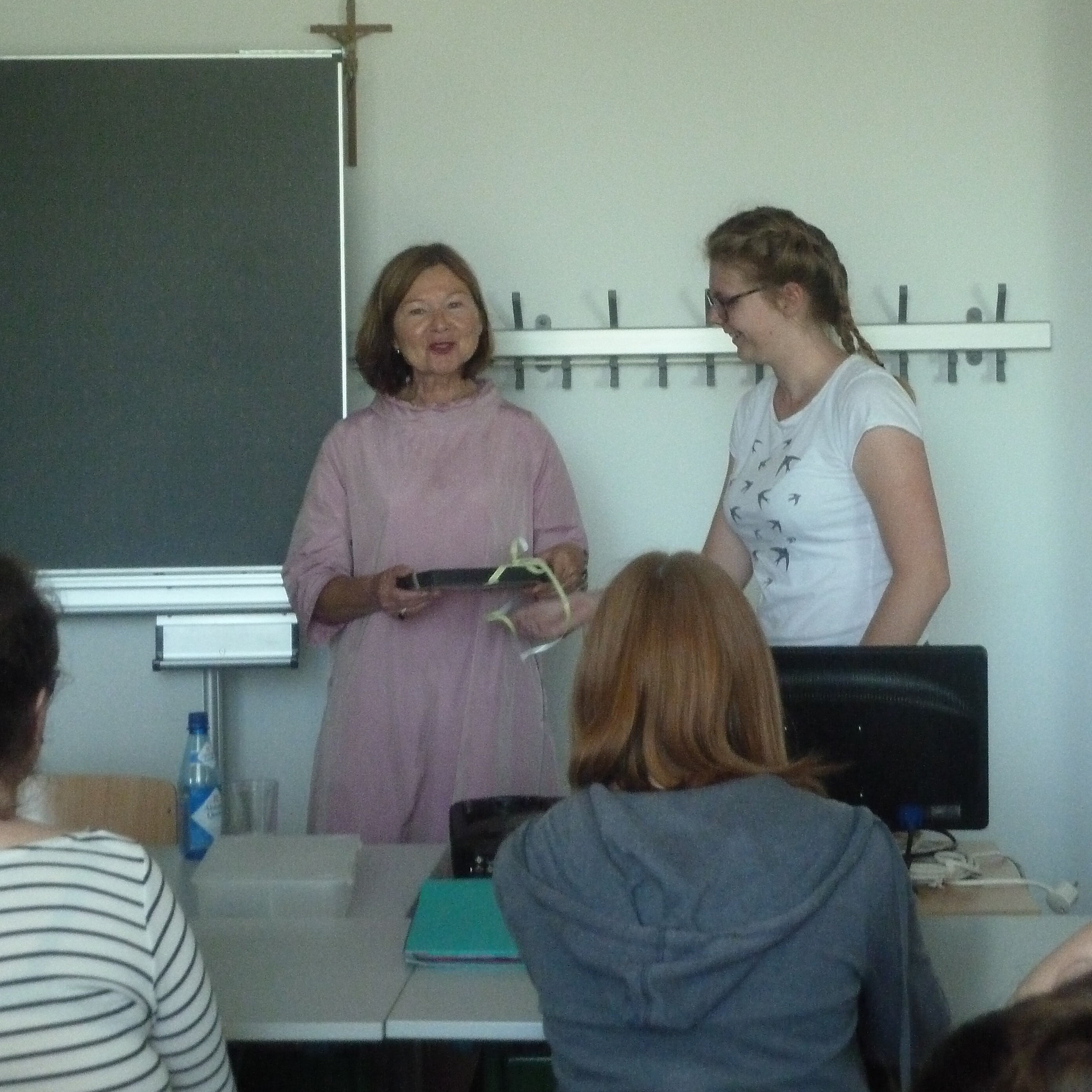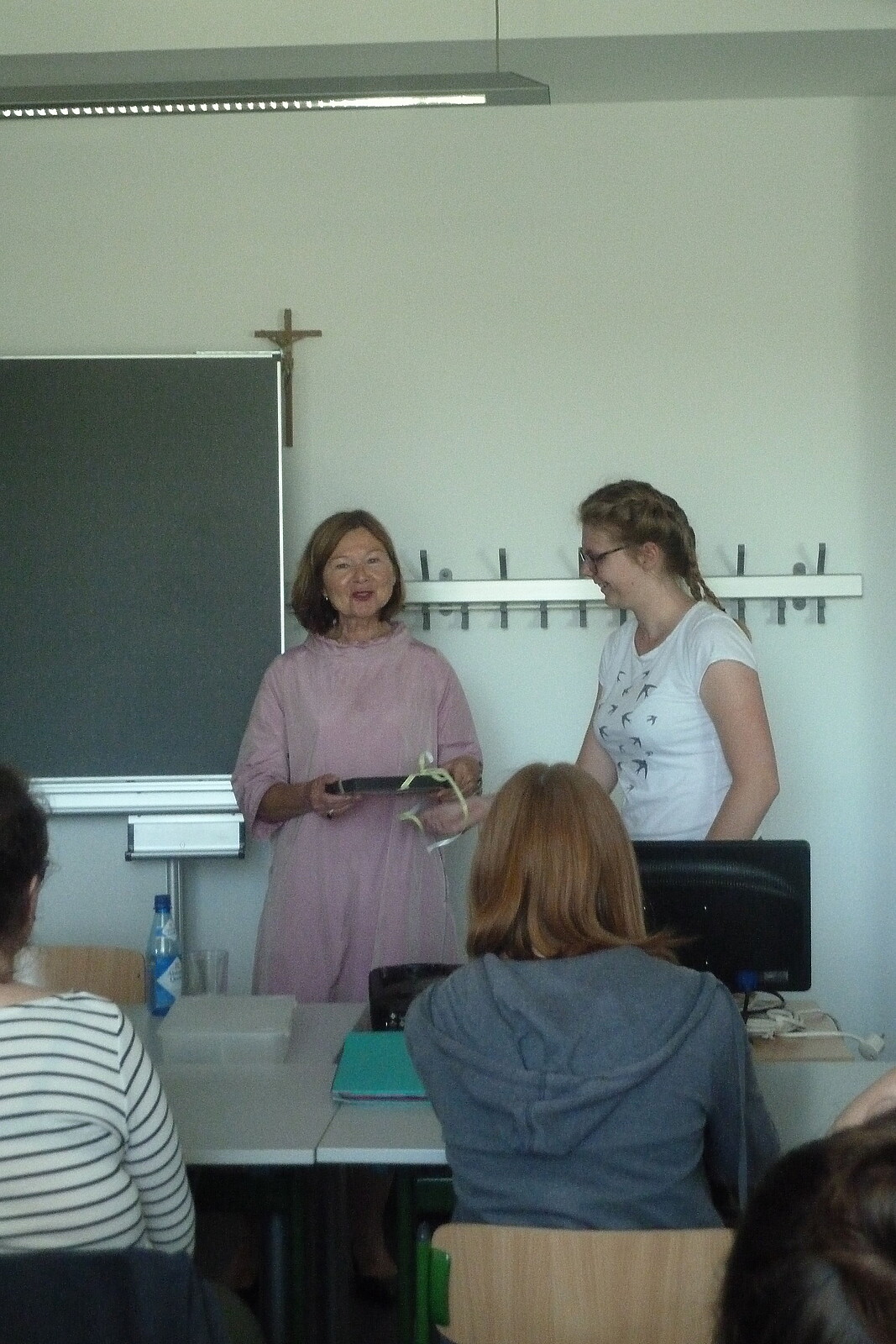 Schon die Auftaktfrage hatte es in sich: Warum können Politiker keinen Klartext sprechen, warum reden sie immer wie um den heißen Brei herum? Frau Wild gab hier eine sehr ehrliche Antwort und sprach einigen ihrer Politikerkollegen und -kolleginnen eine gewisse Fachkompetenz ab. Sie bemühe sich immer um eine gute Vorbereitung auf die Themen und Gespräche, um konkrete Antworten geben zu können, aber das sei nicht immer möglich, da Politik einen „langen Atem brauche“. Zwischenergebnisse als Endergebnisse zu verkünden, mache wenig Sinn, deshalb würden viele Politiker/innen wage bei ihren Antworten bleiben. Alle weiteren Fragen beantwortete Frau Margit Wild souverän und sehr ausführlich. Man merkte ihre Begeisterung für politische Themen an jeder ihrer Aussagen. Oft lachte sie und machte witzige Bemerkungen, die das Politikgespräch sehr auflockerten. Ganz besonders hob Margit Wild die Rolle der Frauen in der Politik hervor und ermutigte uns, dass wir uns gerade als junge Frauen politisch engagieren sollten.