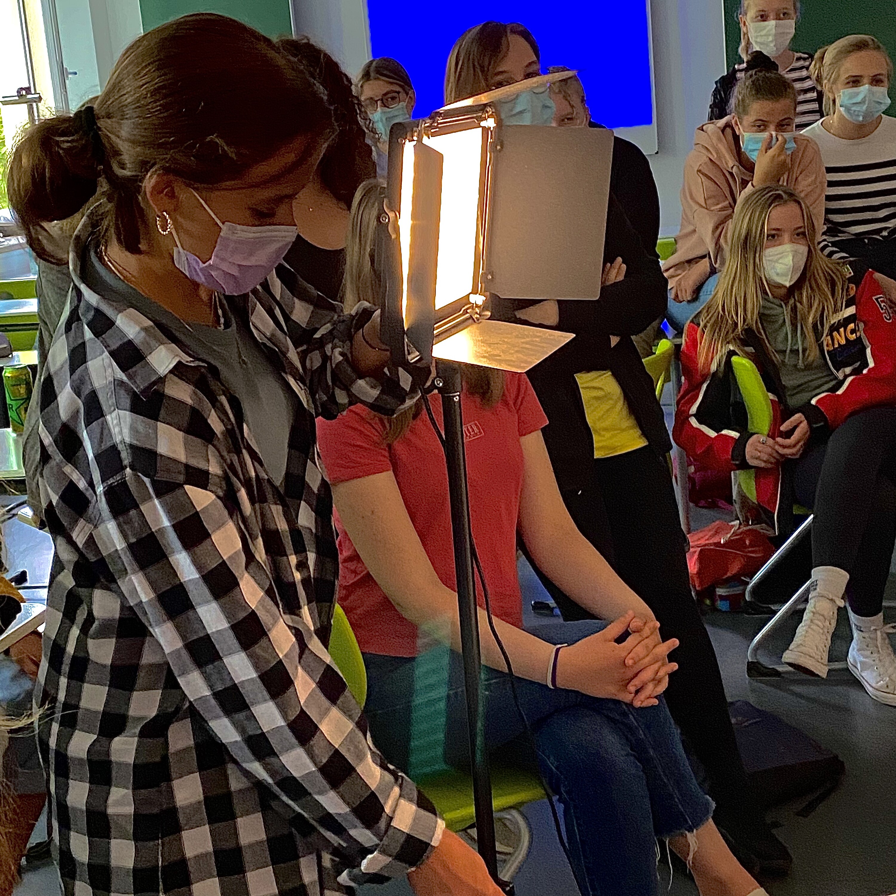 Im dritten Hands-on-Teil des Workshops konnten die Schülerinnen lernen, wie sich auch mit einfachen Mitteln ein Set einrichten lässt. Die kreativen Ideen der Schülerinnen aufgreifend, erläuterte Marvin Neumann den Bildaufbau anhand des goldenen Schnitts und erklärte, wie mit Lichtpanels, den richtigen Kamera- und Mikrofoneinstellungen eine perfekte Videopräsentation erzielt werden kann. Mit Tipps vom Fachmann war im Nu durch die Schülerinnen eine professionelle Videoaufnahme erstellt.