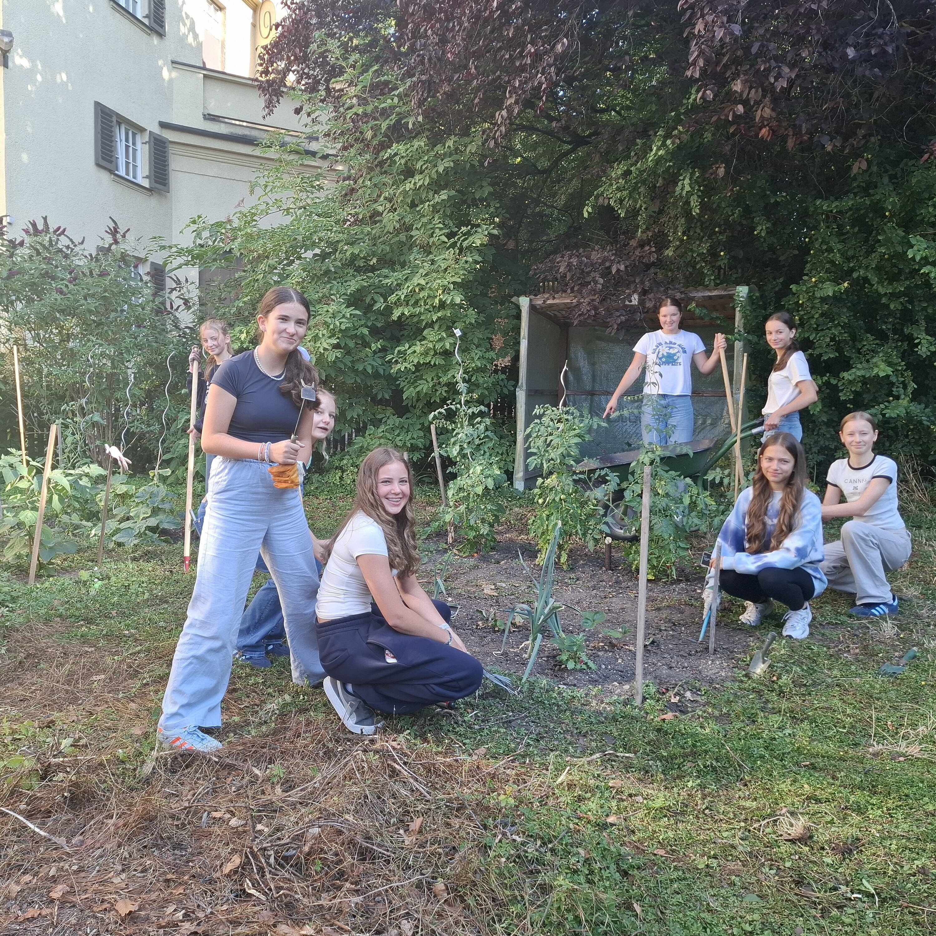 Unter dem Motto „Unser Klostergarten soll noch schöner werden“ wurde auch in diesem Jahr ein Aktionstag Klostergarten für unsere Schulen veranstaltet. Schülerinnen hatten die Möglichkeit, im Klostergarten aktiv mitzuarbeiten: Statt einer „normalen“ Unterrichtsstunde wurde Unkraut gejätet, der Boden aufgelockert, gegossen und aufgeräumt. Am Schluss gab es zur Stärkung Schnittlauchbrote und Apfelsaft!