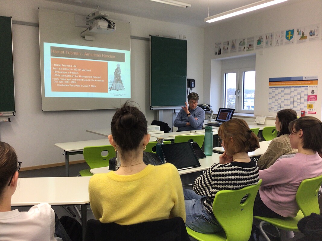 Die Schülerinnen des W-Seminars Englisch mit dem Titel „American Heroines“ tauschten sich im Februar mit einem echten Experten zu diesem Thema aus. Prof. Dr. Volker Depkat, der am Lehrstuhl für Amerikanistik an der Universität Regensburg tätig ist, besuchte die Schülerinnen im Unterricht und lud zu einer angeregten Diskussion über wichtige weibliche Persönlichkeiten der US-amerikanischen Geschichte ein. Mit im Gepäck hatte er sein neuestes Projekt, eine Biographie über Harriet Tubman, die im 19. Jahrhundert Schwarzen zur Flucht aus der Sklaverei verhalf. Anhand dieses konkreten Beispiels konnten Einblicke in die Biographie einer amerikanischen Heldin gewonnen werden. Des Weiteren wurden der kritische Umgang mit Quellen, die Strukturierung einer Seminararbeit und die nötige Schwerpunktsetzung bei der Ausformulierung der Arbeit diskutiert.