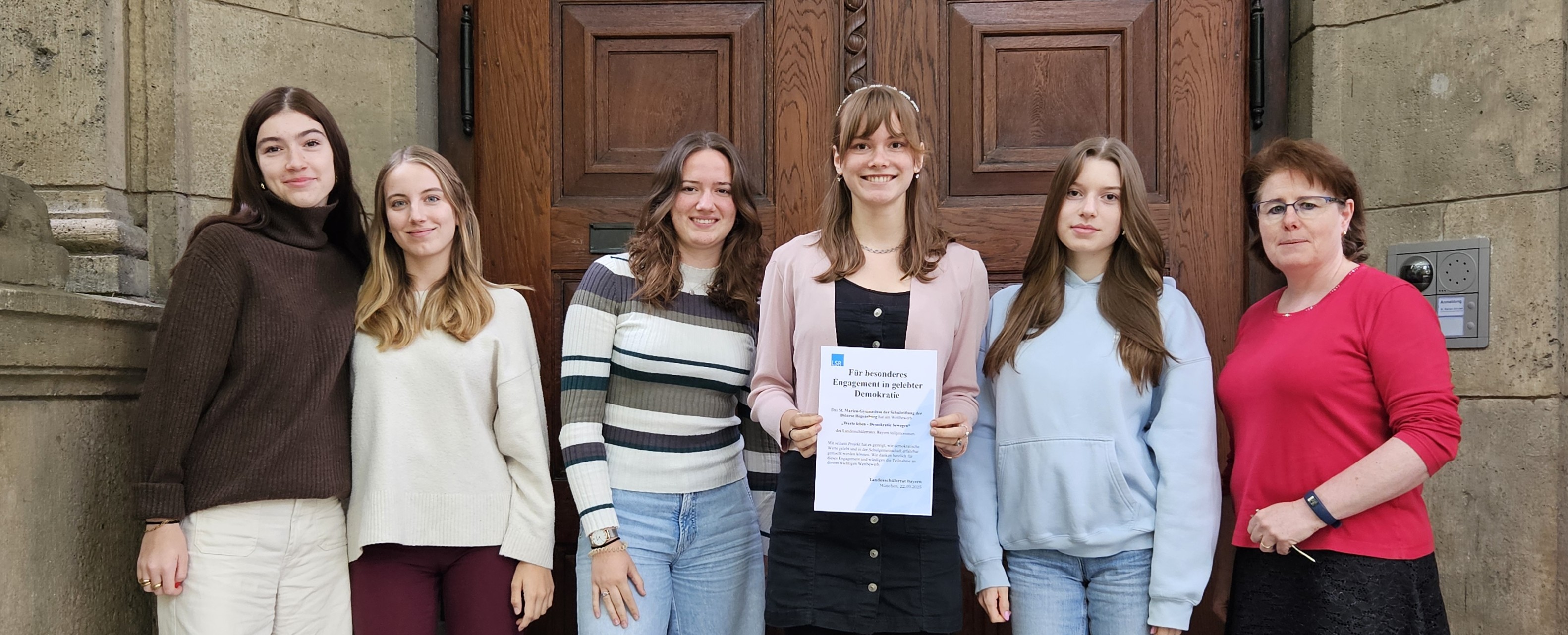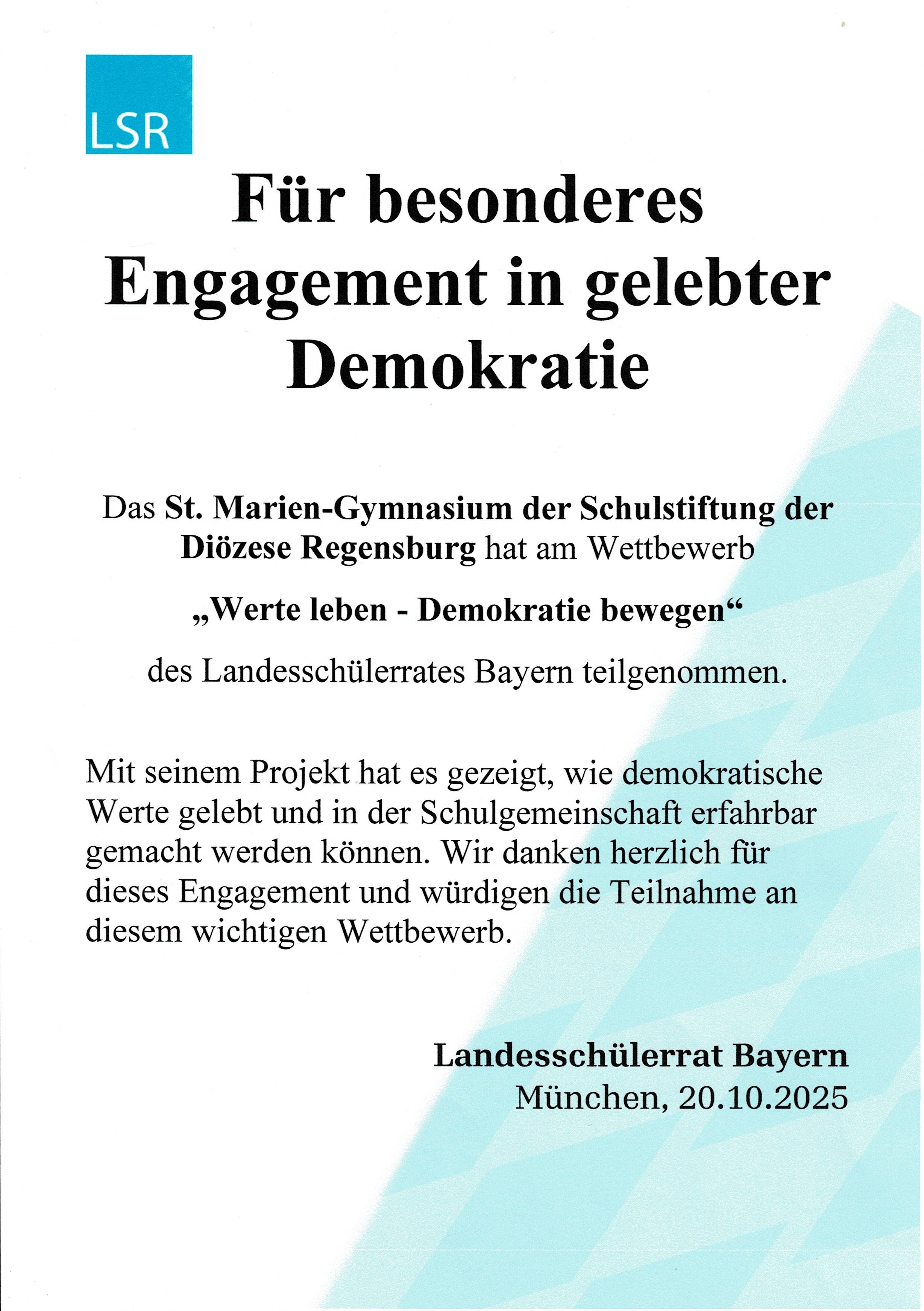 Auszeichnung des Landesschülerrates Bayern für die „Woche der Demokratie“ an den St. Marien-Schulen