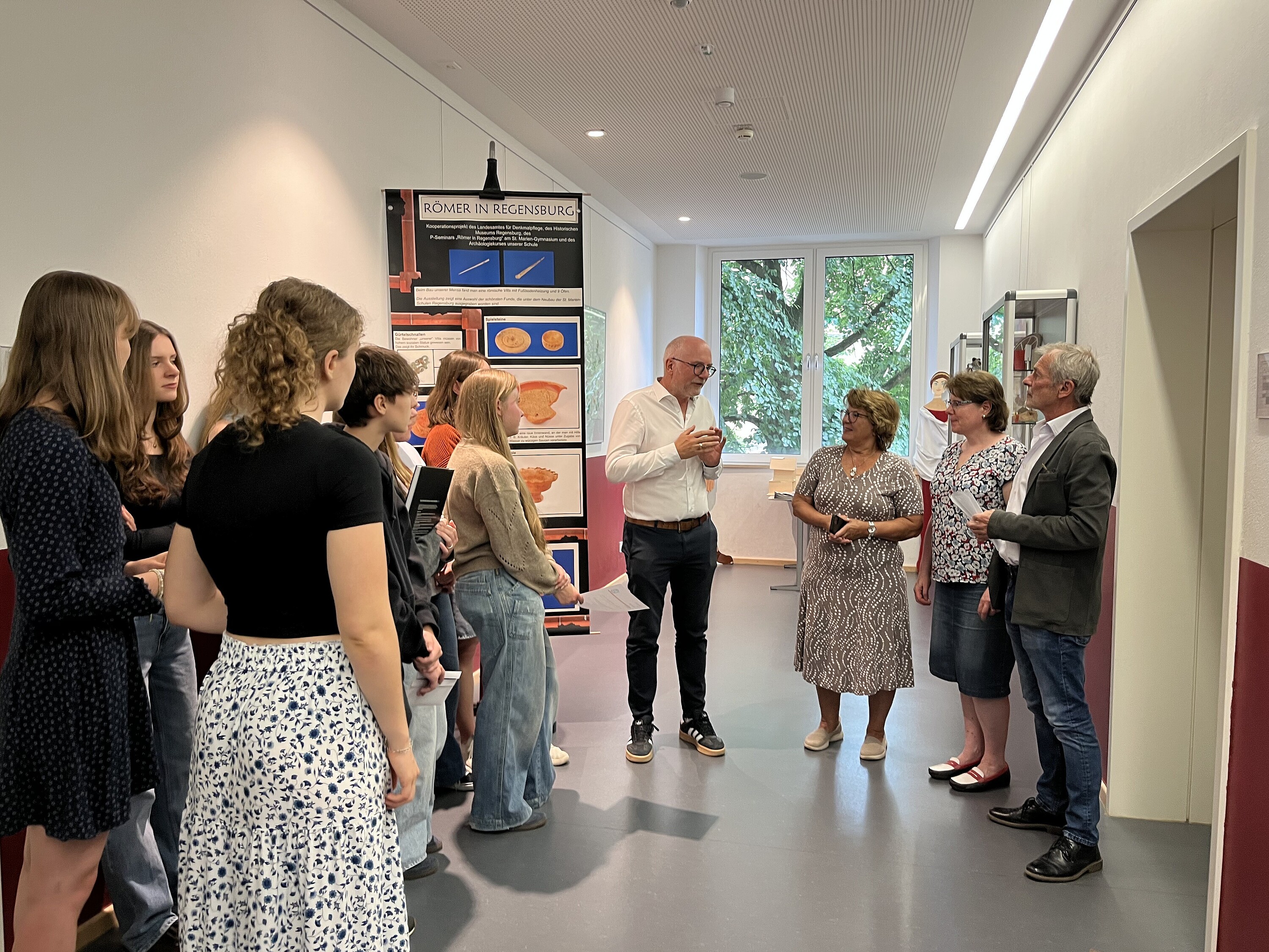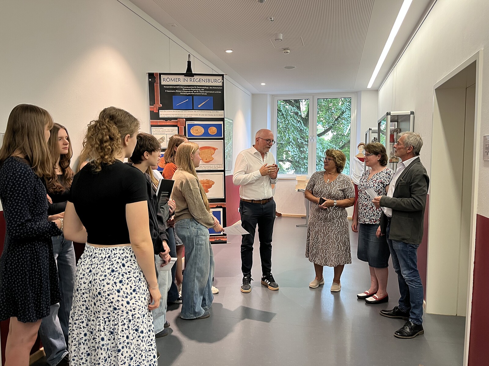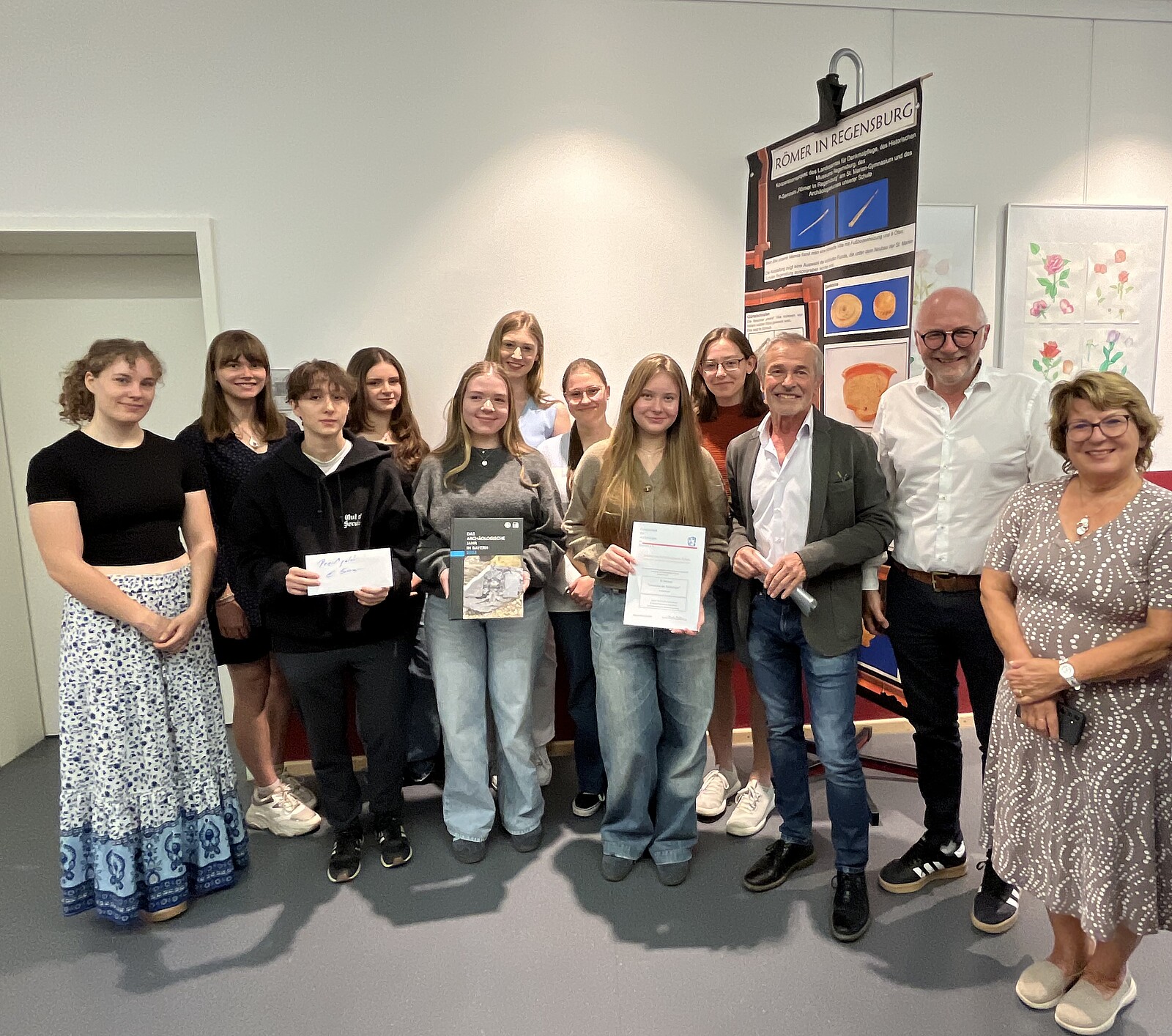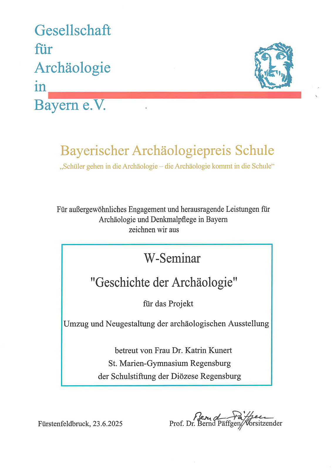 Für ihr Projekt „Umzug und Neugestaltung der archäologischen Ausstellung“ wurden die Schülerinnen des W-Seminars „Geschichte der Archäologie“ am 11.07.2025 von Dr. Silvia Codreanu-Windauer (2. Stellvertretende Vorsitzende der Gesellschaft für Archäologie in Bayern e. V.) und Dr. Ludwig Husty (1. Stellvertretender Vorsitzender der Gesellschaft für Archäologie in Bayern e. V., Kulturforum Oberalteich, Kreisarchäologie Straubing-Bogen) mit dem Bayerischen Archäologiepreis Schule 2025 ausgezeichnet.