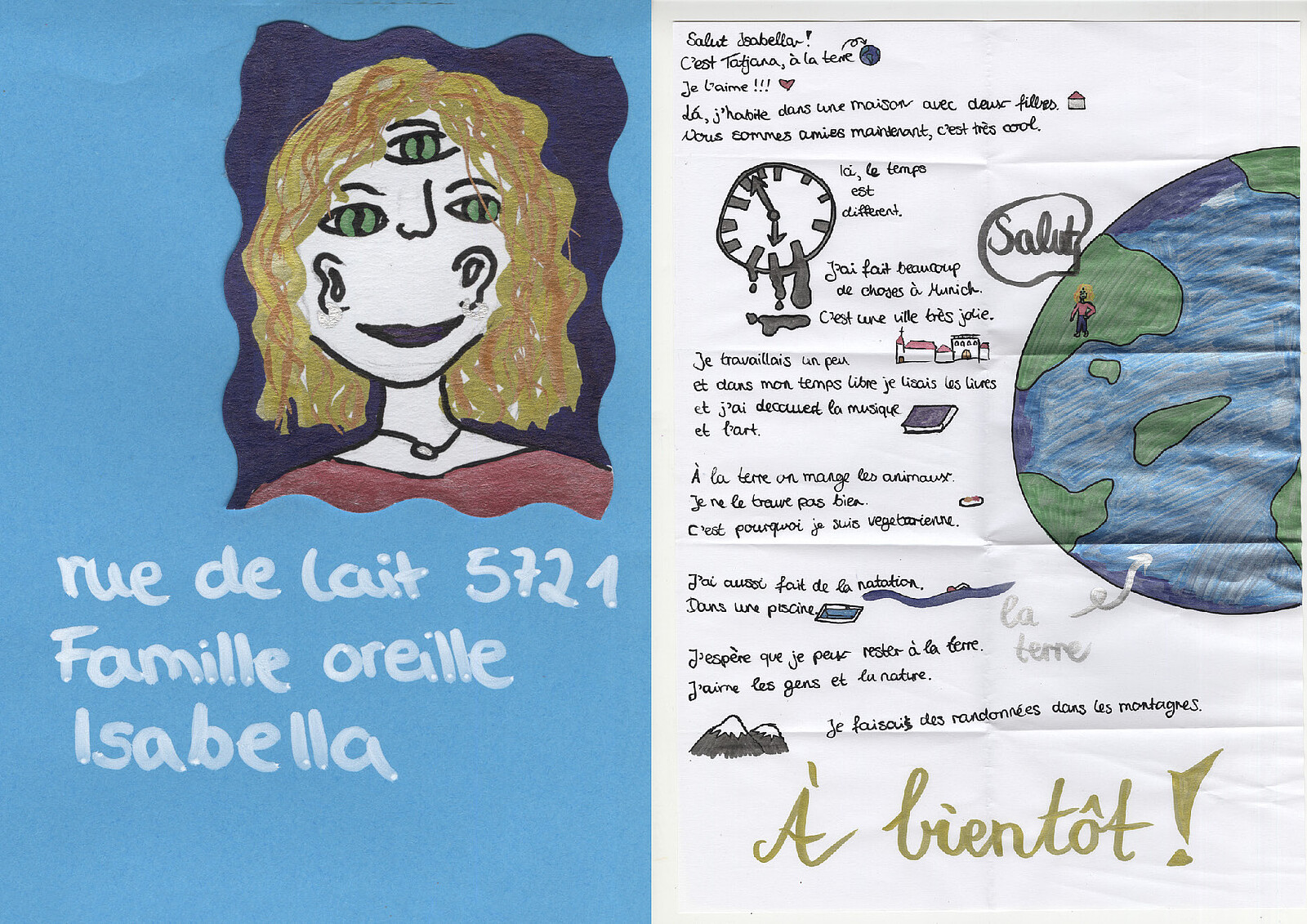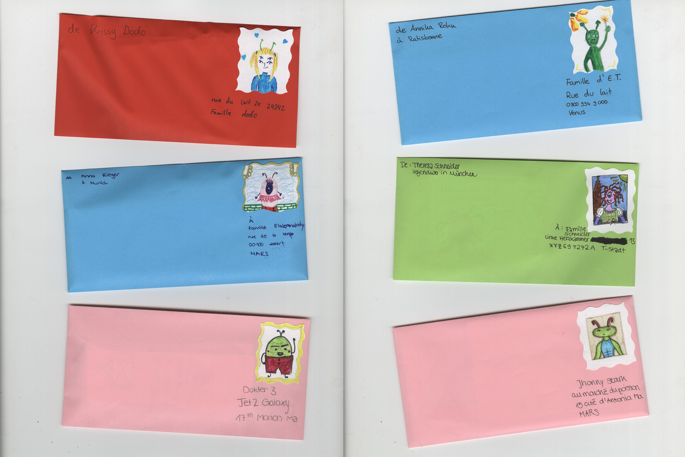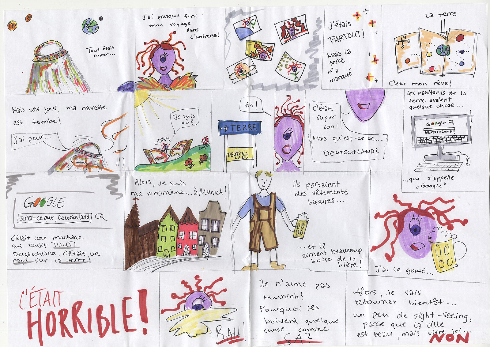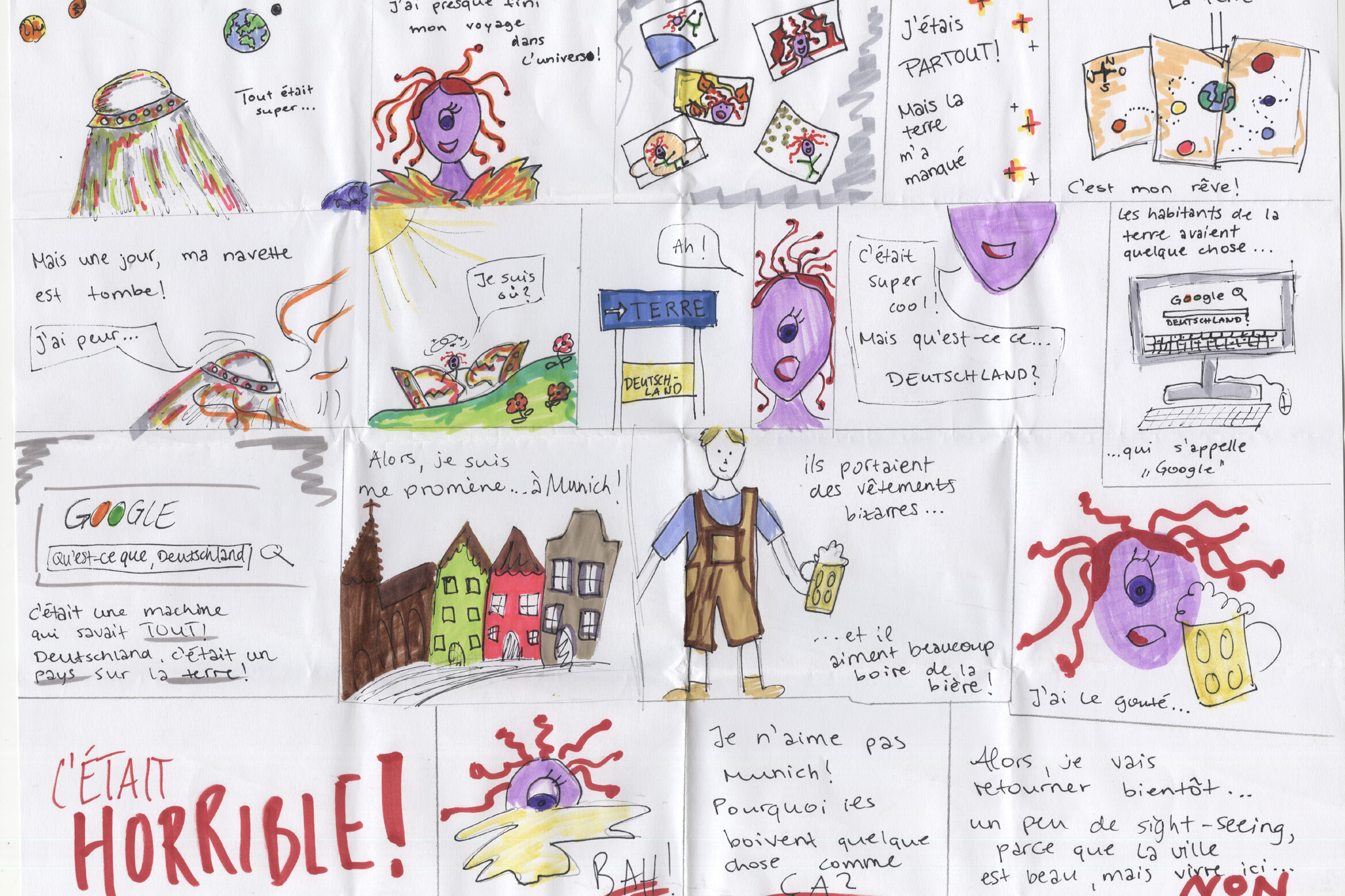 Unter der Leitung der Comic-Zeichnerin Noémie Chust, nehmen die Schülerinnen und Lehrer die Perspektive eines Außerirdischen ein, der für ein paar Tage die Erde besucht und erstellen einen Comic mit Briefcharakter für die Verwandten im Weltall. Sie berichten von ihren Erfahrungen auf dem Planeten, wie sie die Lebewesen, die Gegenstände, Dörfer und Städte dort empfinden. Vielen kommt der Planet Erde recht komisch vor … genauso wie dem kleinen Prinzen, den die Schülerinnen im Französisch-Unterricht bereits kennengelernt haben. Wir bedanken uns beim Institut Français für die persönliche Einladung und den kreativen Vormittag.