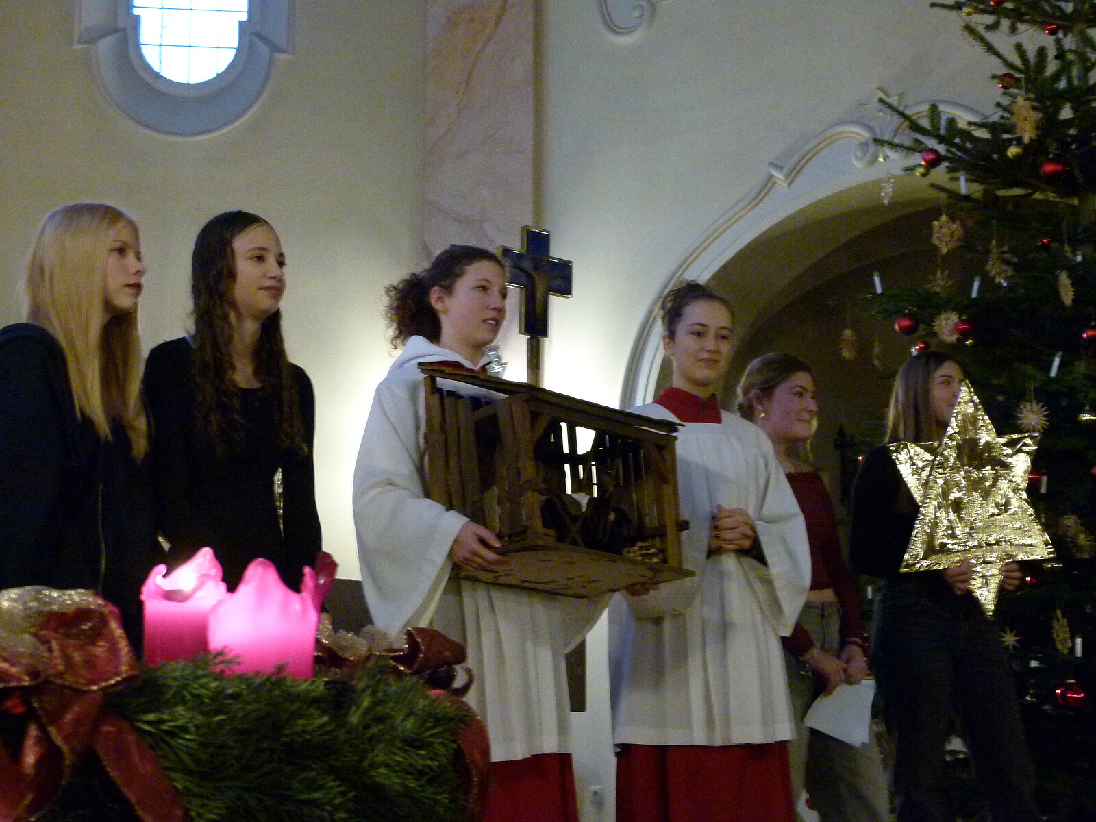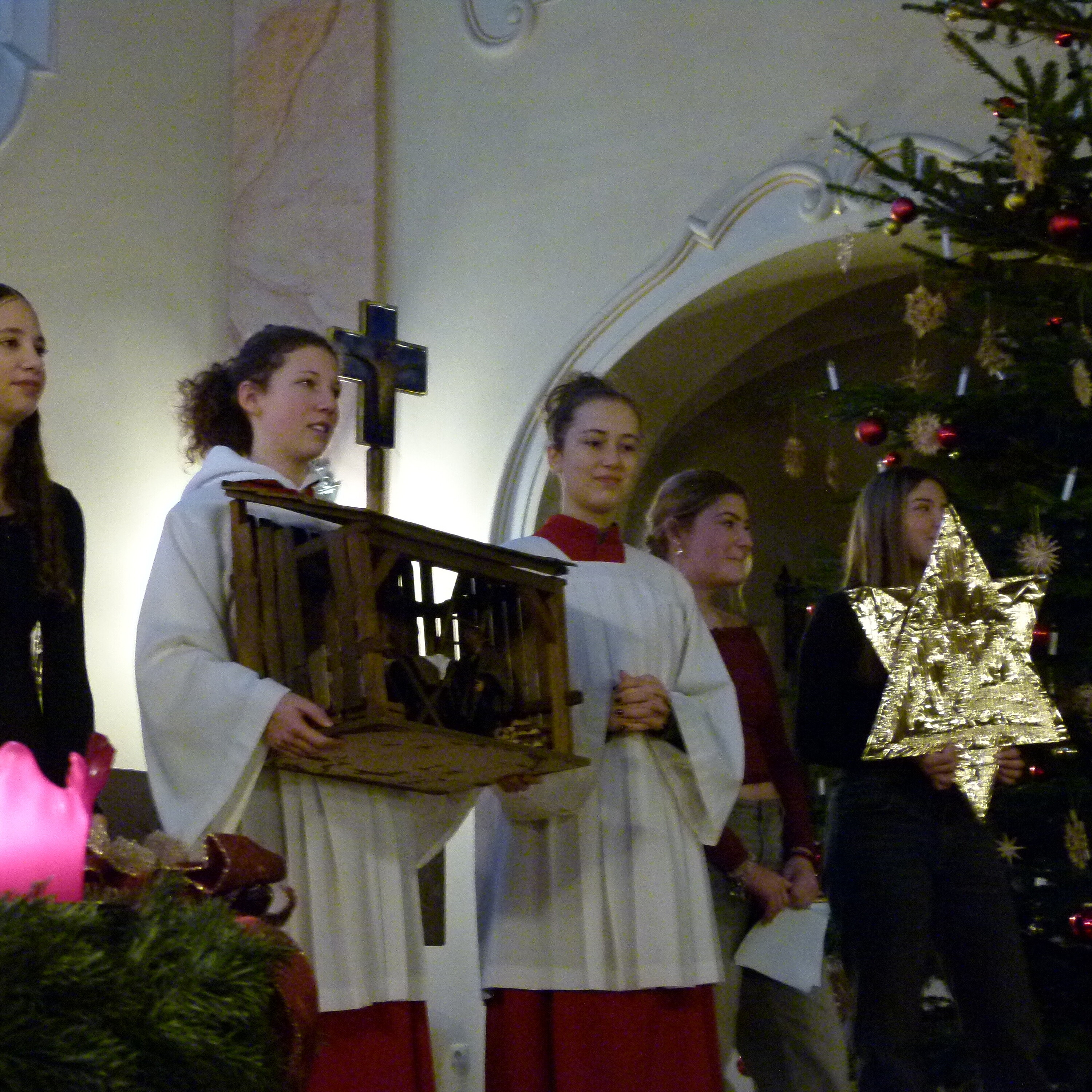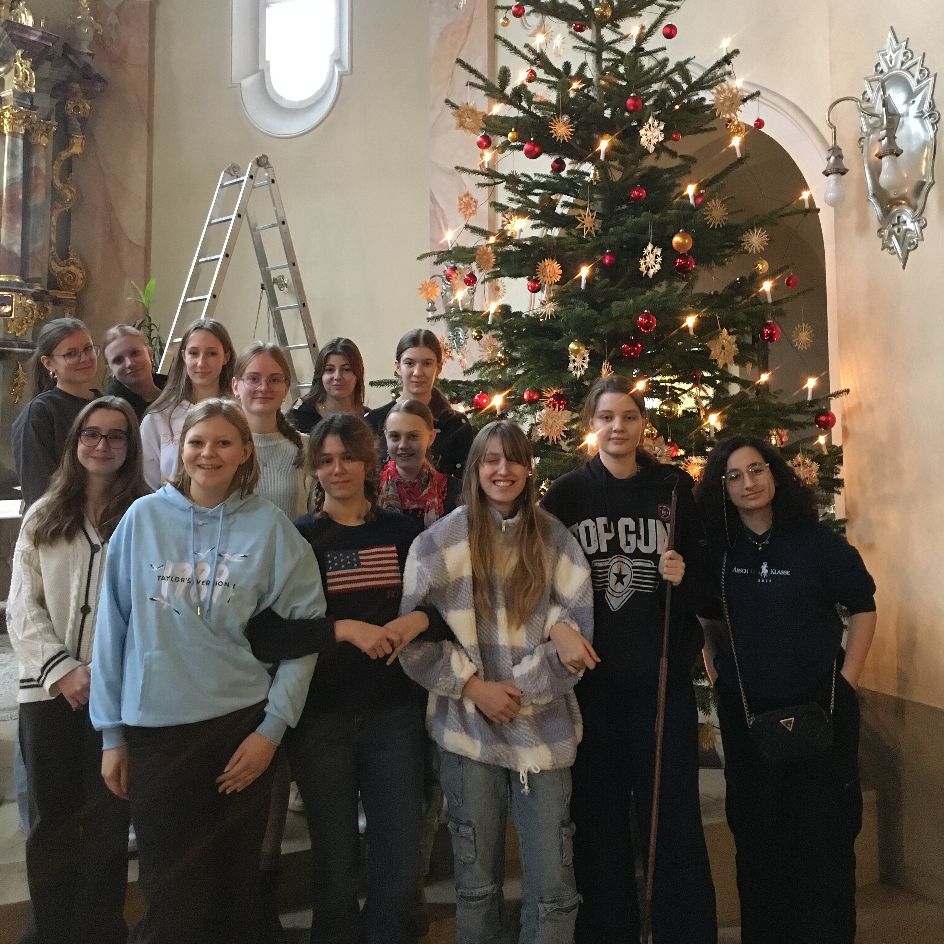 - Die Klasse G 11A schmückte – mangels Mesnerin wie in den Tagen der Klosterfrauen! – den Christbaum und bereitete das Gotteshaus mit Pfarrer Albert vor;