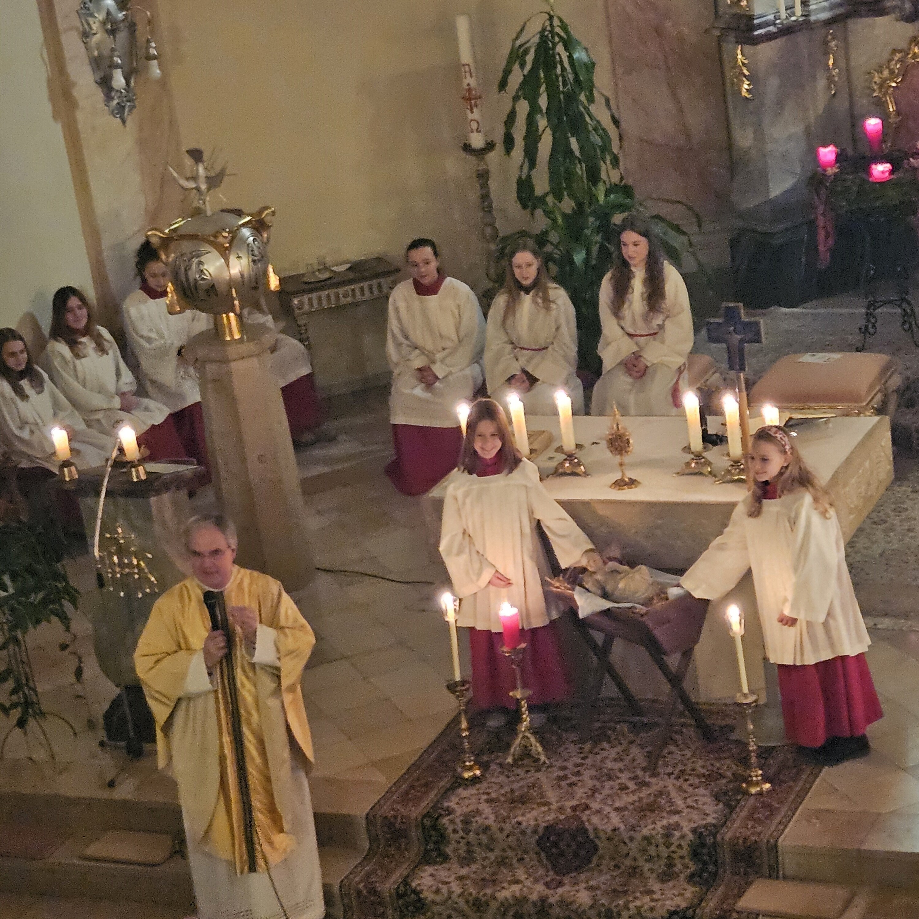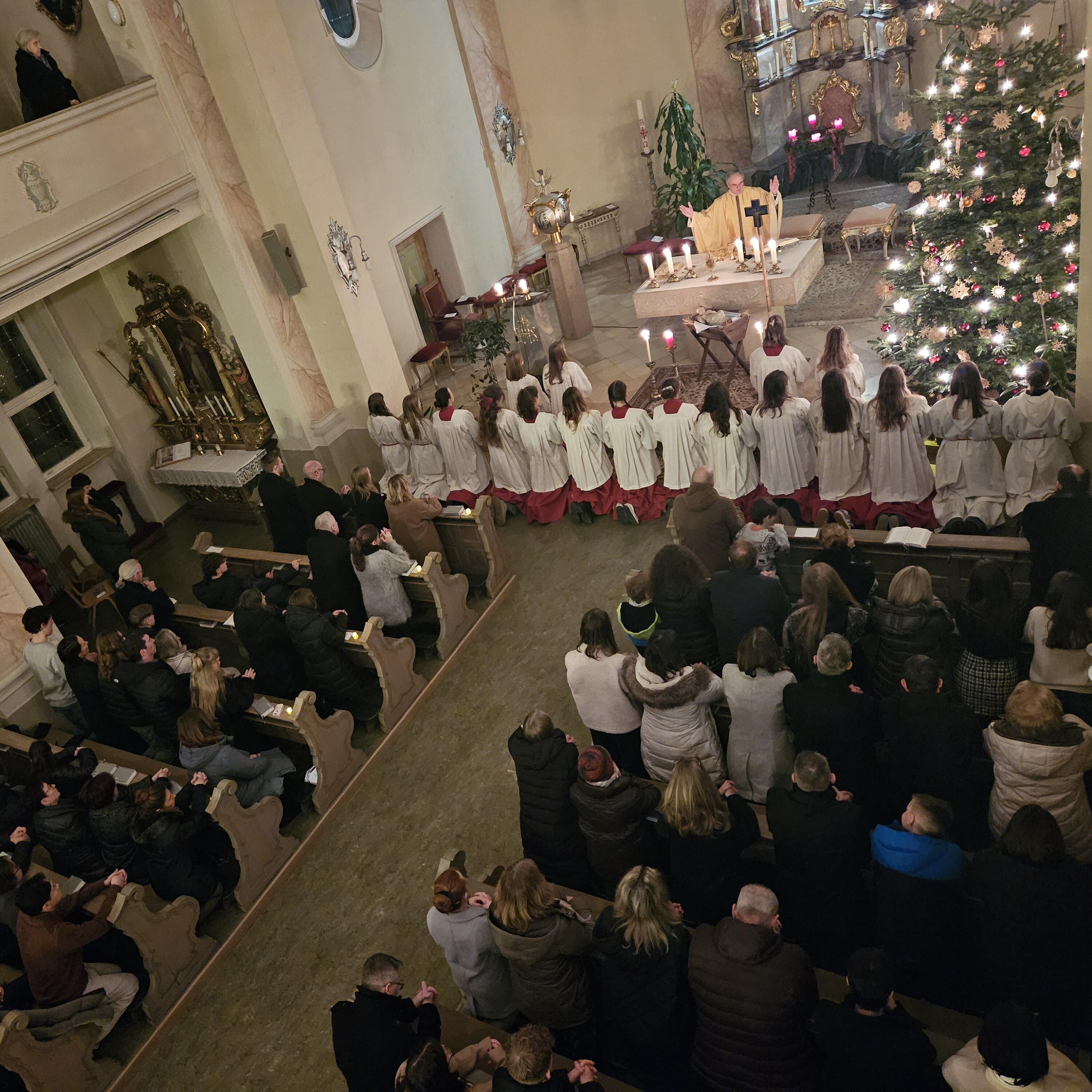 „Das gibt es so nirgendwo...!“ Dieses Zitat stammt von Dr. Peter Nothaft, dem Leiter des Katholischen Schulwerks in Bayern, gegenüber Domvikar Albert im Blick auf die Christmette der Schulgemeinschaft am Heiligen Abend. Und in der Tat waren heuer wieder ca. 450 Gläubige – Ehemalige und gegenwärtige Schülerinnen mit ihren Familien! – der Einladung in die Schul- und Institutskirche gefolgt. „Um Nachsicht bitten wir, dass wir circa 70 Absagen erteilen mussten...“ so der Schulseelsorger, „aber mehr lassen die räumlichen Gegebenheiten sinnvoll einfach nicht zu!“ Mitgestaltet von 19 Ministrantinnen, Maestro Humbs an der Orgel und einzelnen Mitgliedern des Lehrerkollegiums wurde es ein wunderschönes Fest des Glaubens!