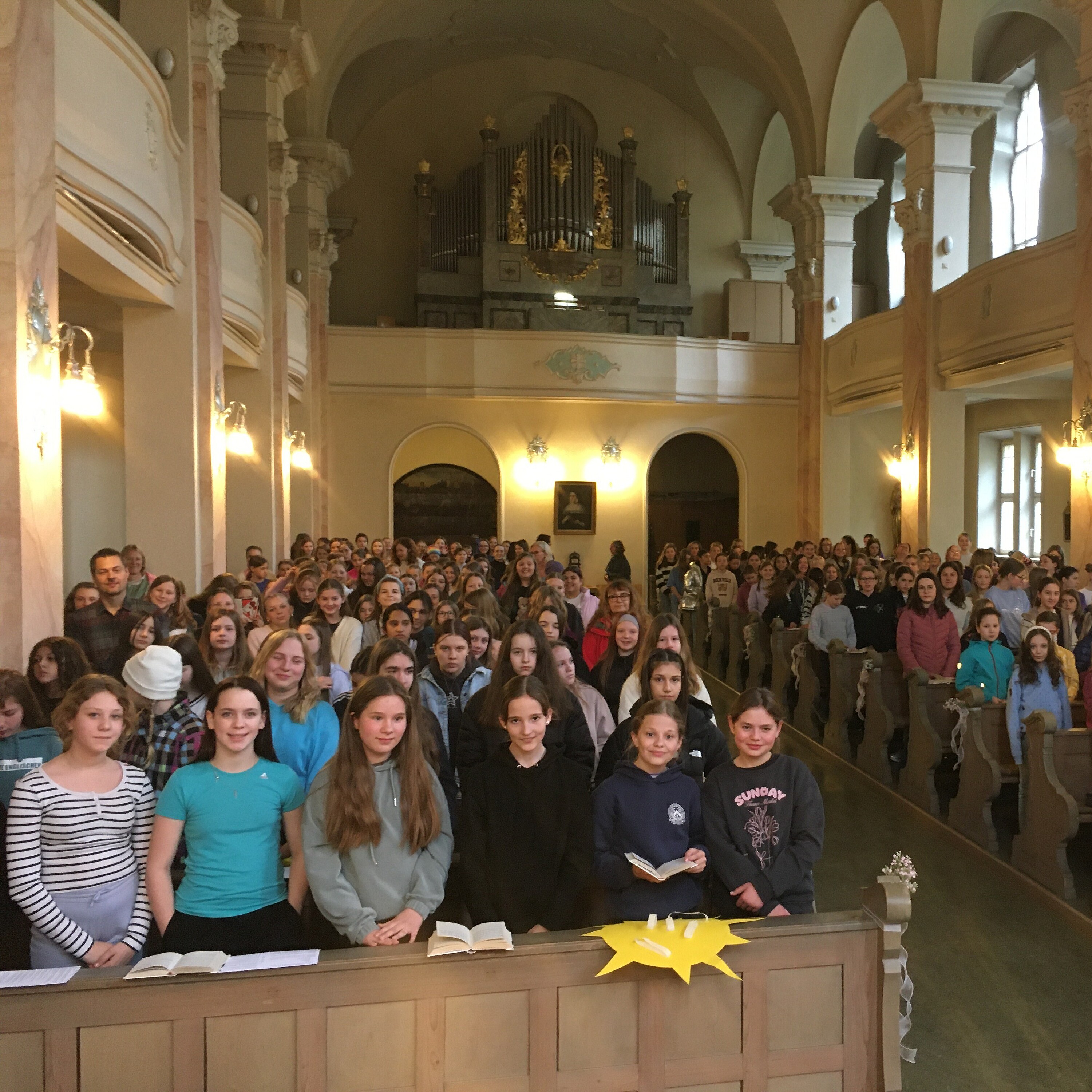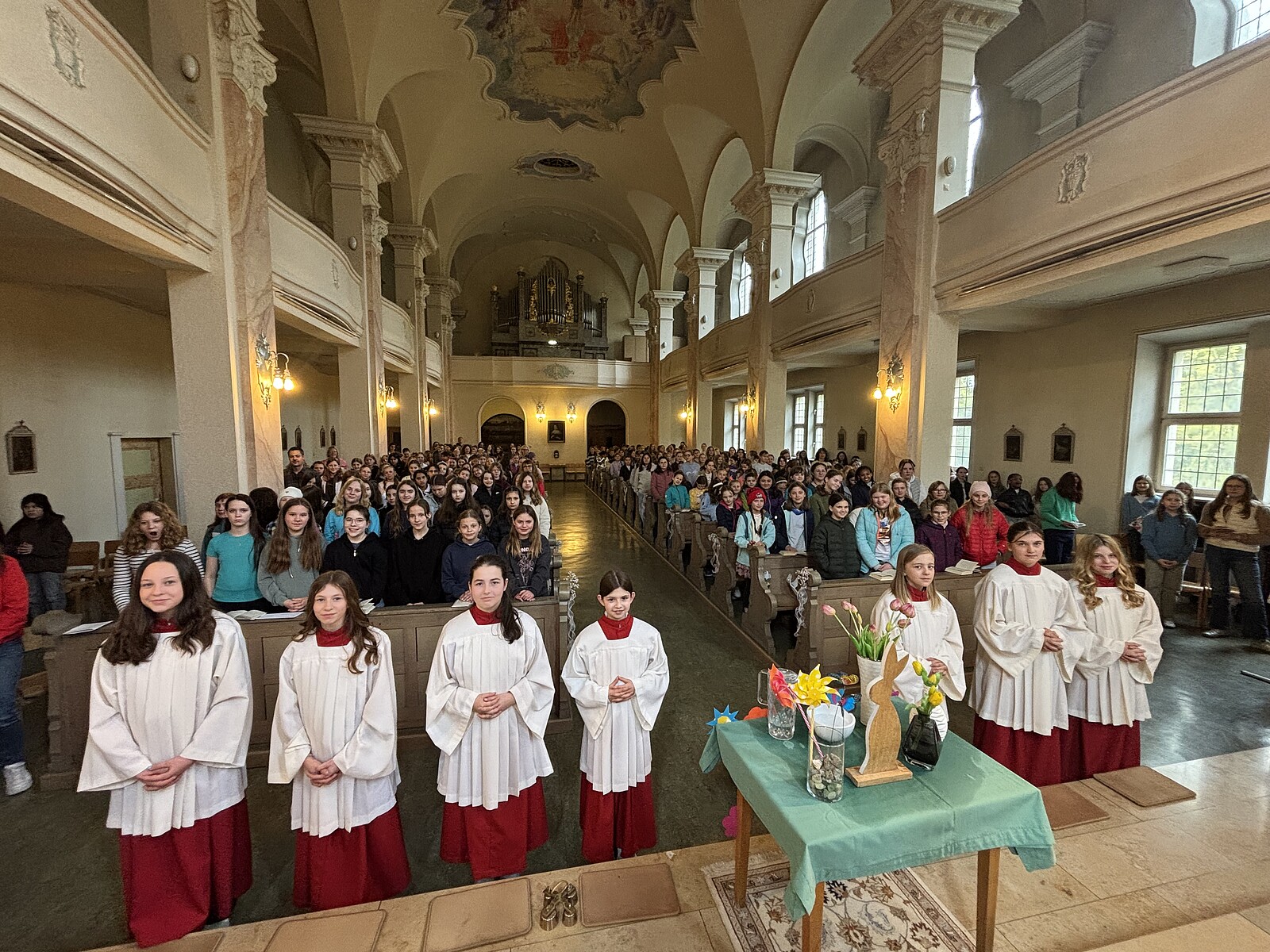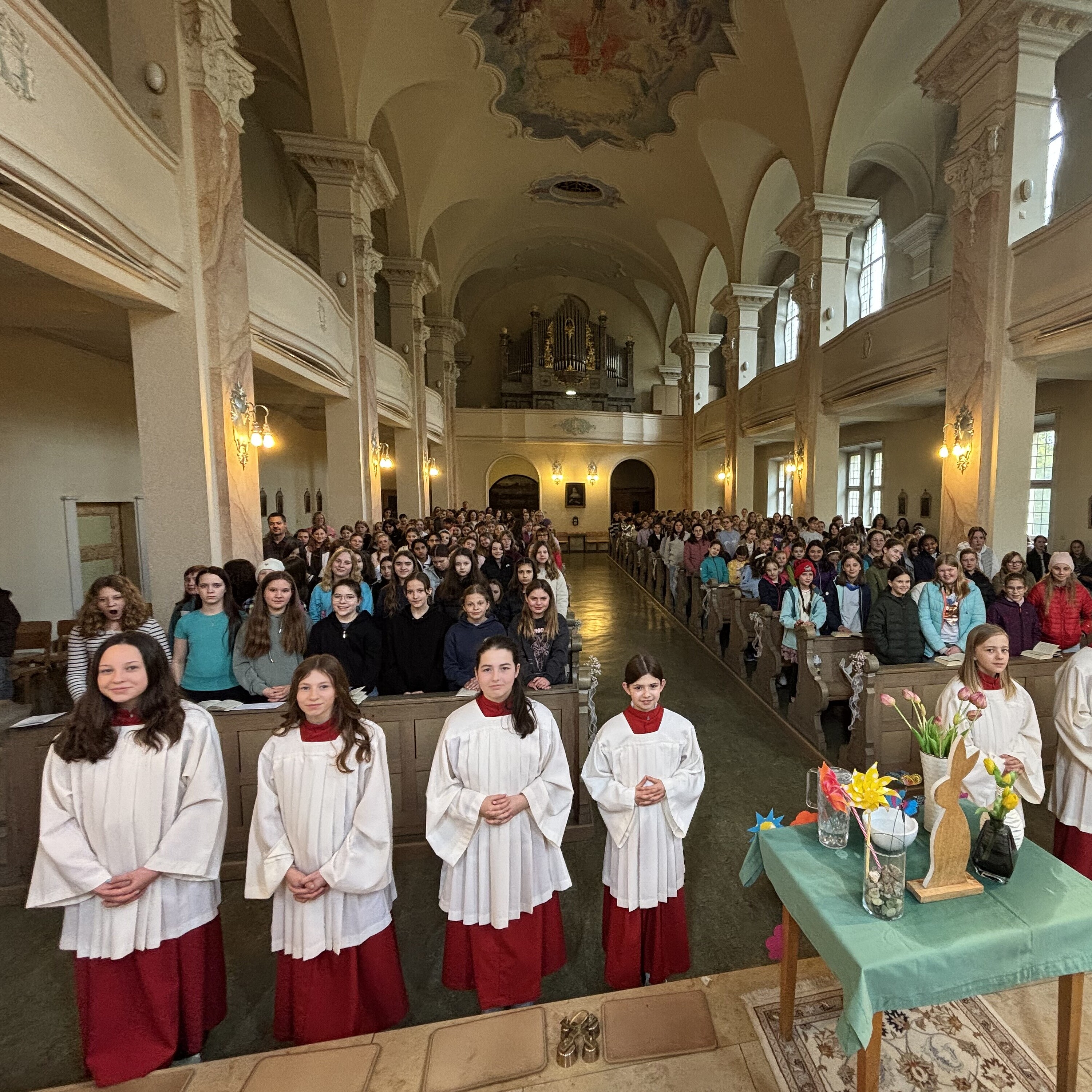 Nach den Ferien bilden die Unterstufenklassen mit dem Auferstehungsgottesdienst den feierlichen Abschluss eines großen Festes. Wer diese Erfahrungen mitnimmt, der erkennt unschwer, welche Bereicherung der Glaube und die Hoffnung auf Gottes unerschütterliche Liebe zu uns für das alltägliche Leben sind. Man spürt es, wenn man durch die Gänge und in den Klassenzimmer unserer Schule unterwegs ist, wie eine hausinterne Befragung der R 10A belegt!