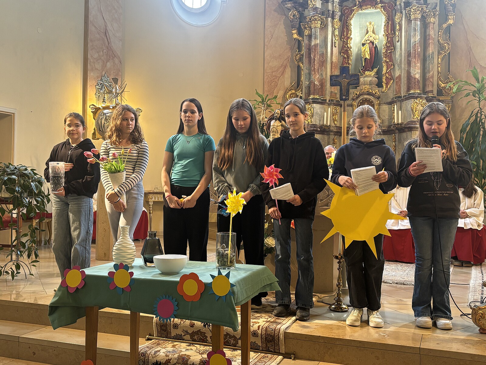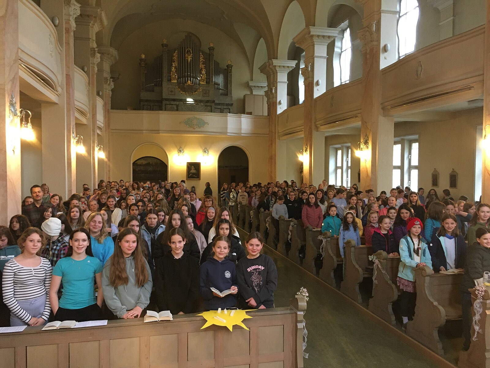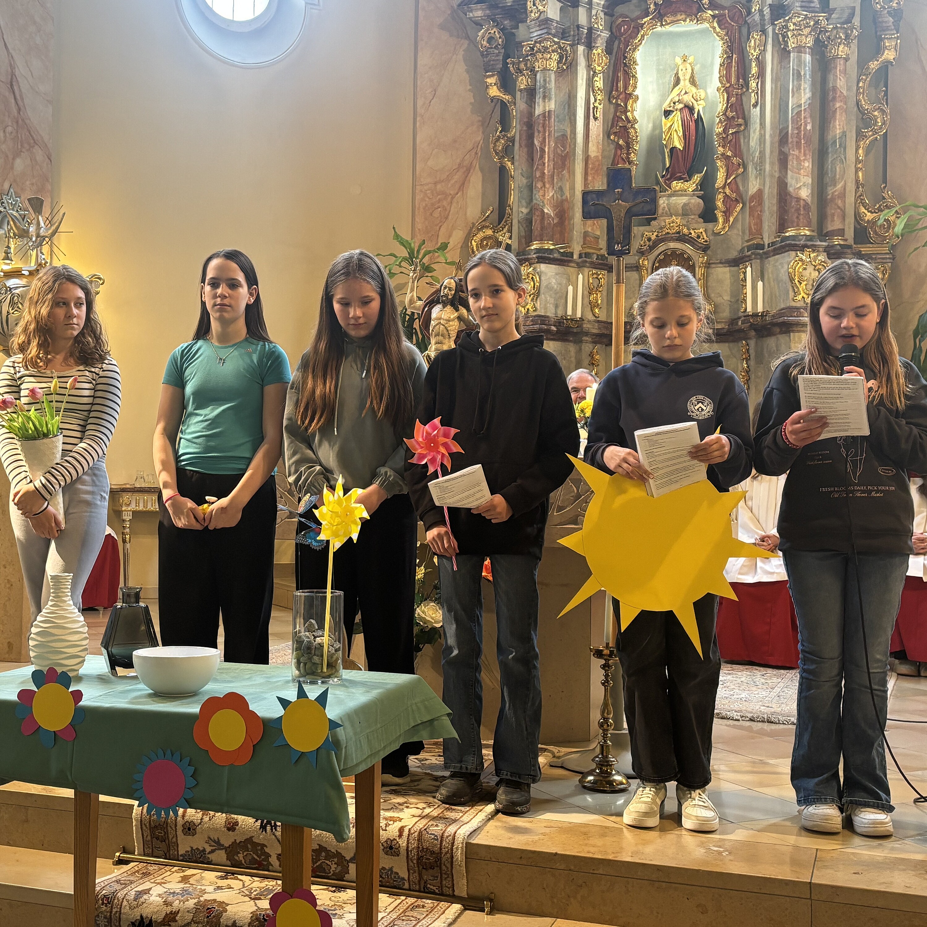 Nach den Ferien bilden die Unterstufenklassen mit dem Auferstehungsgottesdienst den feierlichen Abschluss eines großen Festes. Wer diese Erfahrungen mitnimmt, der erkennt unschwer, welche Bereicherung der Glaube und die Hoffnung auf Gottes unerschütterliche Liebe zu uns für das alltägliche Leben sind. Man spürt es, wenn man durch die Gänge und in den Klassenzimmer unserer Schule unterwegs ist, wie eine hausinterne Befragung der R 10A belegt!