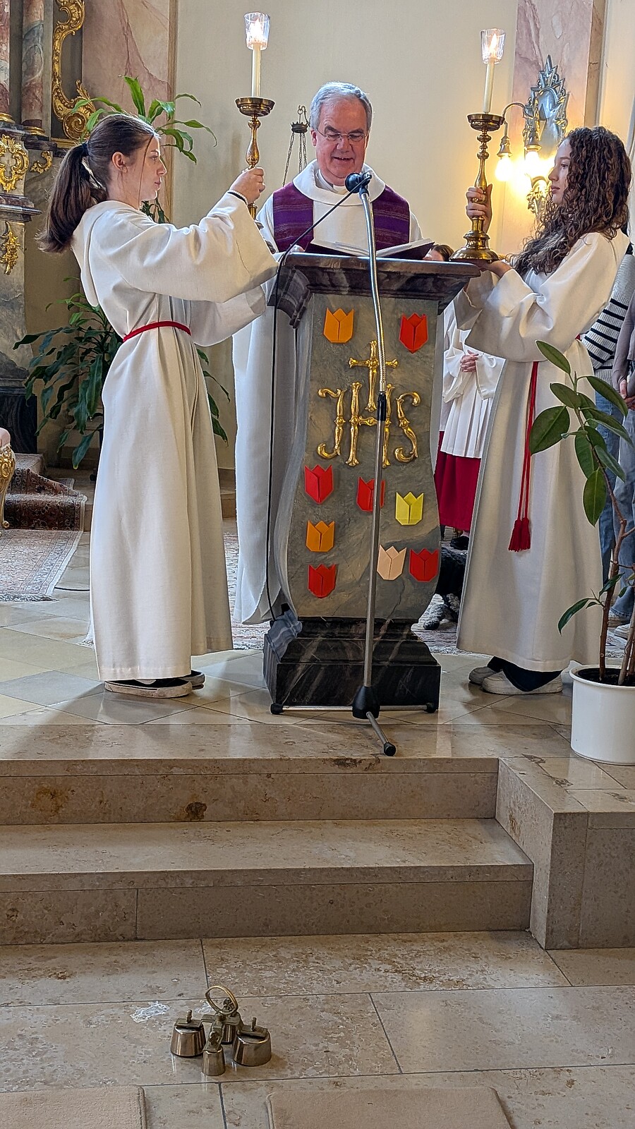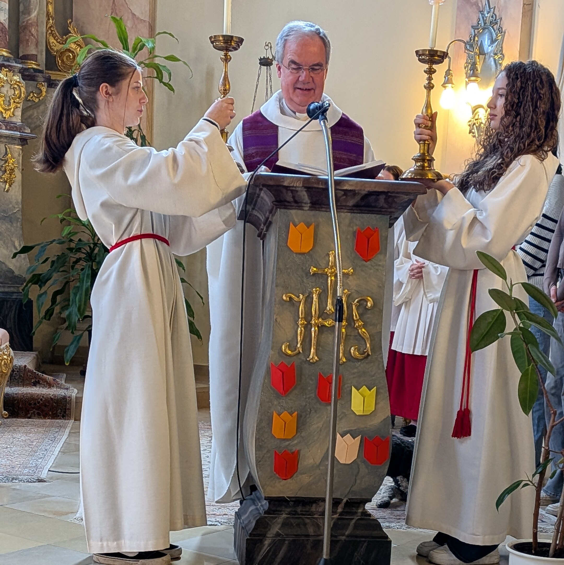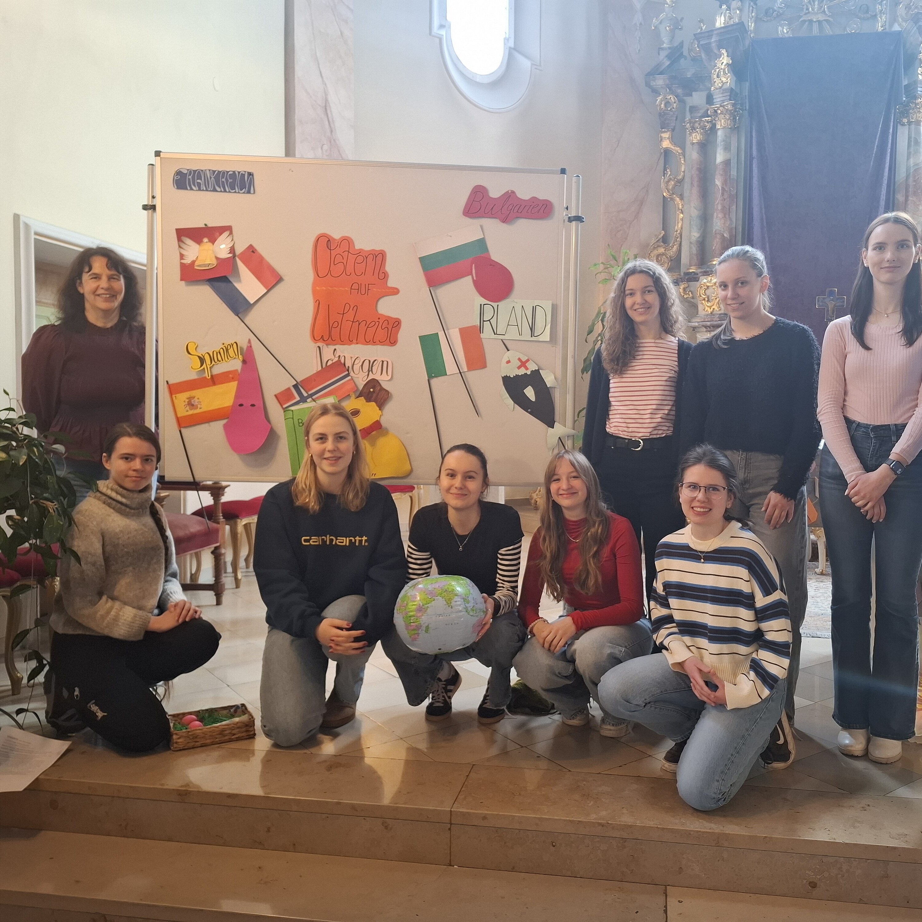 Während der Großteil der Schülerinnen noch vor Ostern ihre Einstimmungsgottesdienste auf das bevorstehende Fest feierten, waren die Fünftklässlerinnen der Realschule im Schullandheim – natürlich nicht ohne Reisesegen – immerhin war auch der auferstandene Jesus mit den Freunden nach Emmaus unterwegs. Und selbst auf der Audiodatei der Abiturientinnen im fernen Italien war plötzlich die vertraute Stimme des Schulseelsorgers über Europas Schutzpatronin, die hl. Katharina von Siena, und den Ostersieg Jesu zu hören.