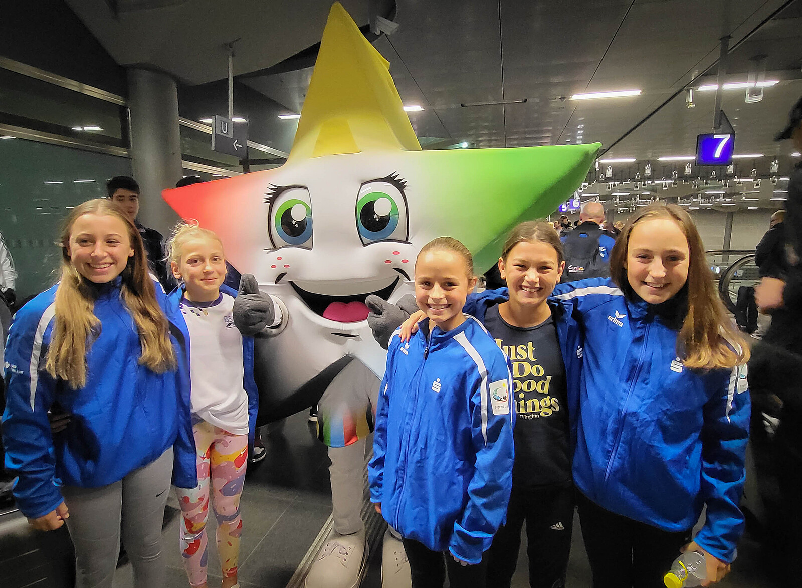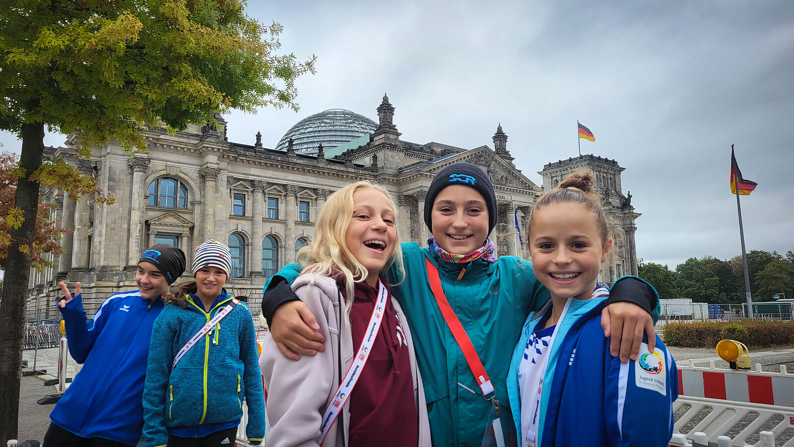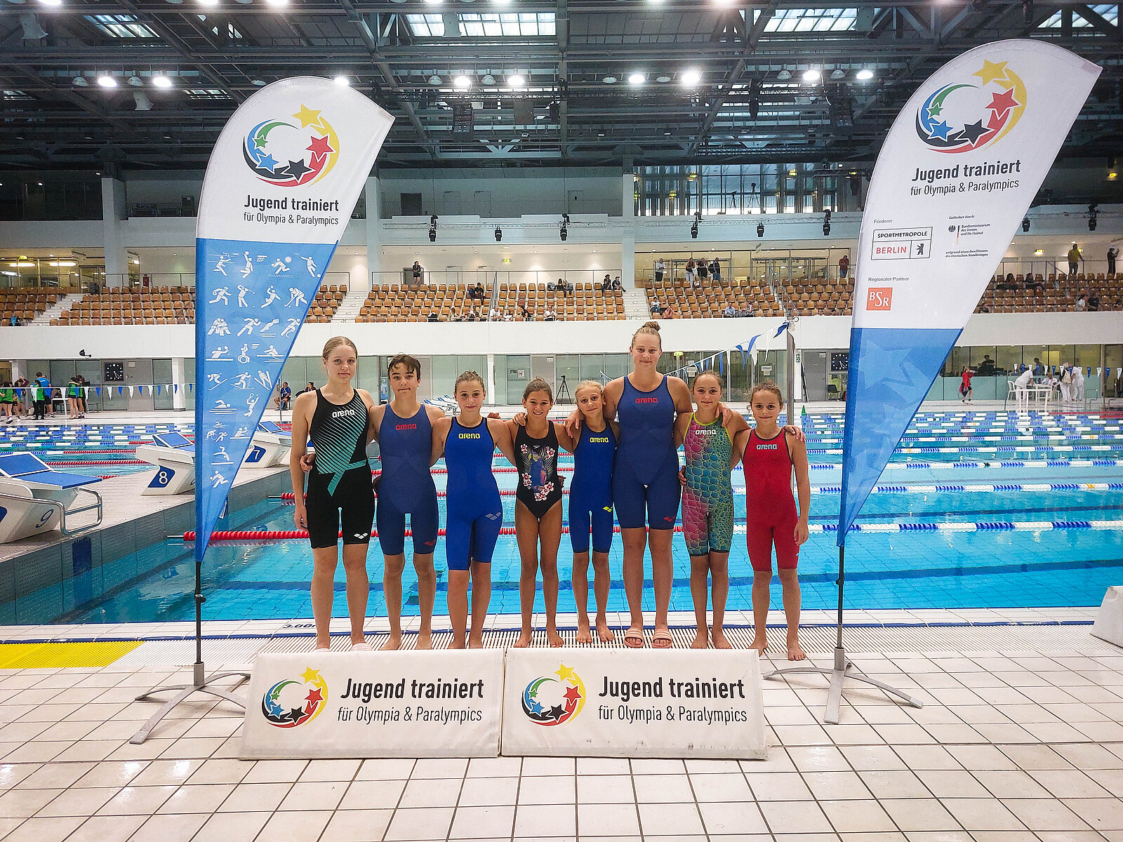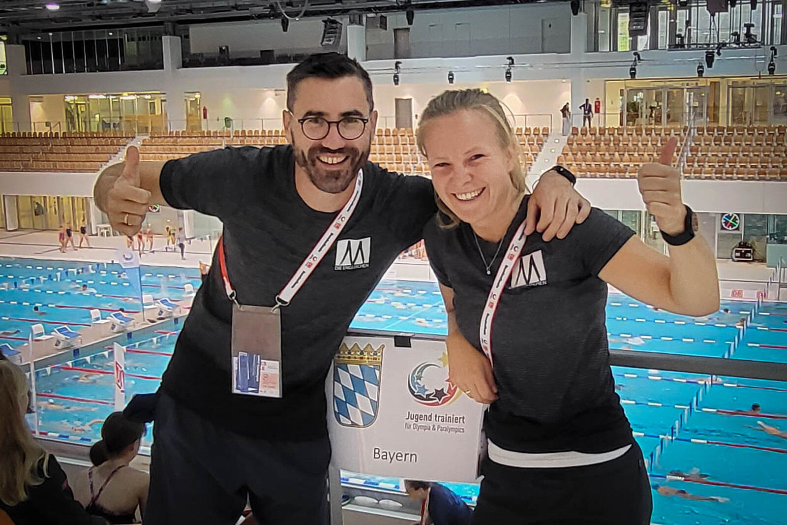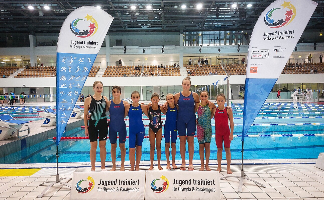 Nach dem Sieg bei den Bayerischen Schulmeisterschaften im Frühjahr dieses Jahres, durften die acht Schwimmerinnen der Englischen vom 15.-19. September 2024 zum Bundesfinale nach Berlin fahren. Die Aufregung und Vorfreude war natürlich groß, dass man nun bei einem nationalen Wettbewerb in der Wettkampfklasse Mädchen IV (U14) das Bundesland Bayern vertreten durfte. Nach der gemeinsamen Anreise im ICE mit allen anderen bayerischen Mannschaften aus zehn verschiedenen Sportarten, galt es am Montag zunächst, sich im Training auf den Wettkampf einzustimmen und die letzten Abläufe zu perfektionieren. Selbstverständlich gab es neben dem sportlichen Programm auch ein attraktives Freizeitprogramm für die Mädchen - schließlich waren die meisten zum ersten Mal in Berlin und wollten natürlich den Bundestag und das Brandenburger Tor besichtigen.