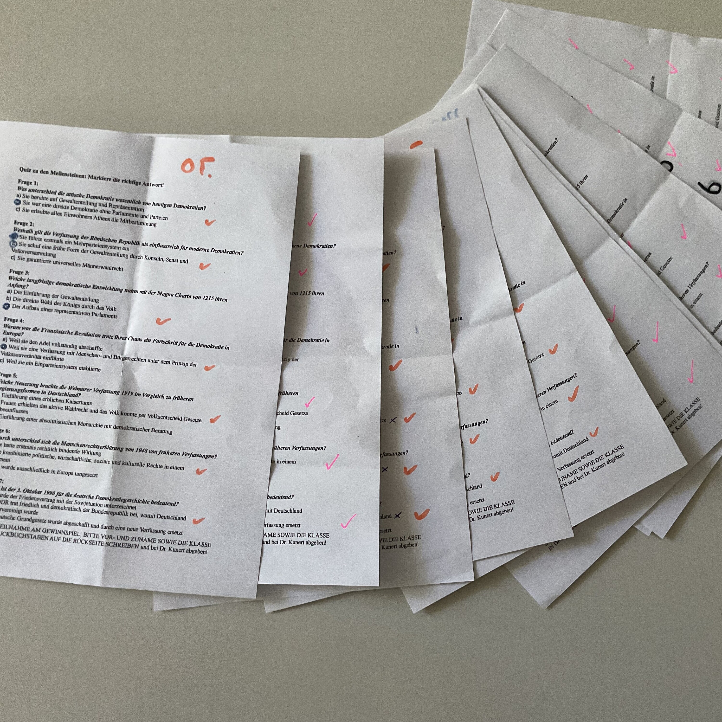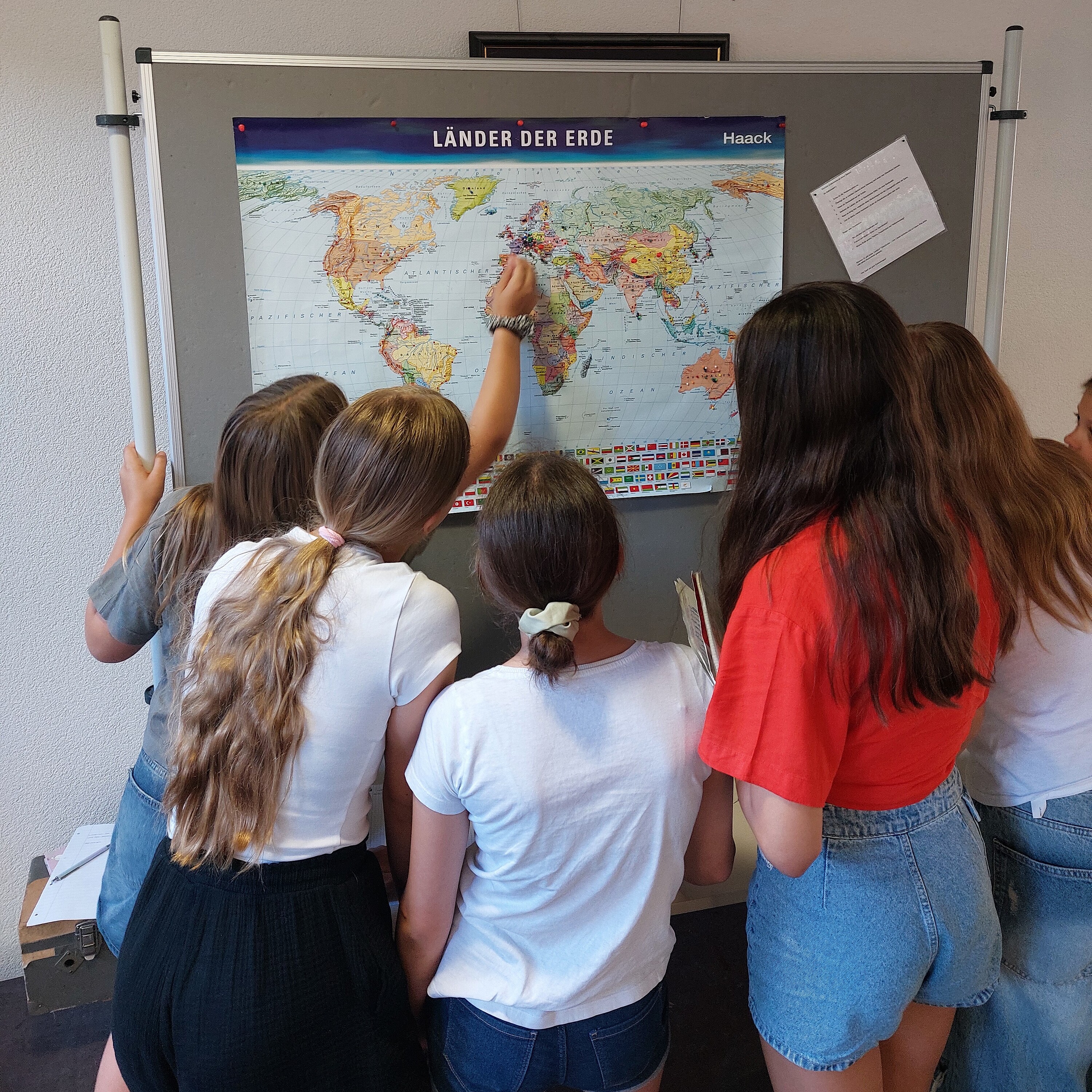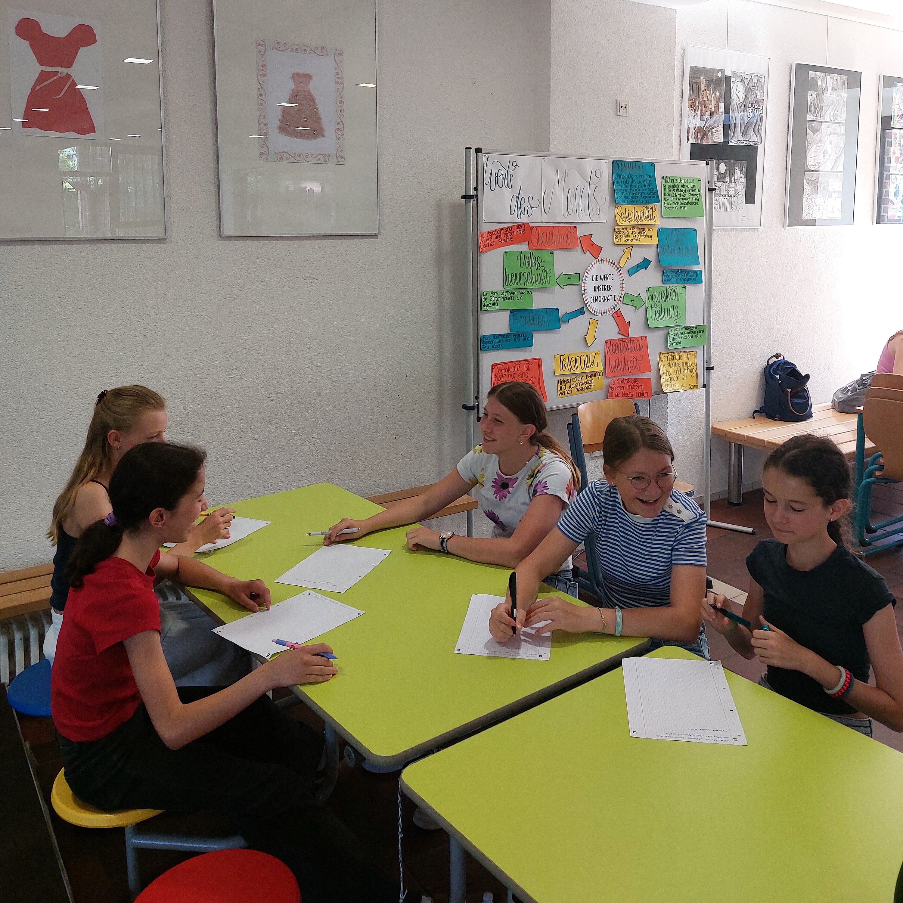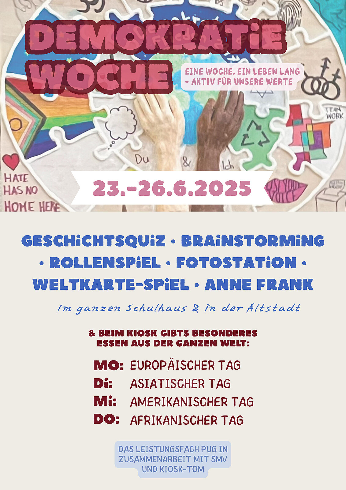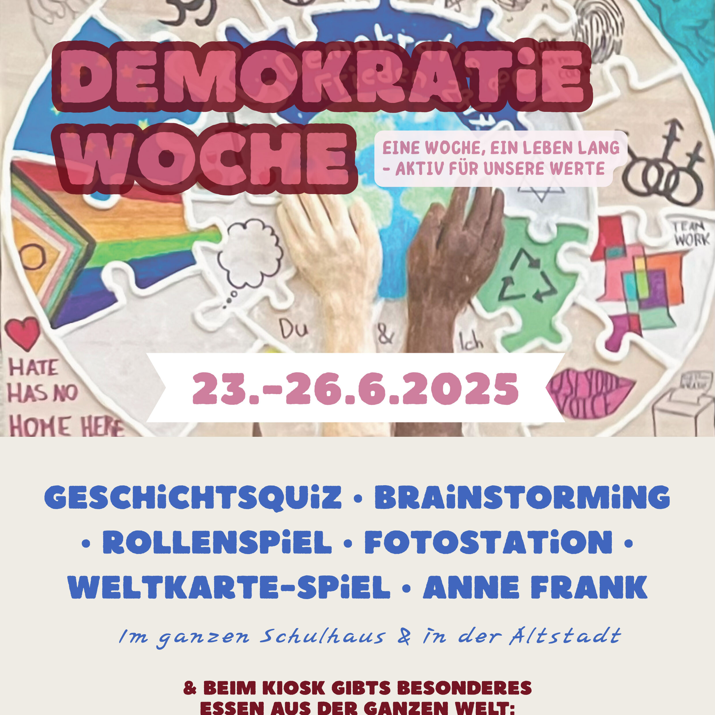 Zudem haben wir die Woche der Demokratie, vom 23.06.-27.06.2025, durchgeführt. Spannende Mitmachaktionen wurden von uns vorbereitet, z. B. eine Brainstorming-Mindmap, ein Rollenspiel, die Meilensteine der Demokratiegeschichte, eine Fotostation mit selbst gemachten Statements zur Demokratie sowie eine Weltkarte, in der unsere gesamte Schulfamilie schätzen konnte, welche Länder auf der Welt demokratisch sind. Außerdem haben wir den Anne-Frank-Tag miteinbezogen und eine Stadtrallye durch die Altstadt mit Besichtigung verschiedener Mahnmäler samt Aufgaben dazu geplant, getreu dem Motto „Jüdisches Leben sichtbar machen“.