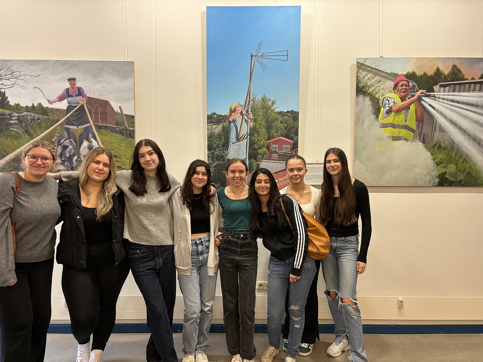 Die Exkursion begann mit dem Besuch der Stadtbücherei am Haidplatz. Dort gibt es bis einschließlich 11.05. die Möglichkeit, ausgewählte Werke der Wandmalerei von Yoseba MP aus Galicien zu bewundern. Die Wandmalereien von Yoseba Muruzábal Pérez stehen in enger Verbindung mit seiner Heimat Galicien und der Kultur dieser Region, was in dieser Ausstellung deutlich wird. Gezeigt wird eine Reihe von Gemälden und Wandbildern, in denen er einfache galicische Frauen, meist sind es Großmütter, als Heldinnen mit Superkräften darstellt: Diese metaphorische Verfremdung verweist auf die unglaubliche Vitalität und Stärke dieser Frauen, von denen viele ab dem 12. Lebensjahr hart arbeiten mussten, ohne jemals die Erfahrung von Urlaub gemacht zu haben.