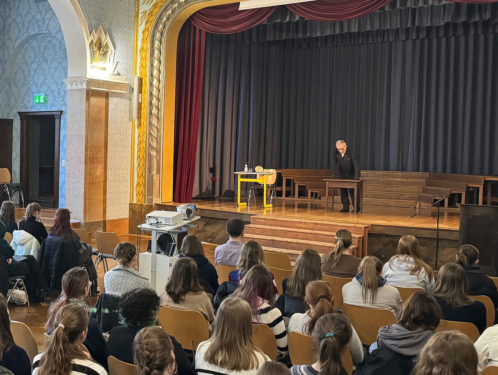 Am Mittwoch, den 10. Januar, fand an unserem Gymnasium eine außergewöhnliche literarische Veranstaltung statt: Der Schauspieler und Kabarettist Werner Steinmassl war zu einem Auftritt an die Schule gekommen und wurde im Festsaal von den Schülerinnen der Q 12 und dem Schulleiter, Dr. Hans Lindner, herzlich begrüßt.