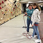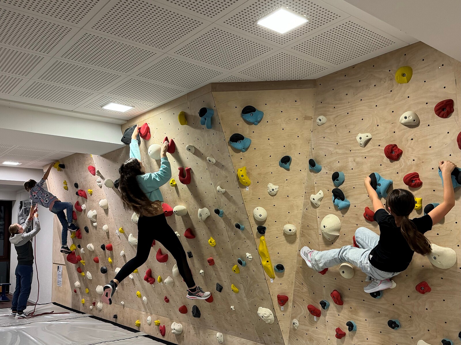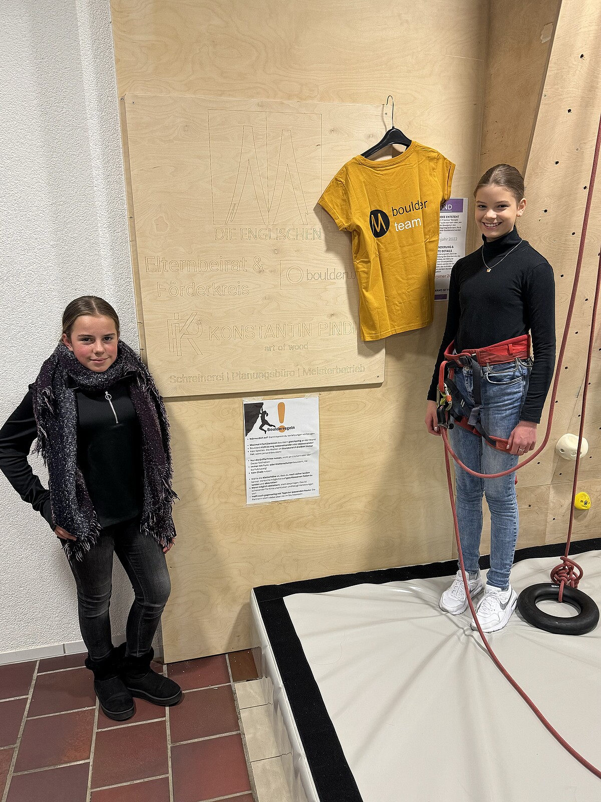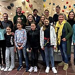 Seit ein paar Wochen ist die neue Boulderwand bereits in Benutzung, nun fand am Donnerstag, den 07.12.2023, auch noch eine Einweihungsfeier für alle Sponsoren und Mitwirkenden statt. Neben Schulleiter Herr Dr. Lindner, Vertretungen des Elternbeirats und des Förderkreises waren mit Wandbauer Konstantin Pindl, Architektin Conny Peithner und Schülerinnen des P-Seminars "Bewegte Schule", die das Projekt angestoßen hatten, fast alle Hauptverantwortlichen vor Ort. Zeitlich verhindert waren nur die Vertretung der Schulstiftung sowie die Routenschrauber der Boulderwelt Regensburg. Auch zahlreiche Lehrkräfte, Schülerinnen und Eltern, die mit tatkräftiger Unterstützung und Spenden zum erfolgreichen Gelingen des Projekts beigetragen hatten, kamen bei Punsch und Glühwein zusammen, um die neue Attraktion in der Pausenhalle zu begutachten. "Die Mischung macht’s!" - Nur durch eine derart vielfältige Unterstützung konnte das Projekt ein solcher Erfolg werden und nun zur Abwechslung im Schulalltag beitragen.