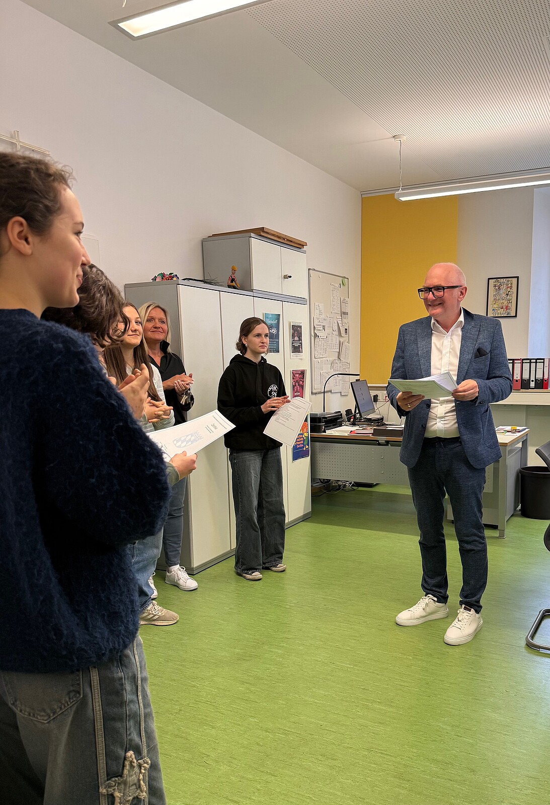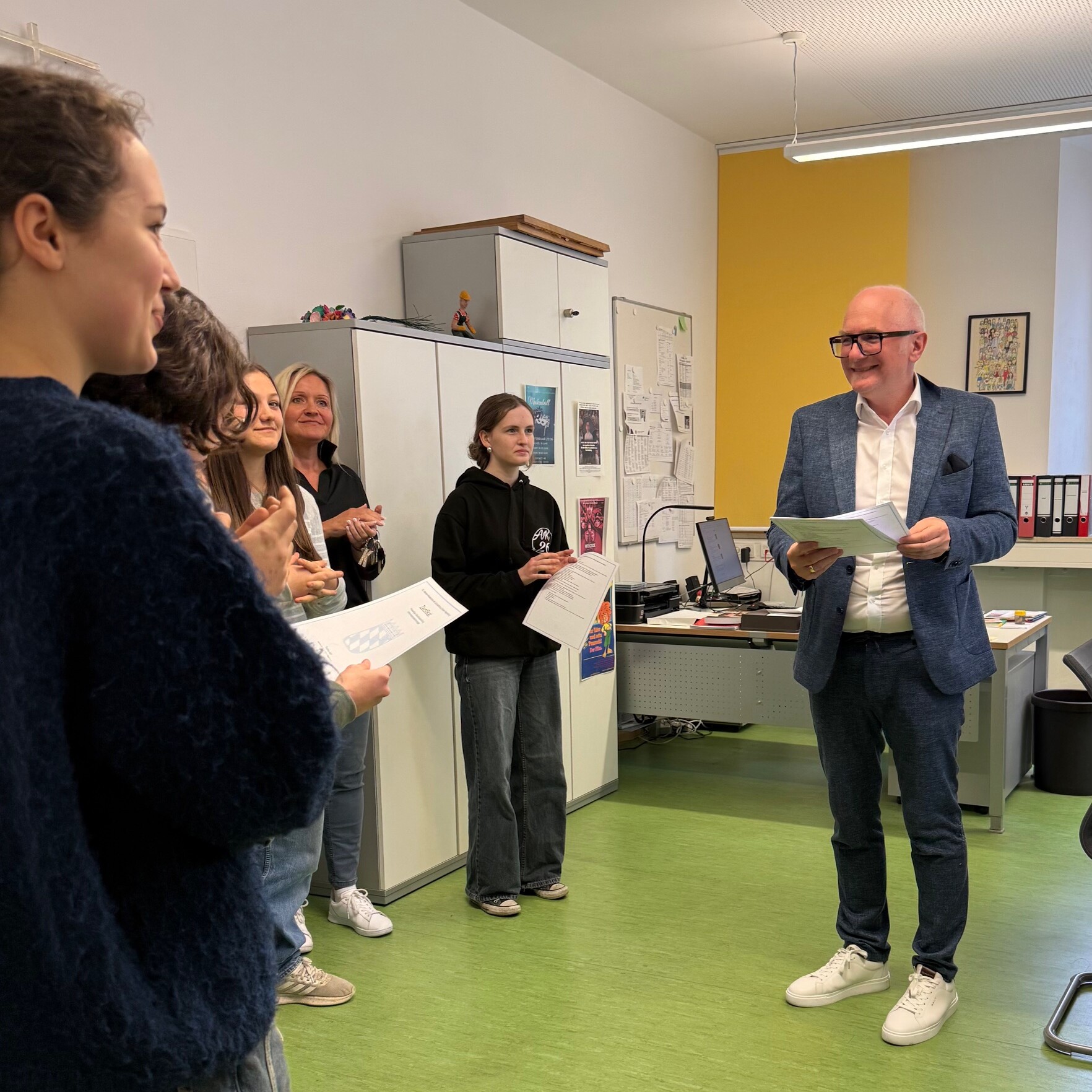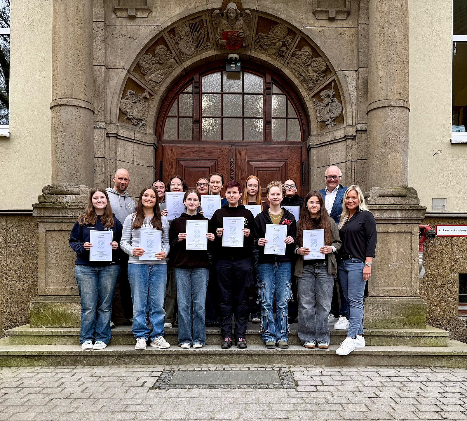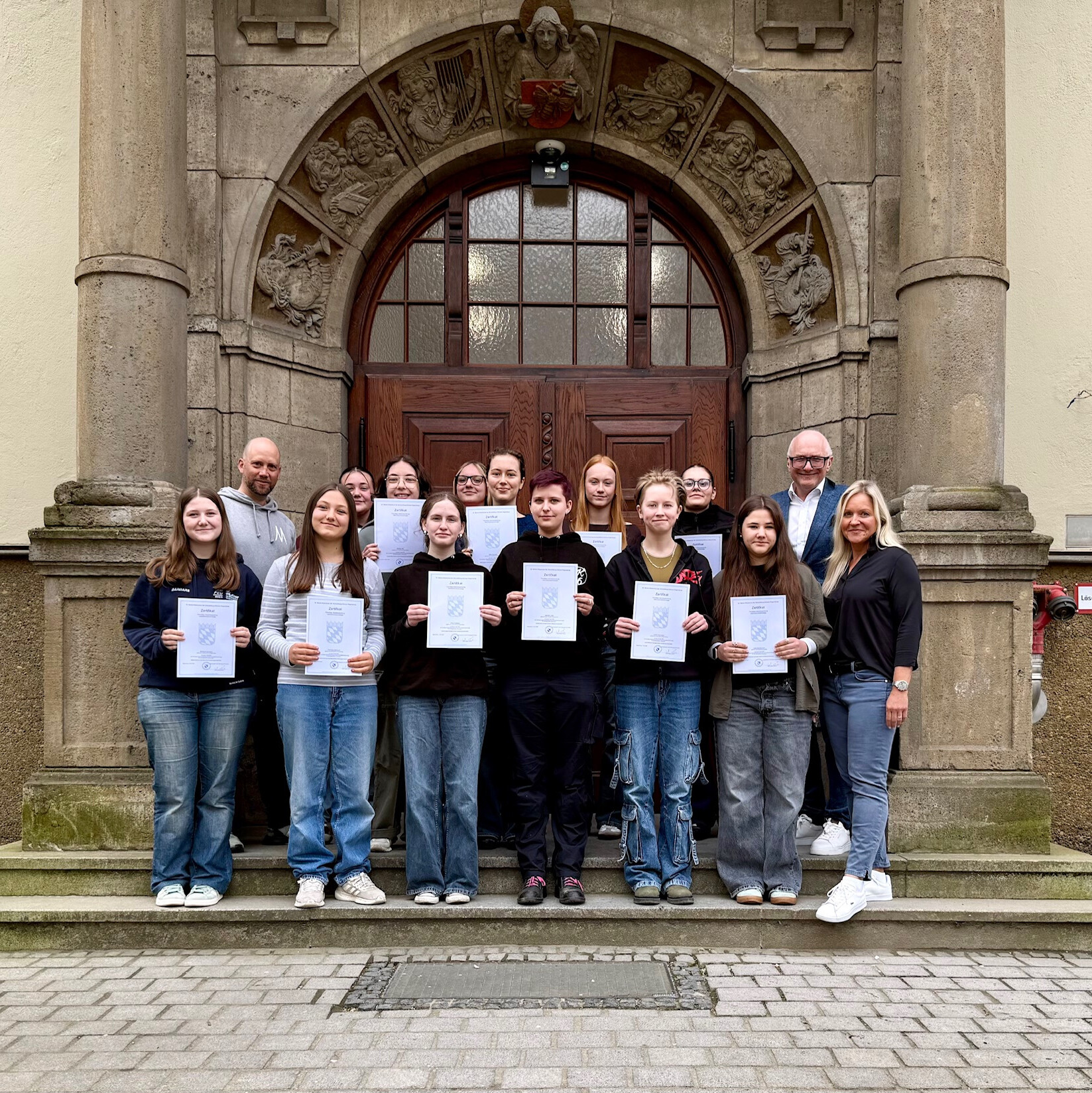 Ein besonderer Meilenstein an der St. Marien-Realschule: Am 03.03.2026 fand erstmals eine freiwillige Abschlussprüfung im Fach Informationstechnologie statt. Zwölf Schülerinnen der 10. Jahrgangsstufe stellten sich dieser Herausforderung - und das mit großem Erfolg: Alle Teilnehmerinnen bestanden die Prüfung mit Bravour. Die Grundlage für diesen Erfolg wurde bereits früh gelegt. Seit der 9. Klasse bereiteten sich die Schülerinnen in Rahmen freiwilliger Nachmittagskurse gezielt auf die Abschlussprüfung vor. Dabei konnten sie ihre IT-Kenntnisse vertiefen und praktische Fähigkeiten kontinuierlich ausbauen. Die Organisation, Vorbereitung und Durchführung der Prüfung erfolgte durch die Lehrkräfte Katja Silberhorn und Johannes Rauch, die die Schülerinnen über den gesamten Zeitraum hinweg begleiteten. Als sichtbare Anerkennung ihrer Leistung erhielten die erfolgreichen Teilnehmerinnen ihre Zertifikate aus den Händen von Schulleiter Markus Birner, der ihnen herzlich zu ihrem Engagement und ihrem Erfolg gratulierte. Mit der erstmaligen Durchführung dieser Prüfung setzt die St. Marien-Realschule ein starkes Zeichen für die Förderung digitaler Kompetenzen.