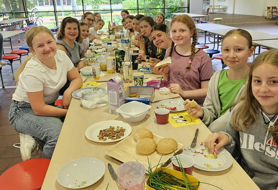 Am 10.06.2024 haben die evangelischen Schülerinnen der G 6A und der G 6B mit Frau Dr. Kunert ein Frühstück gemacht, mit Speisen und Getränken, die es zu Jesu Zeiten schon gab. Louise N. und Louise R. erzählten: „Auf dem reichlich gedeckten Tisch standen oder lagen Fladenbrot, Äpfel, Nüsse, Marmelade, Milch, Brot mit Schnittlauch, Honig, Trauben, Traubensaft und noch vieles mehr.“ Matzen durften selbstverständlich auch nicht fehlen. Charlotte berichtete: „Mir hat besonders gut gefallen, dass wir alle gemeinsam an einem Tisch saßen und jeder etwas zum Essen oder Trinken mitgebracht hat.“ Der Tisch war gut gefüllt! „Wir sind beeindruckt, dass es zu Jesu Zeiten so viele verschiedene Speisen gab“, erklärten Lilja und Amelie. Fast alles wurde aufgegessen, denn alle Schülerinnen hatten großen Frühstückshunger mitgebracht. „Wir hätten nicht gedacht, dass es zu dieser Zeit schon Haferkekse gegeben hat, sie schmeckten uns sehr gut“, berichteten Johanna sowie Theresia und ergänzten: „Das Frühstück wie zu Jesu Zeiten war eine tolle Erfahrung.“