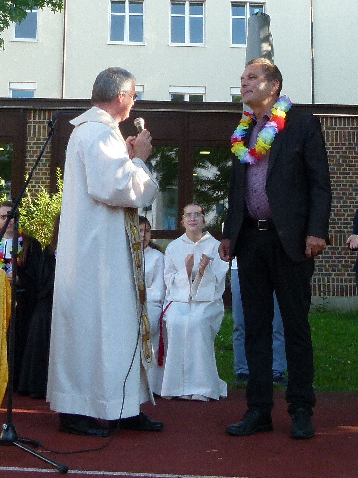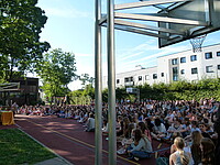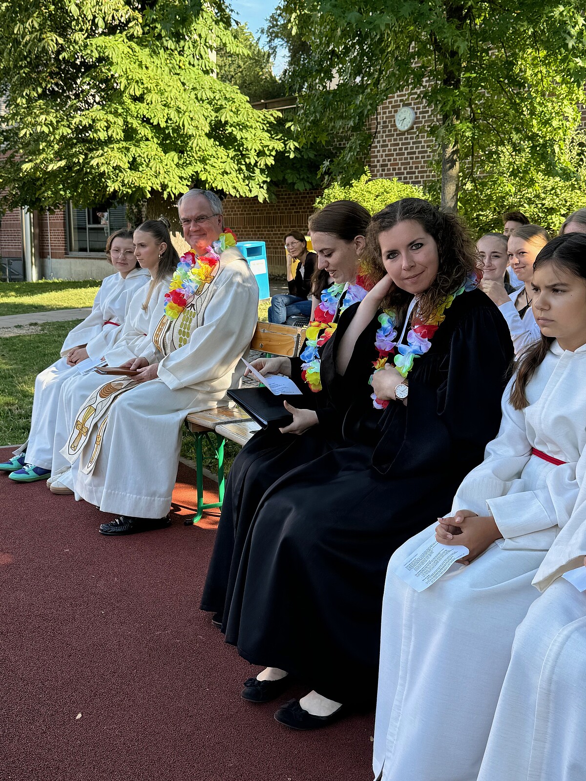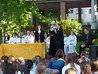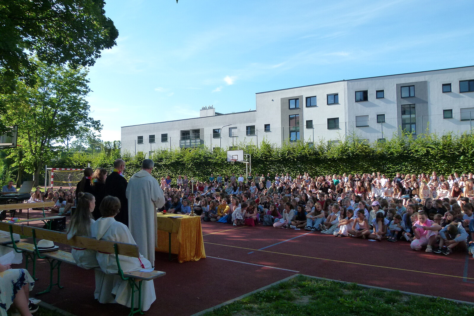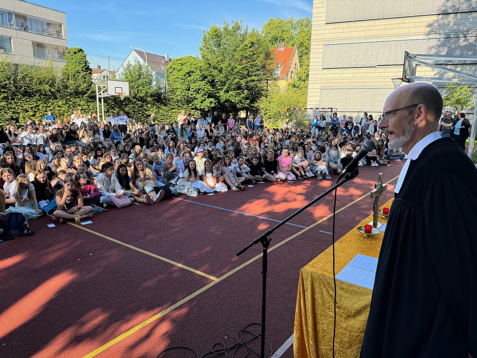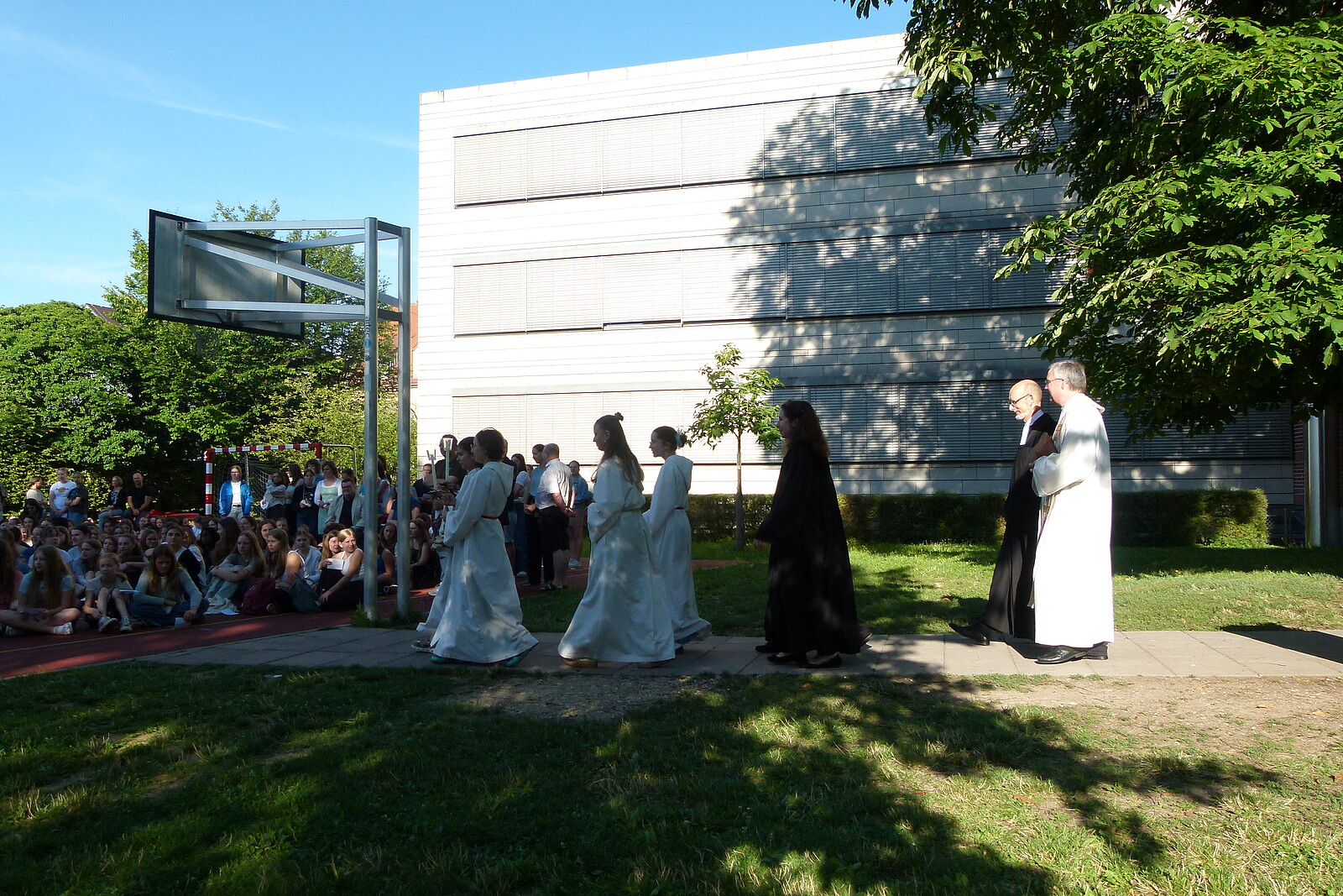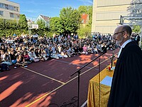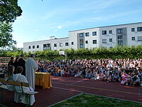 Für die St. Marien-Schulen ist es inzwischen gute Tradition sich am letzten Schultag vor der Zeugnisausgabe zur Danksagung bei Gott auf dem Sportplatz zu versammeln, um mit Gottes Segen in die Ferien zu gehen. Pfarrer Müller und die Vikarinnen Babucke und Dorer erarbeiteten in einer Dialogpredigt ausgehend vom Galaterbrief 5,1 das Thema „Frei-Sein“, was als uneingeschränktes Geschenk Gottes an uns Menschen verstanden werden darf. Domvikar Albert wandte diesen Wunsch, der zunächst für die ganze Schulfamilie „Ferien“ bedeutet auf OStD Dr. Lindner an, der mit diesem Gottesdienst definitiv seinen Ruhestand mit großem Dank und besten Wünschen der gesamten Schulgemeinschaft antritt. Nach Dankesworten des Schulleiters an sein Direktoratsteam und alle Mitglieder unserer Schulen war auch unsere Schulband ein letztes Mal in gewohnter Zusammensetzung zu hören, denn auch hier scheiden zahlreiche Abiturientinnen mit diesem Schuljahresende definitiv aus. Mit dem Segen Gottes wurde allen Gottes gutes Geleit zugesagt, was mit großer Freude zur Zeugnisausgabe in den Klassenzimmern und dann in die Freiheit der Ferien führte…!!