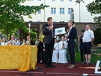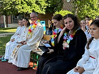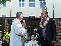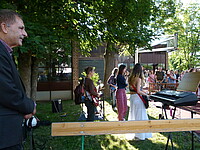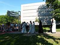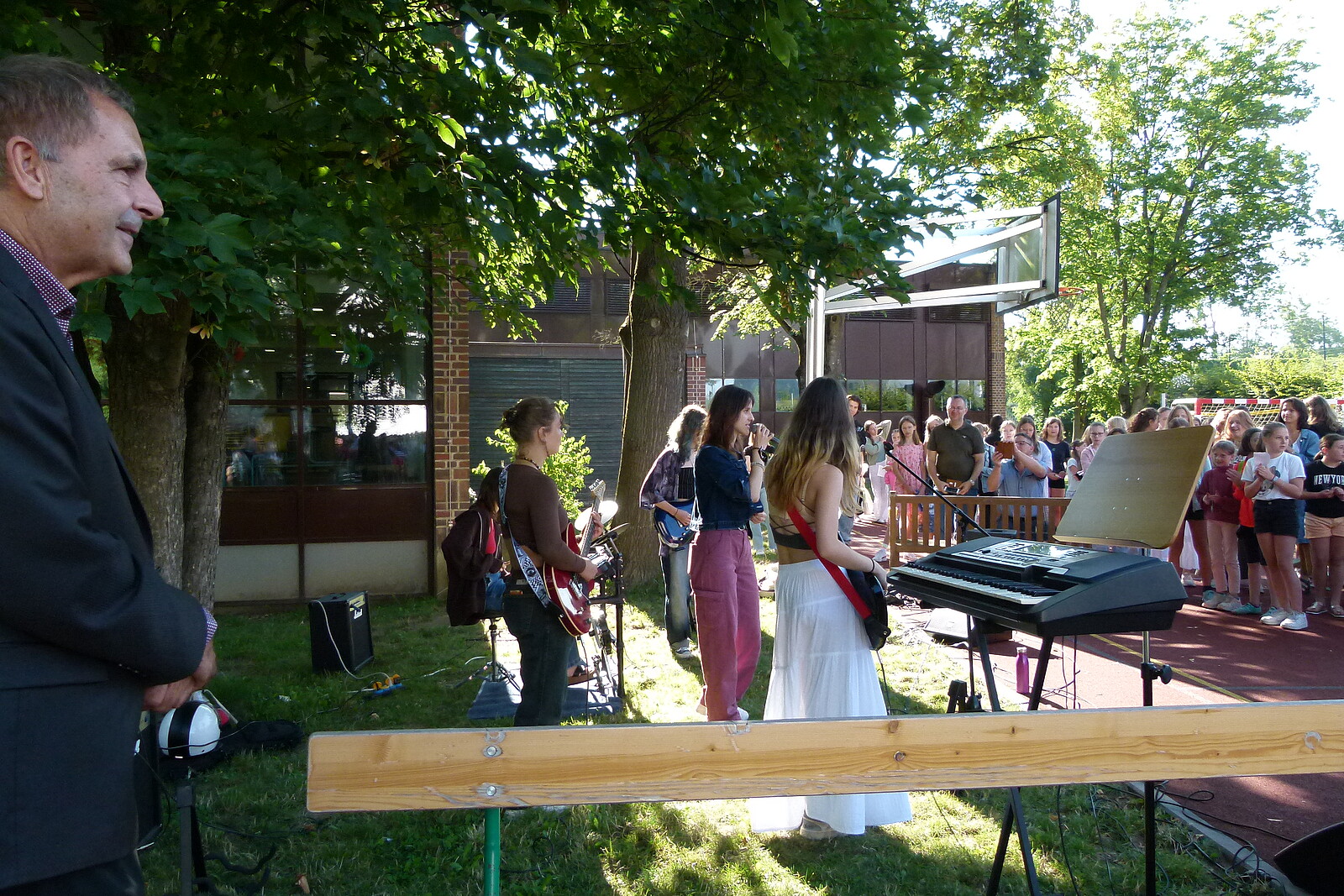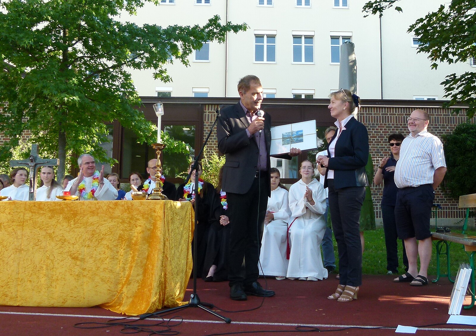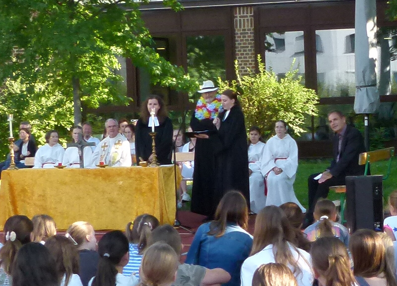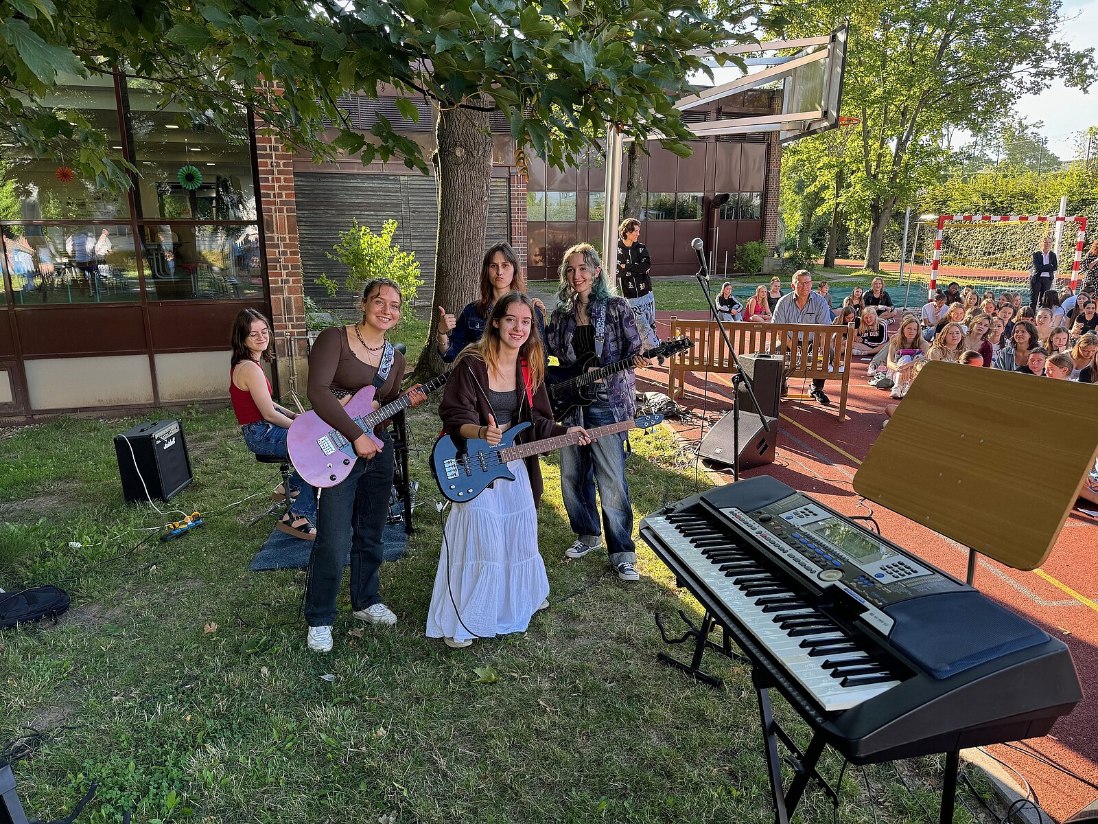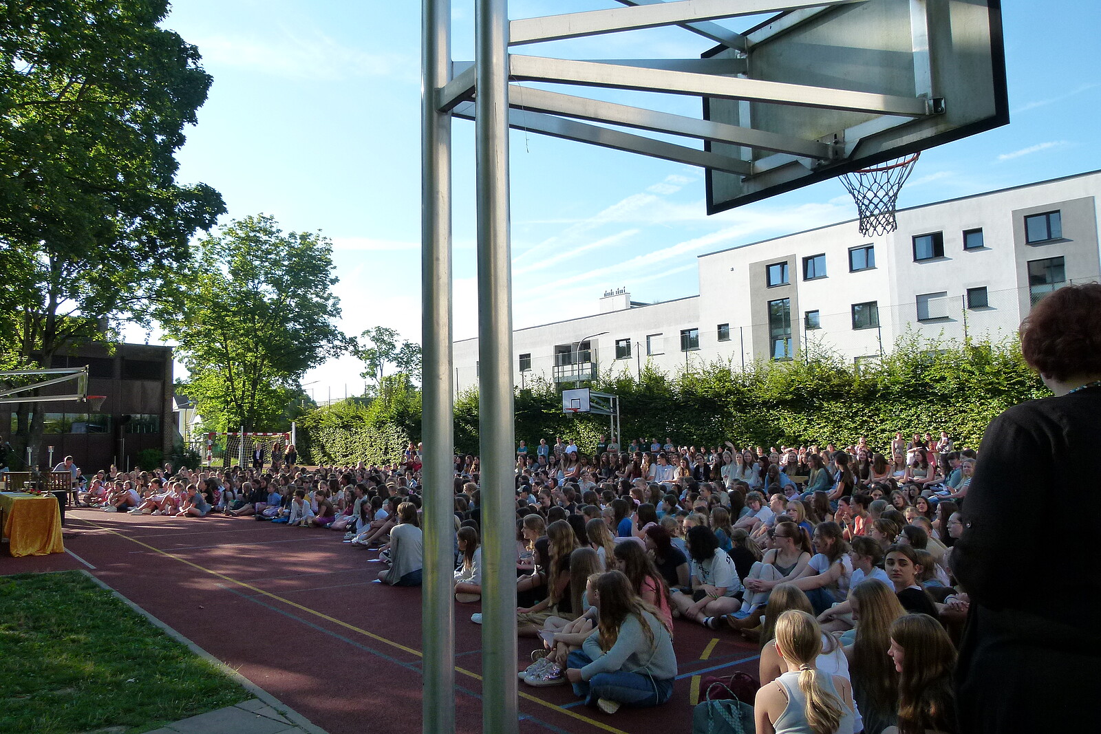 Für die St. Marien-Schulen ist es inzwischen gute Tradition sich am letzten Schultag vor der Zeugnisausgabe zur Danksagung bei Gott auf dem Sportplatz zu versammeln, um mit Gottes Segen in die Ferien zu gehen. Pfarrer Müller und die Vikarinnen Babucke und Dorer erarbeiteten in einer Dialogpredigt ausgehend vom Galaterbrief 5,1 das Thema „Frei-Sein“, was als uneingeschränktes Geschenk Gottes an uns Menschen verstanden werden darf. Domvikar Albert wandte diesen Wunsch, der zunächst für die ganze Schulfamilie „Ferien“ bedeutet auf OStD Dr. Lindner an, der mit diesem Gottesdienst definitiv seinen Ruhestand mit großem Dank und besten Wünschen der gesamten Schulgemeinschaft antritt. Nach Dankesworten des Schulleiters an sein Direktoratsteam und alle Mitglieder unserer Schulen war auch unsere Schulband ein letztes Mal in gewohnter Zusammensetzung zu hören, denn auch hier scheiden zahlreiche Abiturientinnen mit diesem Schuljahresende definitiv aus. Mit dem Segen Gottes wurde allen Gottes gutes Geleit zugesagt, was mit großer Freude zur Zeugnisausgabe in den Klassenzimmern und dann in die Freiheit der Ferien führte…!!