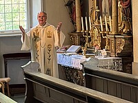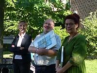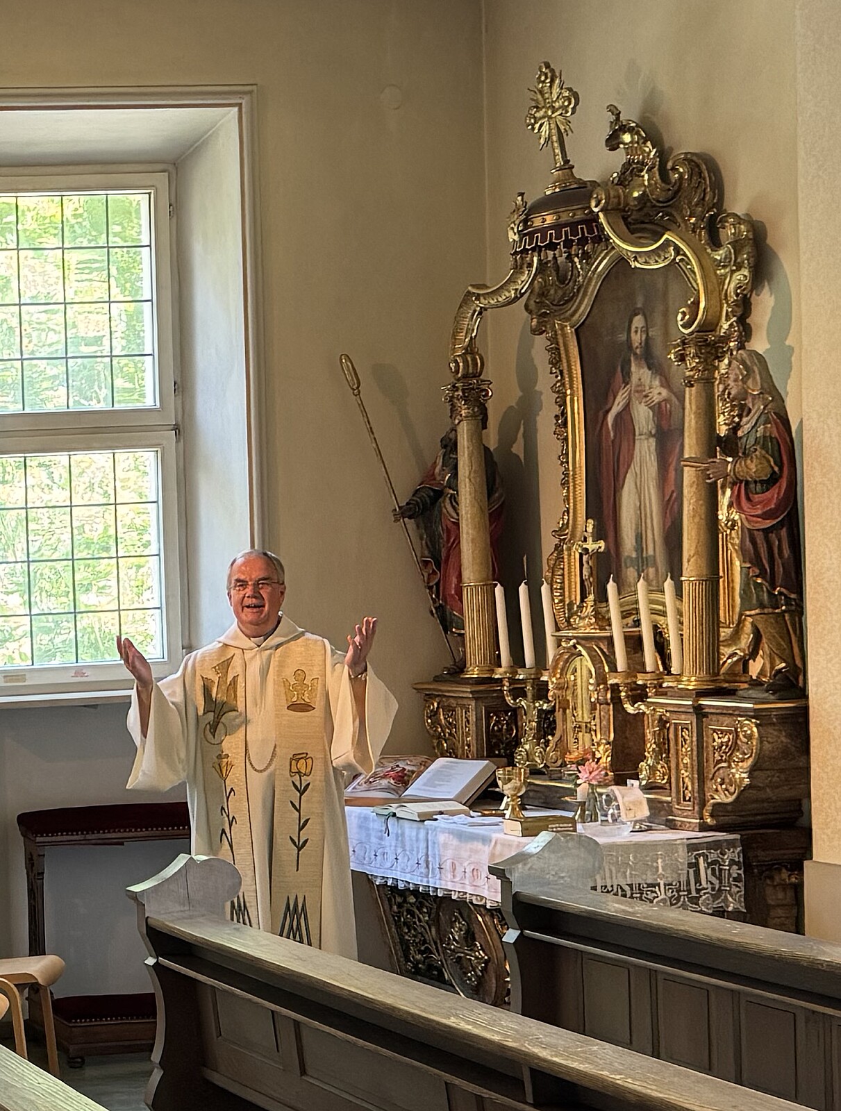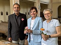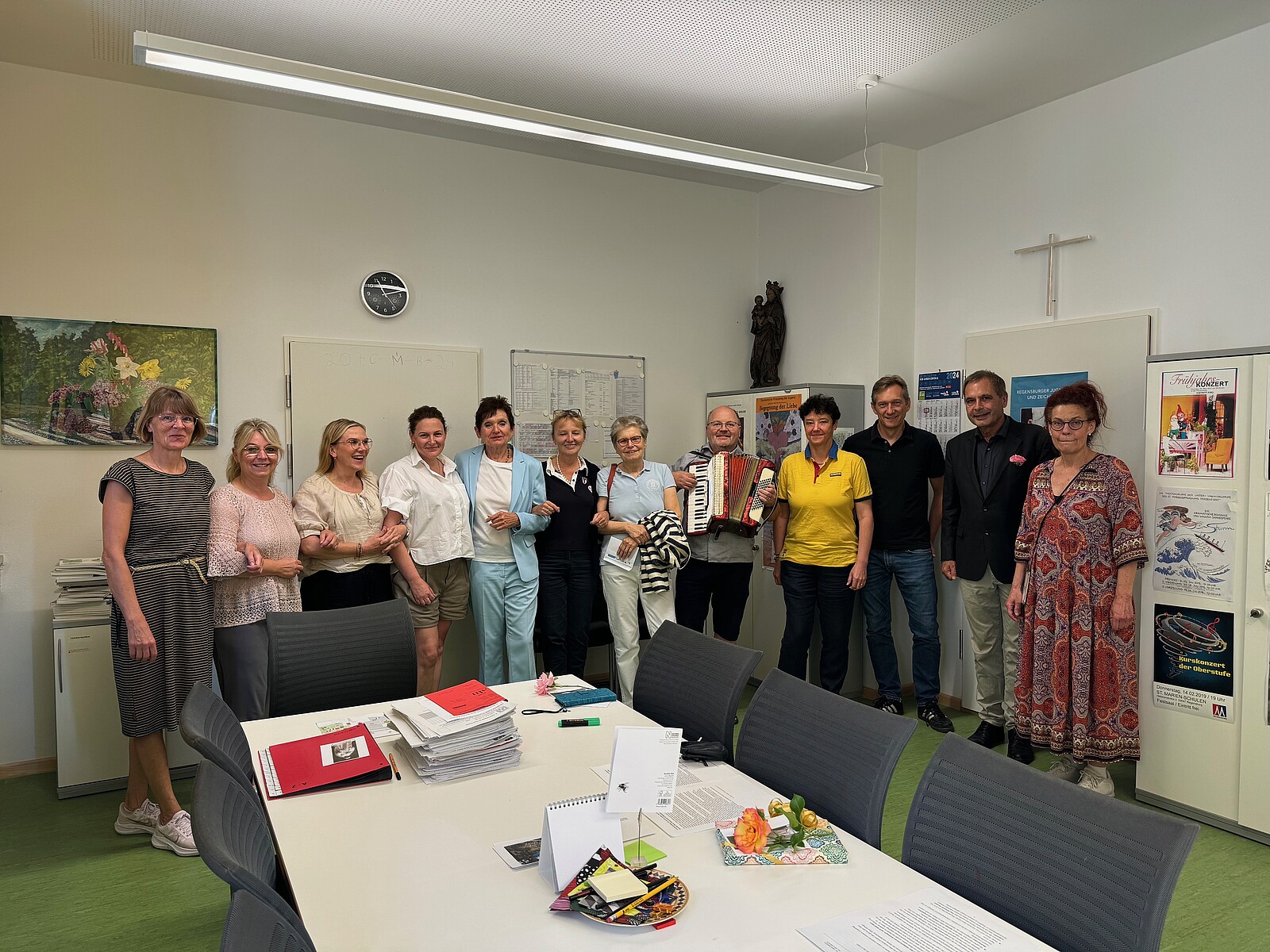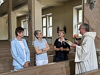 Bereits am Tag vorher trafen sich in aller Stille des Wandertages die ausscheidenden Lehrkräfte: OStRin B. Mathe nach 34 Dienstjahren und Fachoberlehrerin P. Gührs nach 28 Dienstjahren in der Schulkirche, um Abschied mit einer Eucharistiefeier zu Ehren der Schulpatronin, der hl. Anna, und einem abschließenden „Adieu“ im Direktorat zu nehmen.