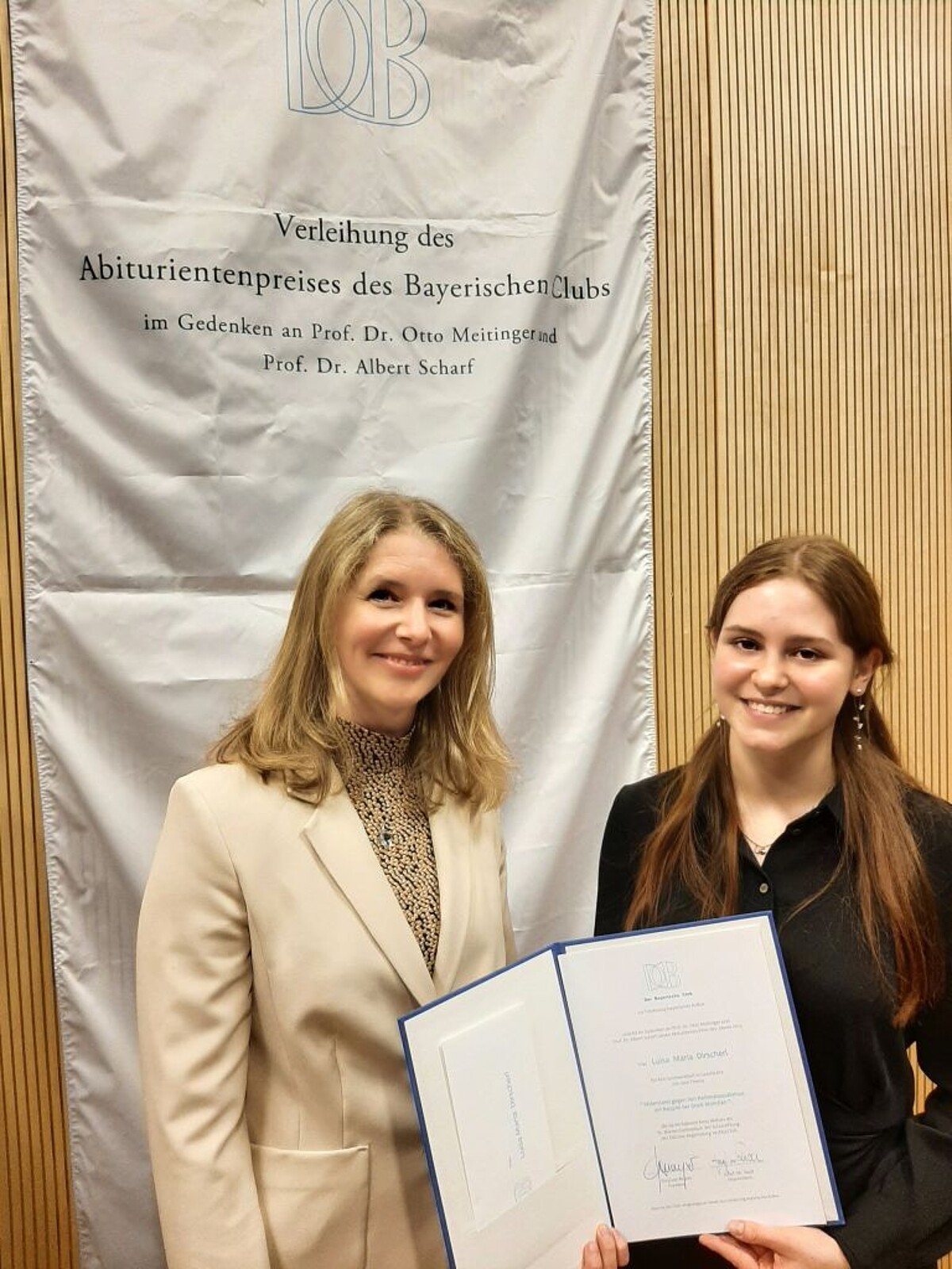 Die Jury des Abiturientenpreises des Bayerischen Clubs zur Förderung der bayerischen Kultur zeichnete 2023 bereits zum 24. Mal sieben Abiturienten und Abiturientinnen aus ganz Bayern aus, die sich im Rahmen ihrer W-Seminare intensiv mit einem kultur- und geschichtsbezogenen bayerischen Thema befasst haben. Für ihre herausragende Arbeit zum „Widerstand gegen den Nationalsozialismus am Beispiel der Stadt München“ im Rahmen des W-Seminars „Bayern im Nationalsozialismus“ bei StRin i. K. Judith Moser erhielt Luisa diesen Preis am 22. September im Rahmen eines feierlichen Festakts in München für den Gymnasialbezirk Oberpfalz. Die Präsidenten des Bayerischen Clubs lobten die hohe Qualität der ausgezeichneten Arbeiten ebenso wie die Präsidentin des Bayerischen Landtags, Ilse Aigner, sowie der Bayerische Staatsminister für Unterricht und Kultus, Prof. Dr. Michael Piazolo, die den Preisträgern und Preisträgerinnen gratulierten und für ihr großes Engagement dankten.