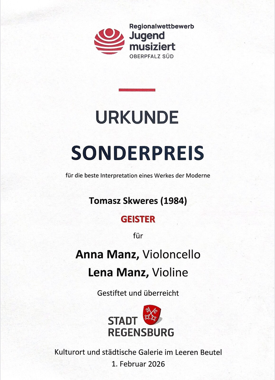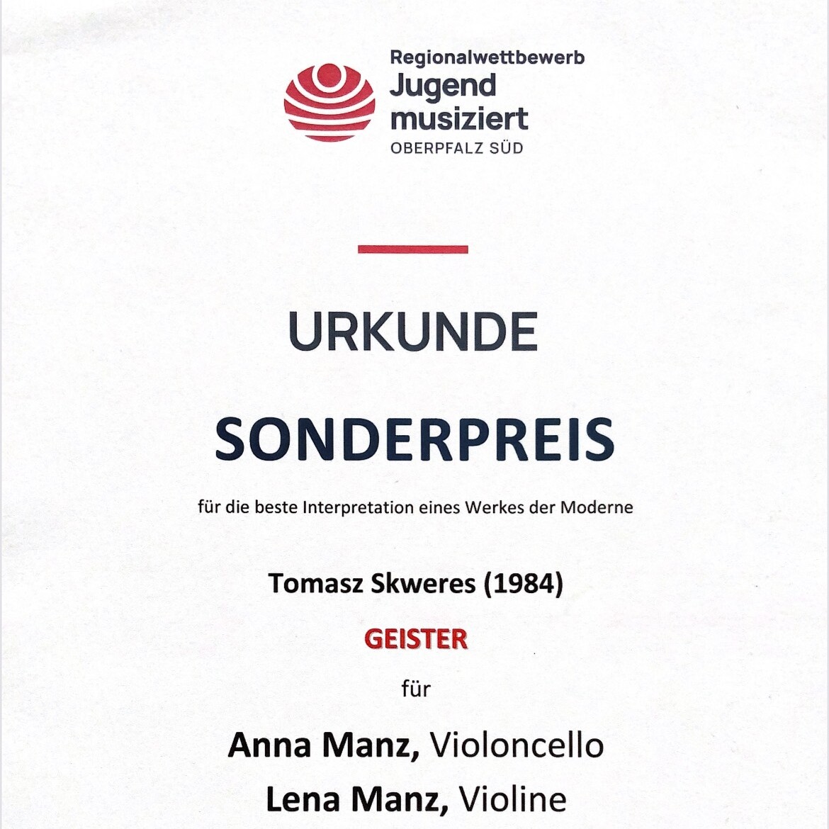 Zusätzlich wurden die beiden mit dem Sonderpreis für die beste Interpretation eines Werkes der Moderne ausgezeichnet. Diesen Preis erhielten sie für das Stück „Geister“, welches der in Regensburg lebende Komponist Tomasz Skweres für die Schwestern komponiert hat.