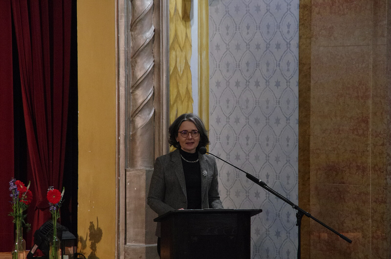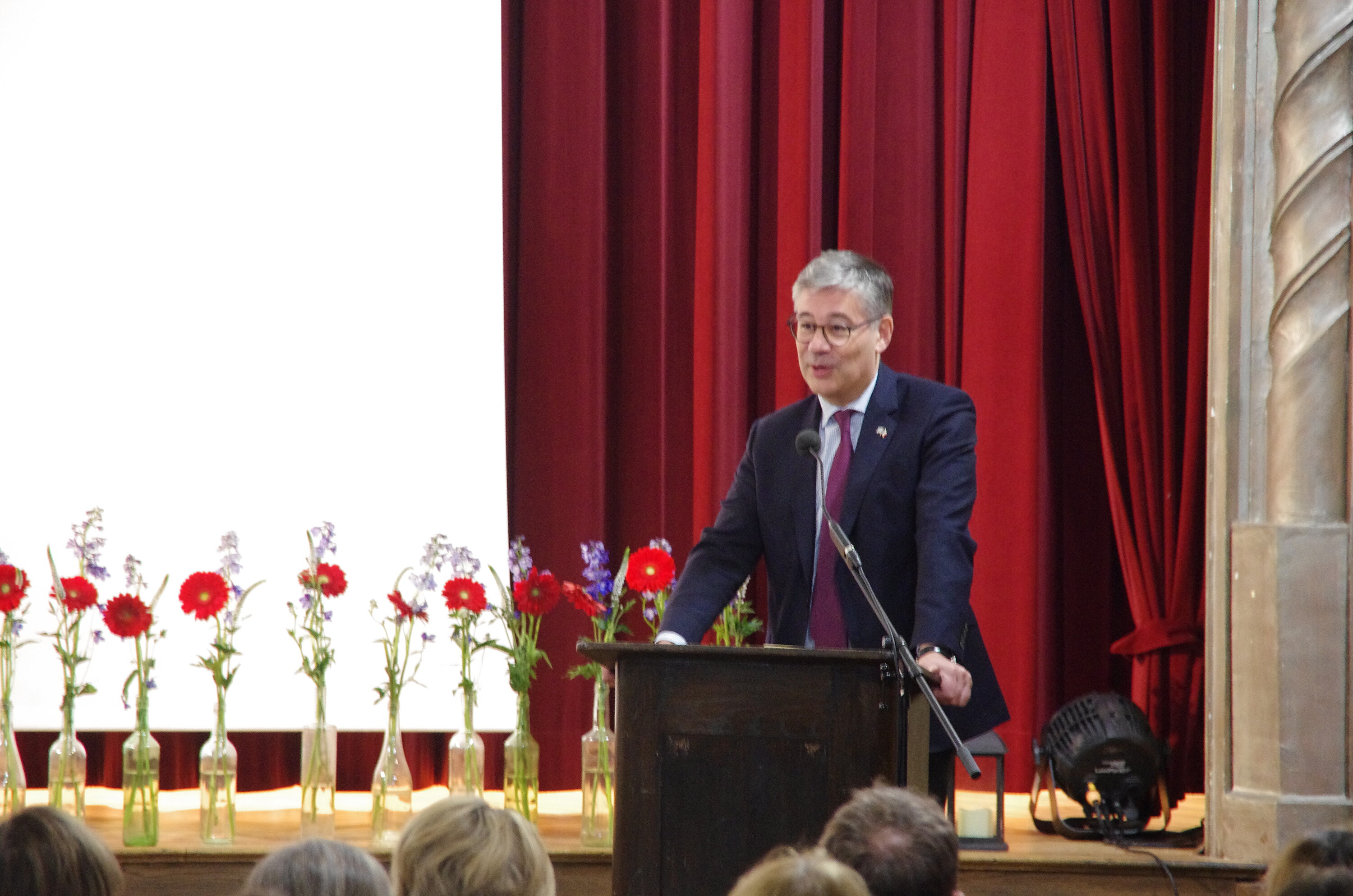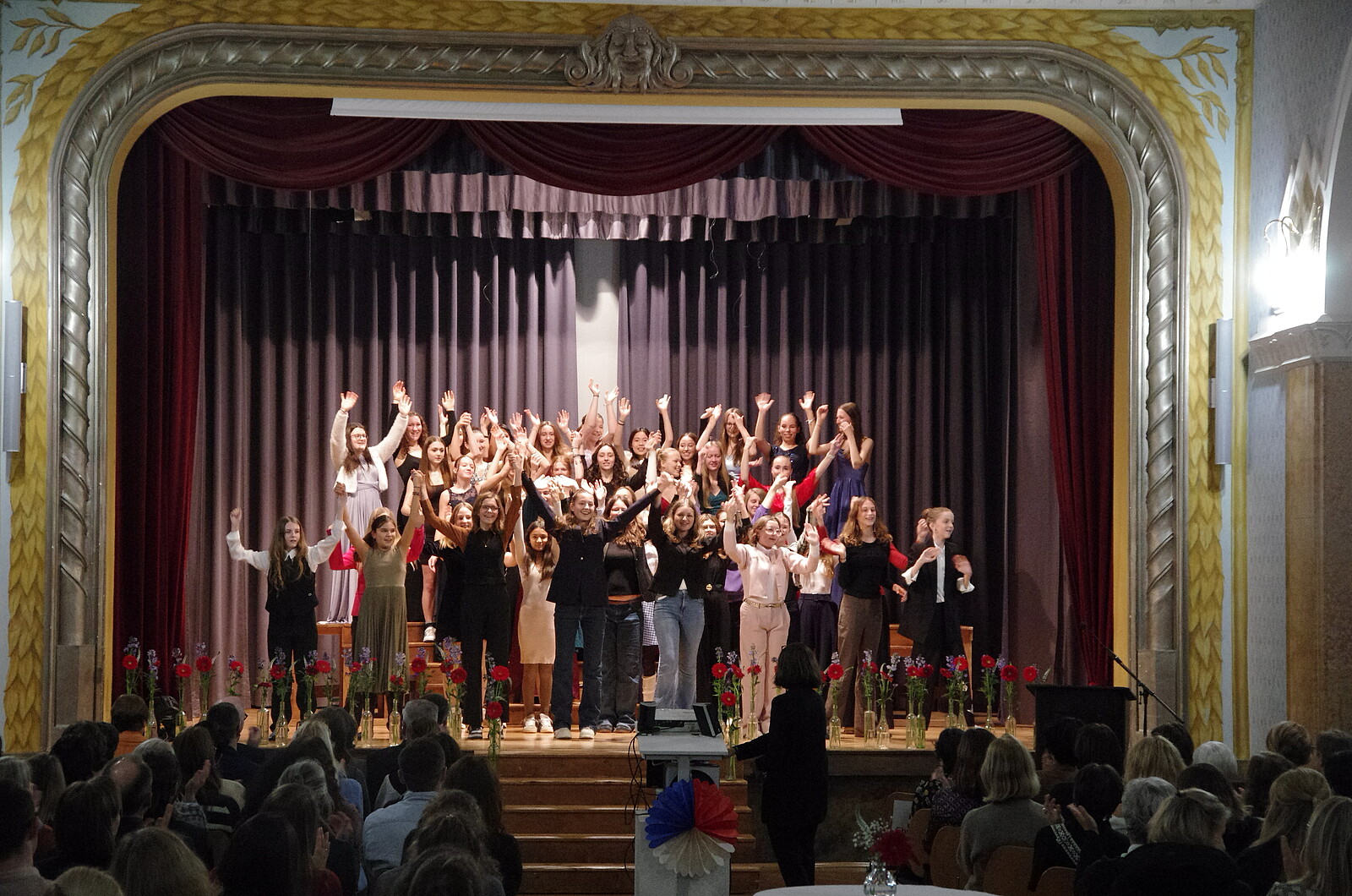 Am 27. November 2024 gab der französische Generalkonsul aus München, Herr Alexandre Vulic, einen Empfang für die Französisch-Fachbetreuer und Fachbetreuerinnen der Oberpfalz. Dabei bot der Festsaal der St. Marien-Schulen einen feierlichen Rahmen. Die Veranstaltung begann um 15:30 Uhr mit zwei Fortbildungen des Institut Français aus München. Lena Manz eröffnete das Programm des Empfangs mit einer fulminanten Interpretation von Cécile Chaminades Romanza. Im Anschluss folgte das Grußwort des Gastgebers, Herrn Markus Birner, gefolgt von den Begrüßungen von Alexandre Vulic, Frau Astrid Barbeau und einer Videobotschaft der bayerischen Ministerin für Unterricht und Kultus Anna Stolz. Für Unterhaltung sorgte das spritzige Schauspiel „Damengespräche im Elysium“ von Schülerinnen der G 11A. Drei Frauen des 19. Jahrhunderts, Cécile Chaminade (Komponistin), Madame de Staël (Schriftstellerin) und Suzanne Valadon (Künstlerin) treffen sich nach ihrem Ableben im Himmel und unterhalten sich über die Kunst, die Rolle der Frau und generell über das Leben. Anna Manz beeindruckte das Publikum mit ihrer Cello-Performace Trois pièces pour violoncelle et piano von Nadia Boulanger. Zum Schluss stimmte die G 8C und G 10C das Überraschungslied „Je ne parle pas français“ von Namika und Black M. an. Das Publikum genoss anschließend die kulinarische Verköstigung unseres Schulkochs, Herrn Ebert. Wir bedanken uns für die rege Teilnahme an der Veranstaltung und für den gelungenen Abend.