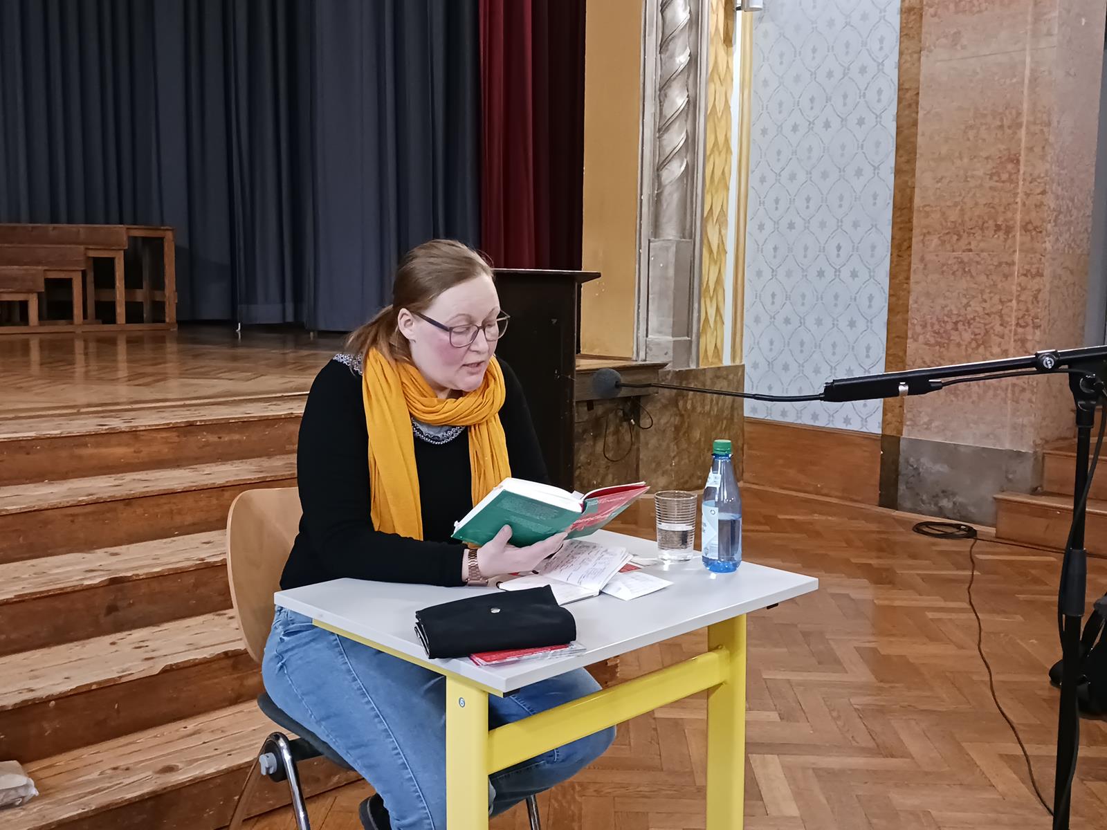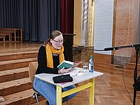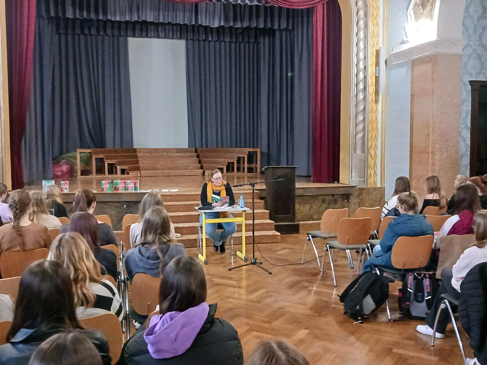 Am 29. Februar 2024 fand für die 10. Klassen des Gymnasiums und der Realschule eine Lesung mit der Regensburger Theaterpädagogin und Jugendbuchautorin Agnes Gerstenberg statt, welche den Schülerinnen im Festsaal ihren Debütroman „Unberührt“ vorstellte.
