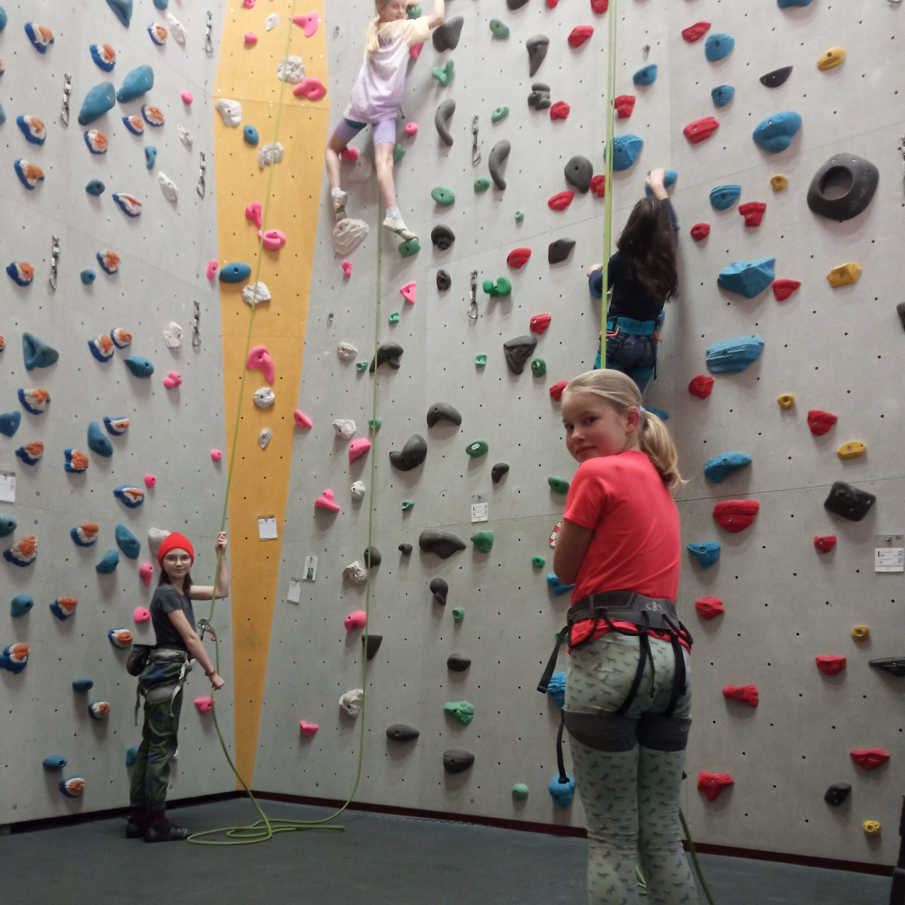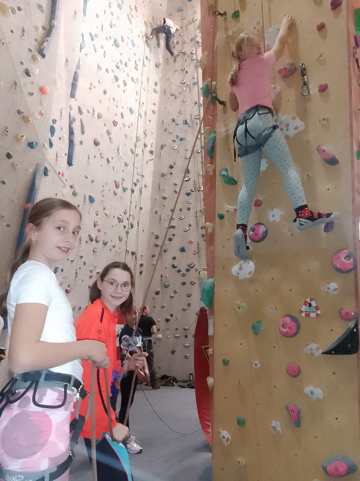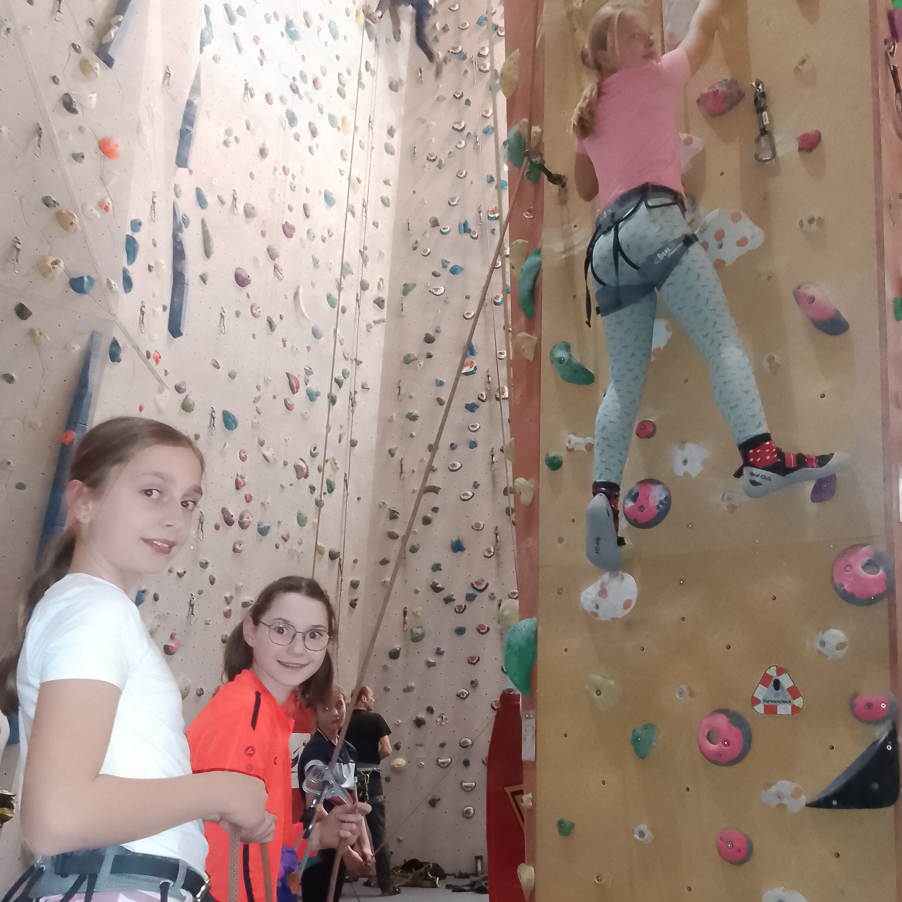 Nach diesem Motto starteten nach den Herbstferien die beiden Kletterkurse (November 2024- März 2025) im Kletterzentrum Lappersdorf. Dieses Jahr unterstützt uns ein Trainer des deutschen Alpenvereins, um der großen Anzahl an Schülerinnen das Sichern zu erlernen und die Klettertechnik zu verbessern. Schon recht schnell sind die Berggämsen so fit, dass sie sich gegenseitig beim Klettern sichern und diverse Gipfel in der Kletterhalle erklimmen können. Die Mädchen lernen außerdem Verantwortung zu übernehmen, sich zu konzentrieren und Gefahren einzuschätzen. Zudem verbessern die Schülerinnen ihre koordinativen, konditionellen und auch kognitiven Fähigkeiten beim gemeinsamen Kraxeln in Lappersdorf.