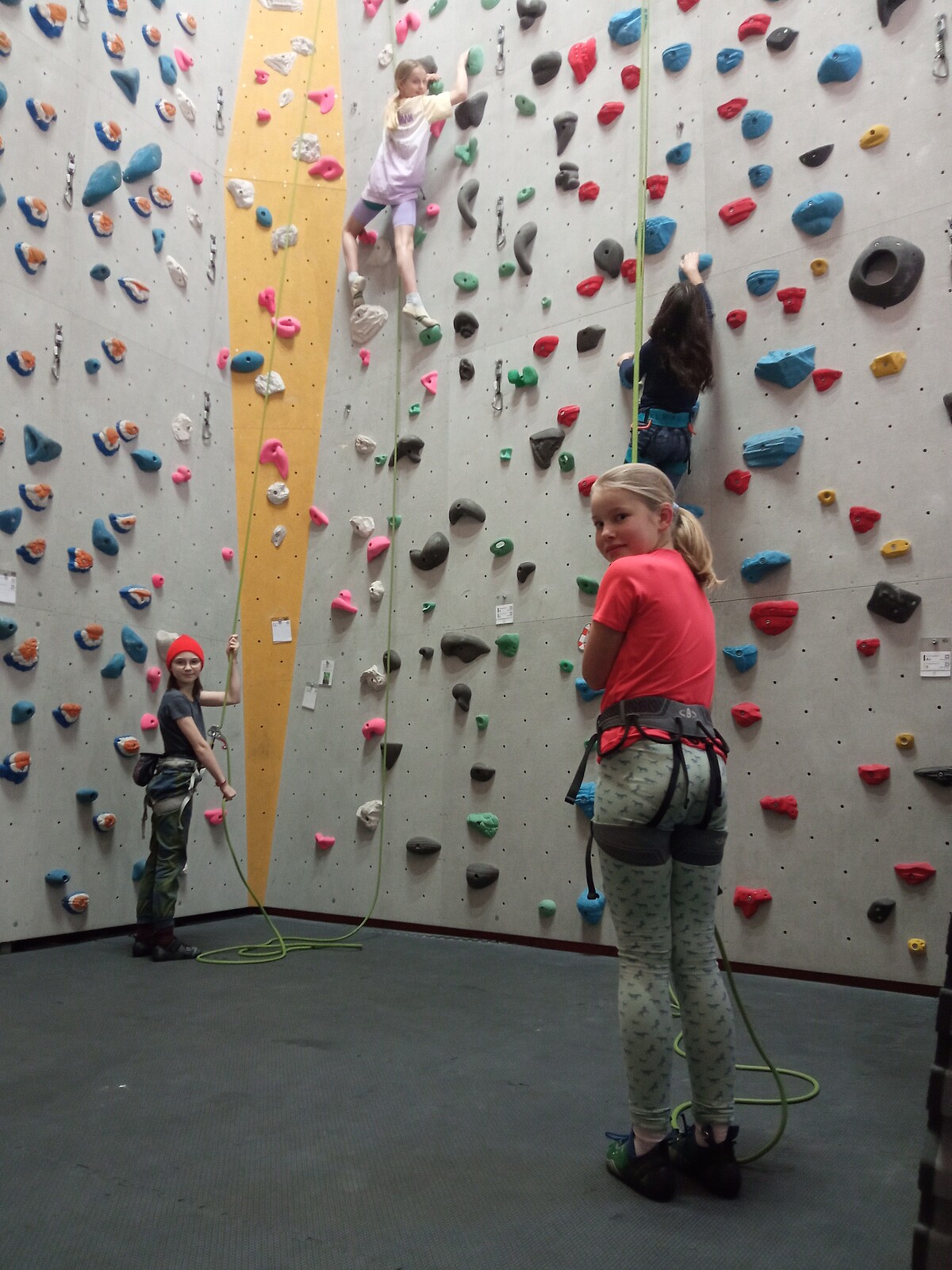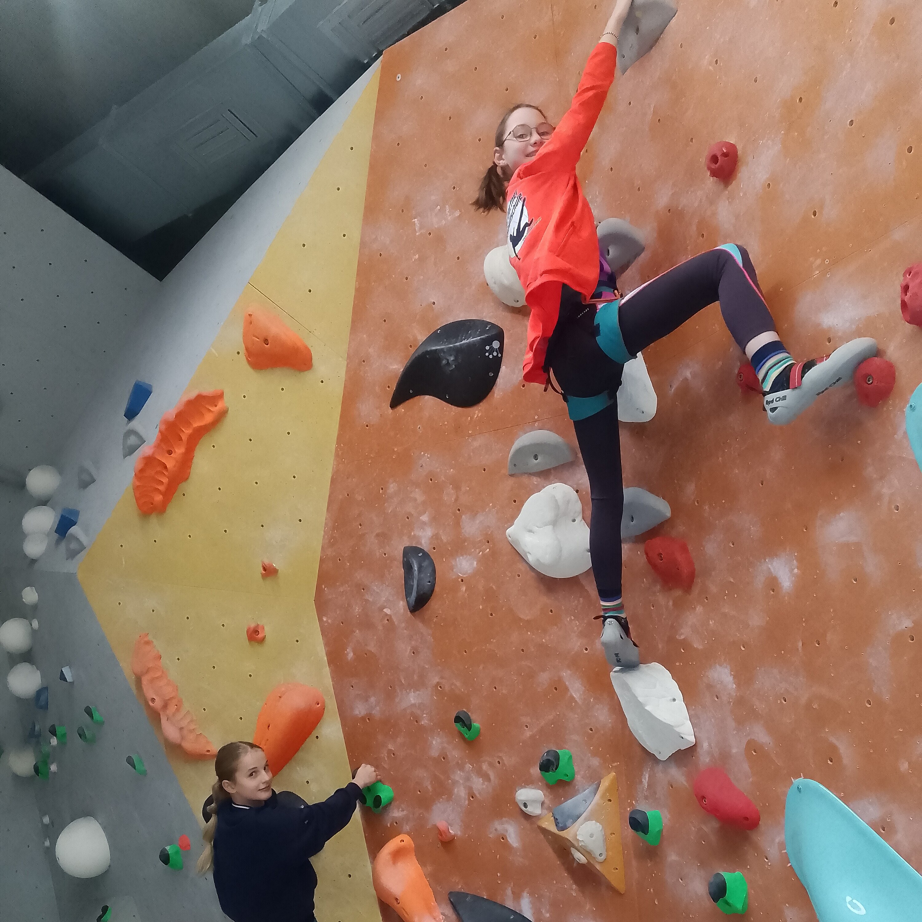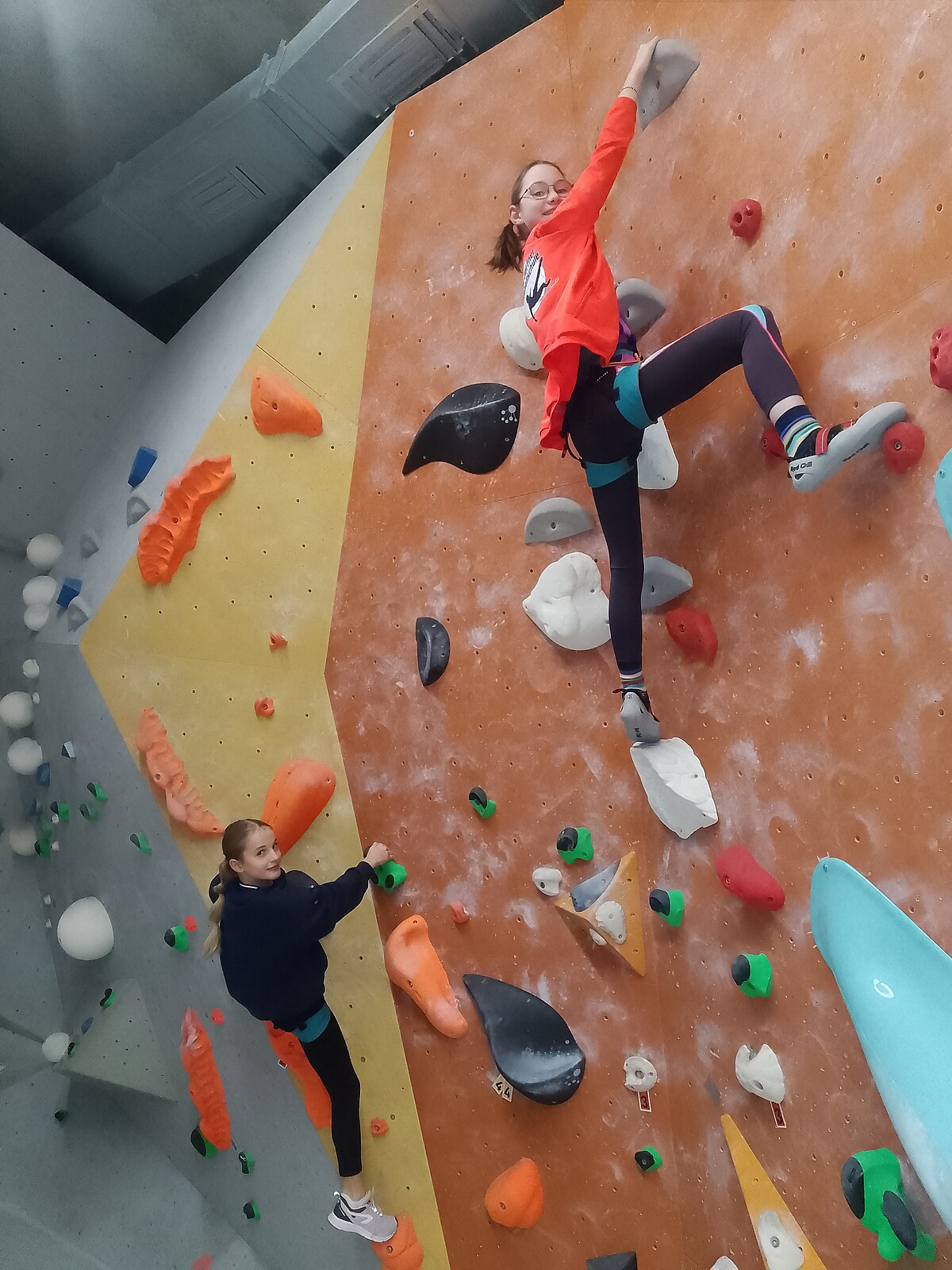 Nach diesem Motto starteten nach den Herbstferien die beiden Kletterkurse (November 2024- März 2025) im Kletterzentrum Lappersdorf. Dieses Jahr unterstützt uns ein Trainer des deutschen Alpenvereins, um der großen Anzahl an Schülerinnen das Sichern zu erlernen und die Klettertechnik zu verbessern. Schon recht schnell sind die Berggämsen so fit, dass sie sich gegenseitig beim Klettern sichern und diverse Gipfel in der Kletterhalle erklimmen können. Die Mädchen lernen außerdem Verantwortung zu übernehmen, sich zu konzentrieren und Gefahren einzuschätzen. Zudem verbessern die Schülerinnen ihre koordinativen, konditionellen und auch kognitiven Fähigkeiten beim gemeinsamen Kraxeln in Lappersdorf.