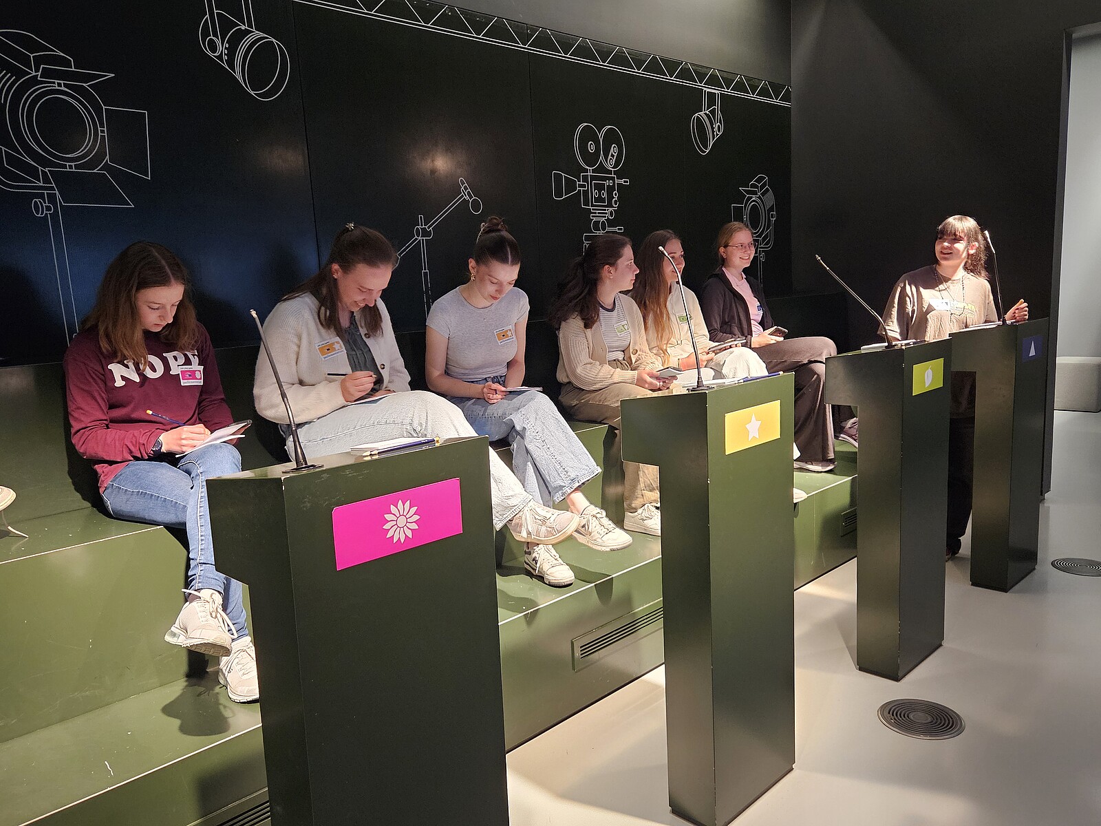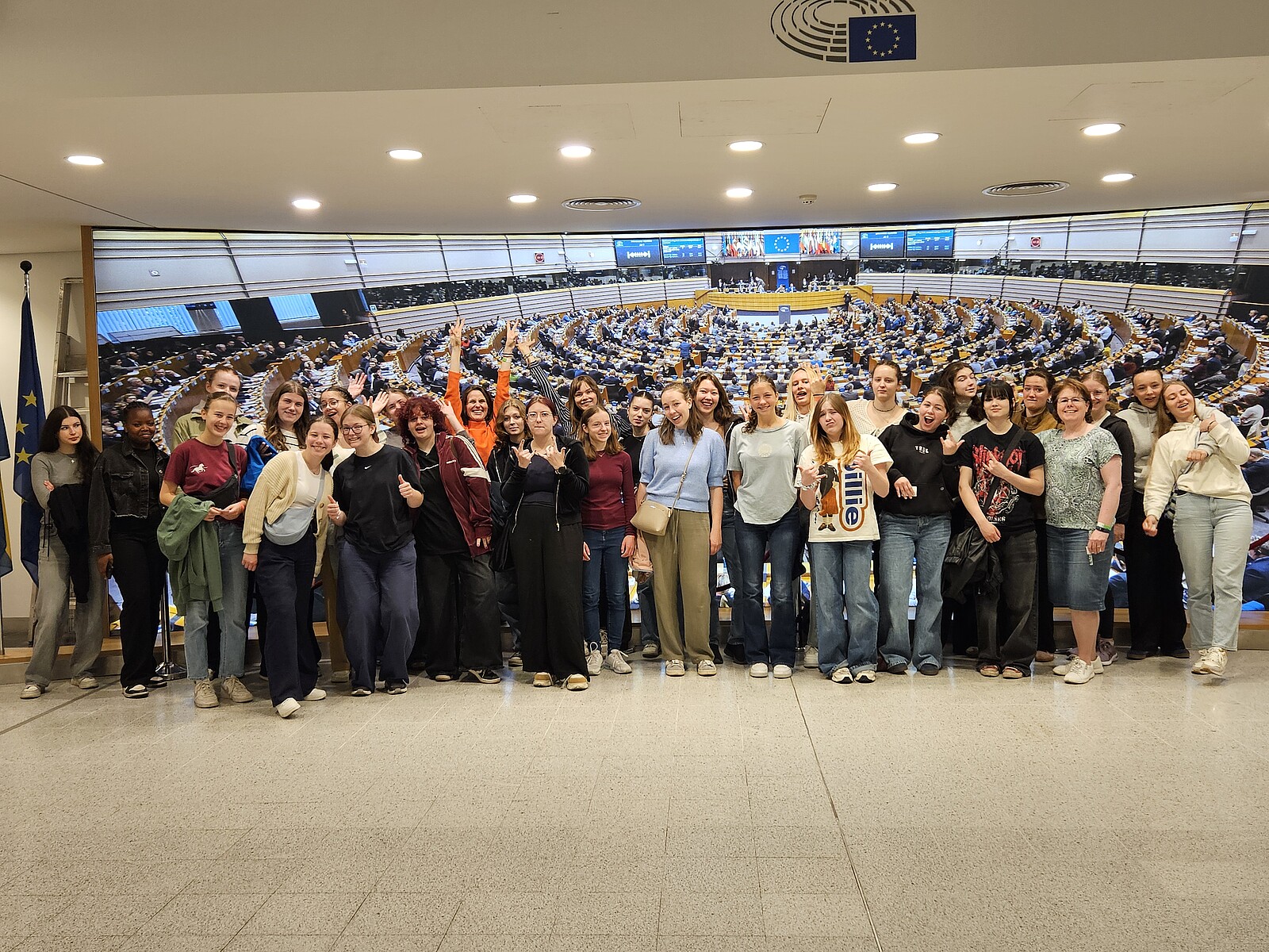 Der Termin für die Brüsselfahrt sollte erst ein ganzes Jahr nach der Münchenfahrt sein. Somit besuchten die Schülerinnen nun schon die 11. Klasse und konnten endlich – mit Unterstützung des vertieften PuG-Kurses der 12. Klasse - vom 01.-03.06.2025 mit Frau Hottner und Frau Dr. Kunert nach Brüssel fahren. Das Programm für die 30 Schülerinnen und zwei Lehrerinnen war sehr abwechslungsreich: Nach einer 11-stündigen Fahrt erkundeten alle die Innenstadt. Der Marktplatz gehört zu den schönsten Plätzen Europas. Der Montag, 02.06.2025, begann mit einer Stadtführung. Diese endete an der Europäischen Kommission, die anschließend besucht wurde. Zum Mittagessen waren alle Schülerinnen und Lehrerinnen in die Bayerische Vertretung in Brüssel eingeladen. Dort wurde die Arbeit der Bayerischen Vertretung vorgestellt und mit einem Quiz abgeprüft. Dabei zeigte sich erneut die hervorragende Vorbereitung durch die Politik-und-Gesellschafts-Lehrerinnen und -lehrer der 11. und 12. Klassen. Richtig politisch wurde es beim Role Play Game im Parlamentarium. Jede Schülerin wurde einer Partei zugeordnet und musste sich mit ihrer Fraktion beraten. Am Ende wurde über zwei Gesetze in zwei Lesungen abgestimmt. Das Ganze war sehr anspruchsvoll – wie im Parlament. An zwei Beispielszenarien lernten die Schülerinnen die politische Arbeit im Europaparlament kennen. Nach dem Rollenspiel hatten alle noch freie Zeit in der Innenstadt.
