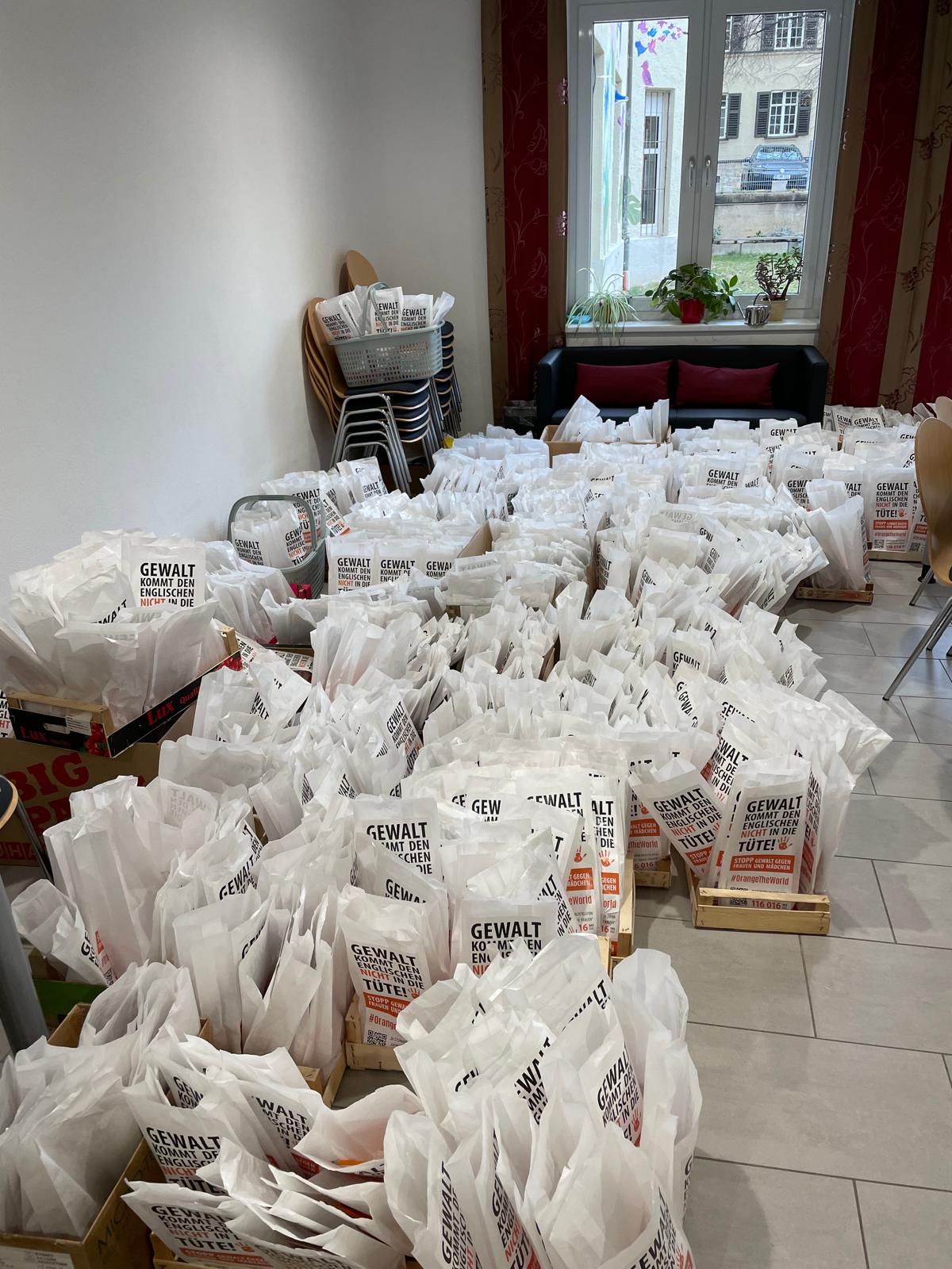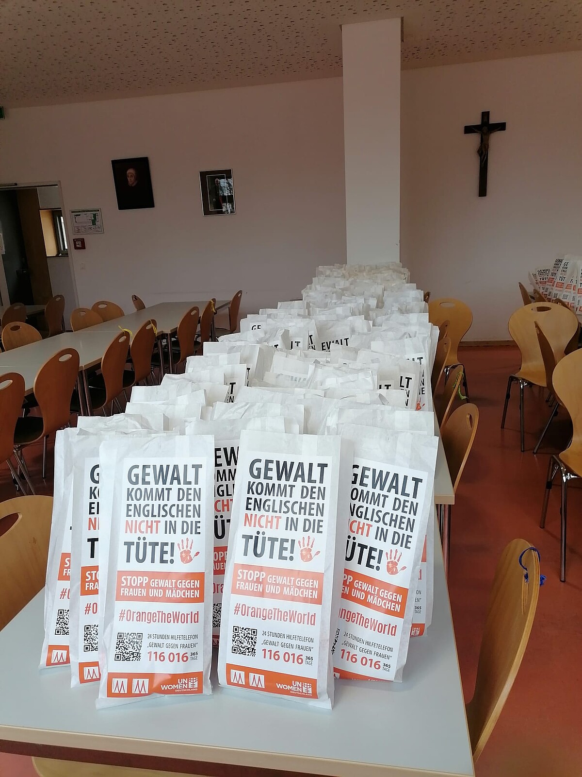 Für den Aktionstag haben die fleißigen Mitglieder des Förderkreises 1.100 Tüten gepackt, denn "Gewalt kommt den Englischen nicht in die Tüte!". Diese werden am 25.11.25 an die Schülerinnen der St. Marien-Schulen verteilt.