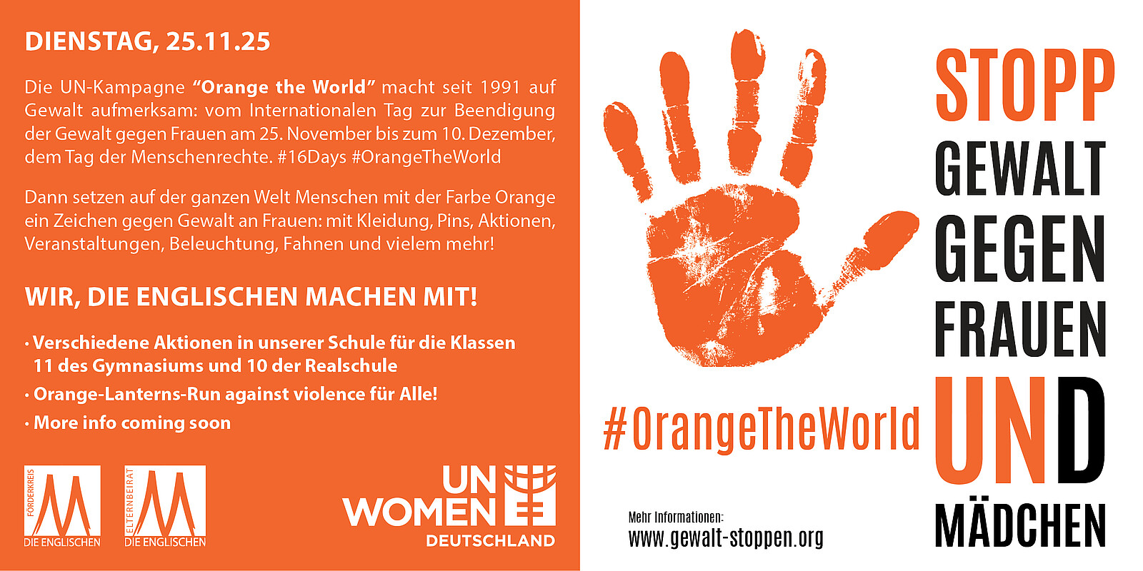 Dann setzen auf der ganzen Welt Menschen mit der Farbe Orange ein Zeichen gegen Gewalt an Frauen: mit Kleidung, Pins, Aktionen, Veranstaltungen, Beleuchtung, Fahnen und vielem mehr!