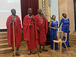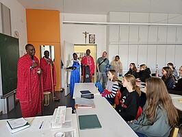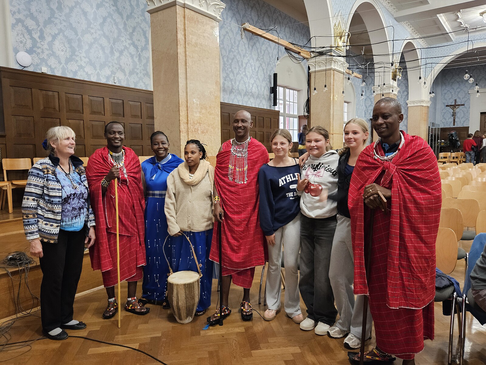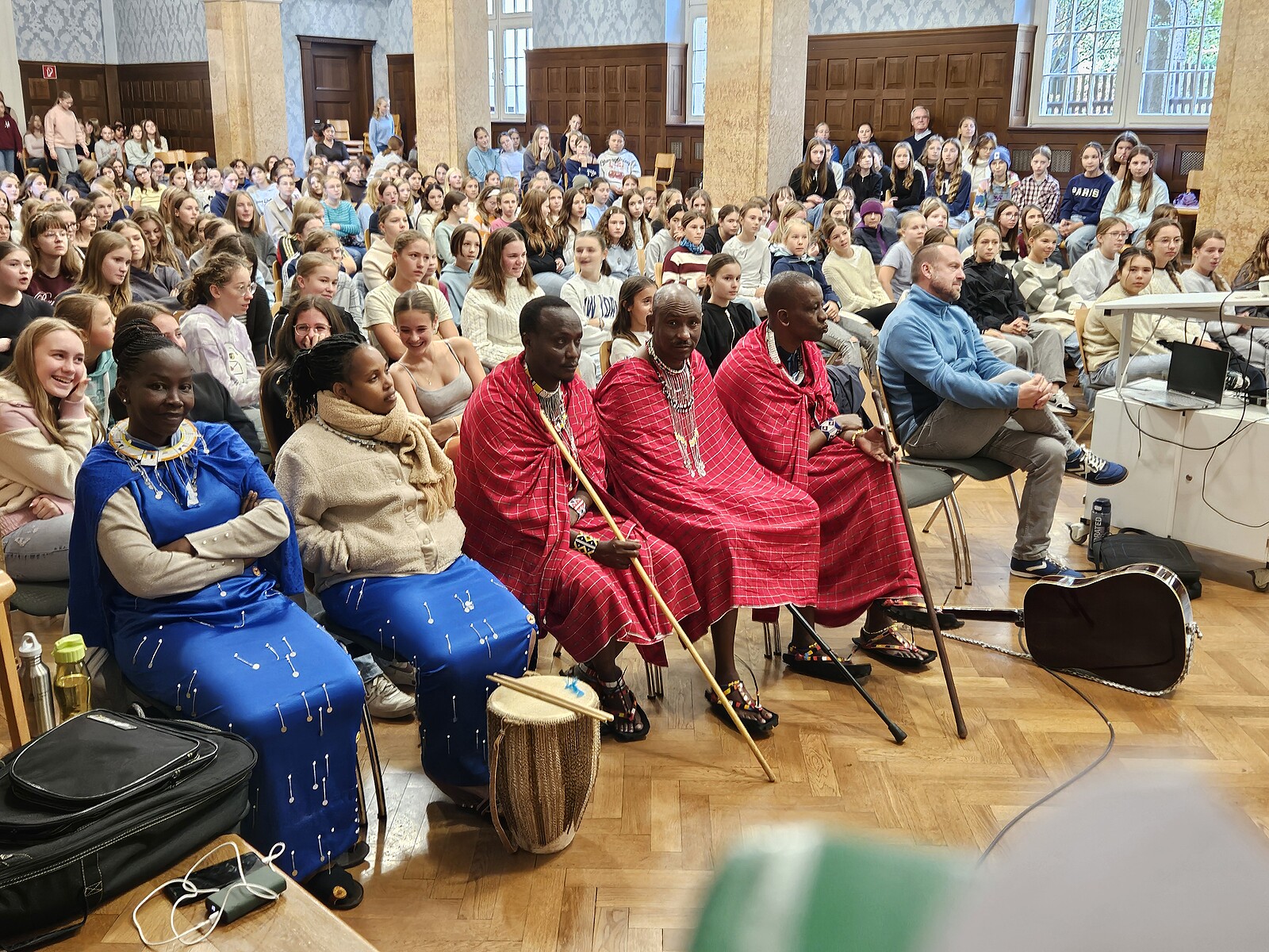 „Ich habe mich wie in Afrika gefühlt!“, so beschrieb eine Schülerin der 8. Jahrgangsstufe den Besuch von fünf Massai am 02.10.2025 an unserer Schule. Begleitet wurden die traditionell gekleideten Massai von „Mama Massai“ Angelika Wohlenberg-Kinsey und Dirk Frykowski. Alle sieben Gäste erzählten von ihrem Leben in Tansania, berichteten von ihrem Alltag und ihren Familien. Sie sangen traditionelle Lieder und tanzten dazu. So nah waren wir Afrika noch nie!
