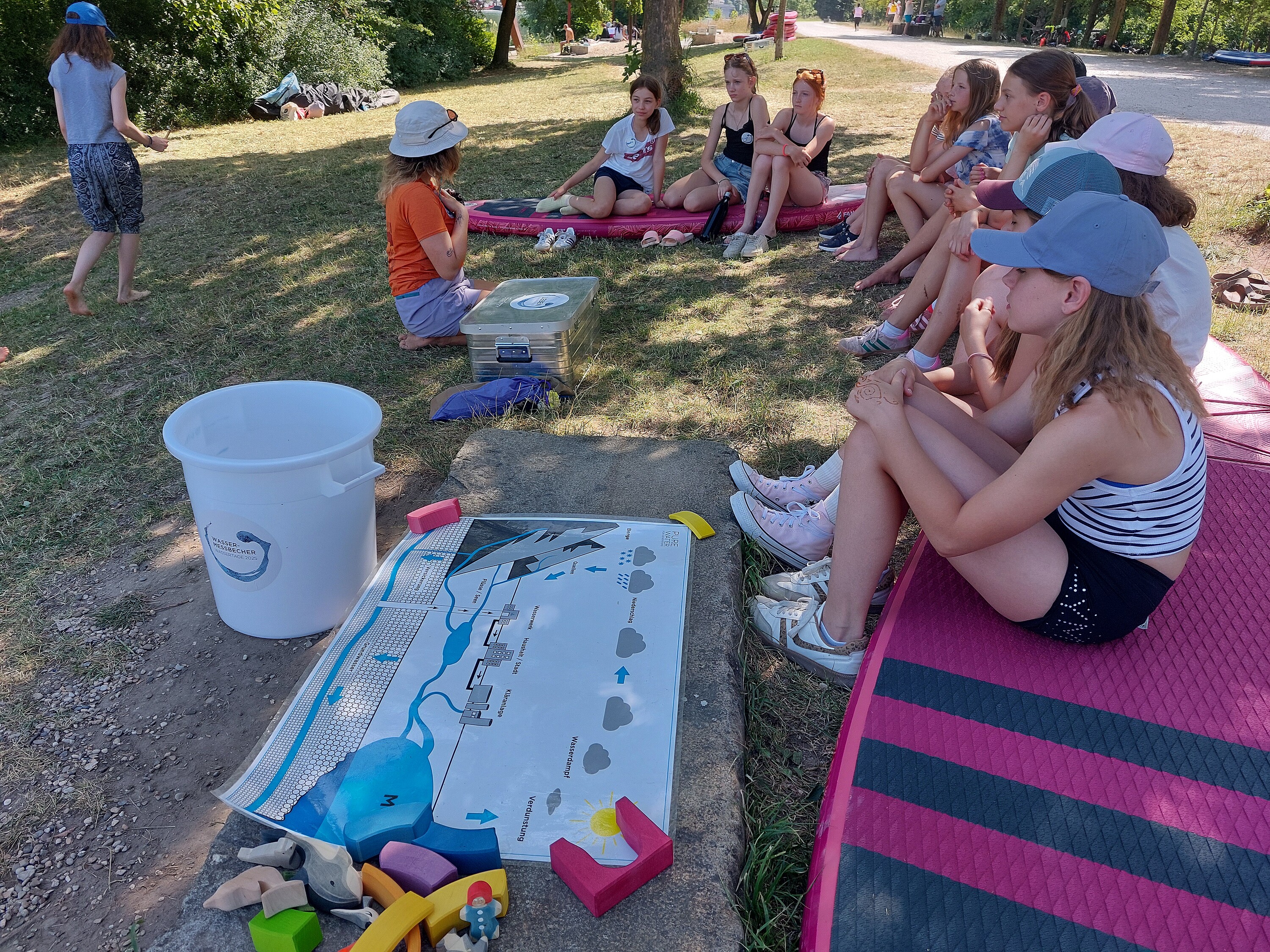 Bei bestem Sommerwetter machten sich die Klassen G 6A/B am 30. Juni auf den Weg zur Schillerwiese an der Donau. Dort hatte das Team des Bildungsprojekts „Pure Water for Generations e.V.“ bereits alles für uns vorbereitet: An vier Stationen sollten den Schülerinnen an diesem Tag nicht nur spannende Fakten über die Bedeutung von (sauberem) Wasser vermittelt wurden, sondern auch Achtsamkeit, Kreativität und das Erleben der Natur standen auf dem Programm. So wurde unter anderem im Rahmen einer kleinen Müllsammelaktion nicht nur ein Abschnitt des Donauufers von allerlei Unrat befreit – die Schülerinnen lernten dabei auch noch, wie lange es eigentlich dauert, bis sich verschiedene Dinge in der Umwelt auf natürliche Weise wieder zersetzt haben. Den Abschluss des Vormittags bildete eine Stand-Up-Paddling Ausfahrt, wobei wir die Donau noch einmal aus einer ganz anderen Perspektive erleben konnten.